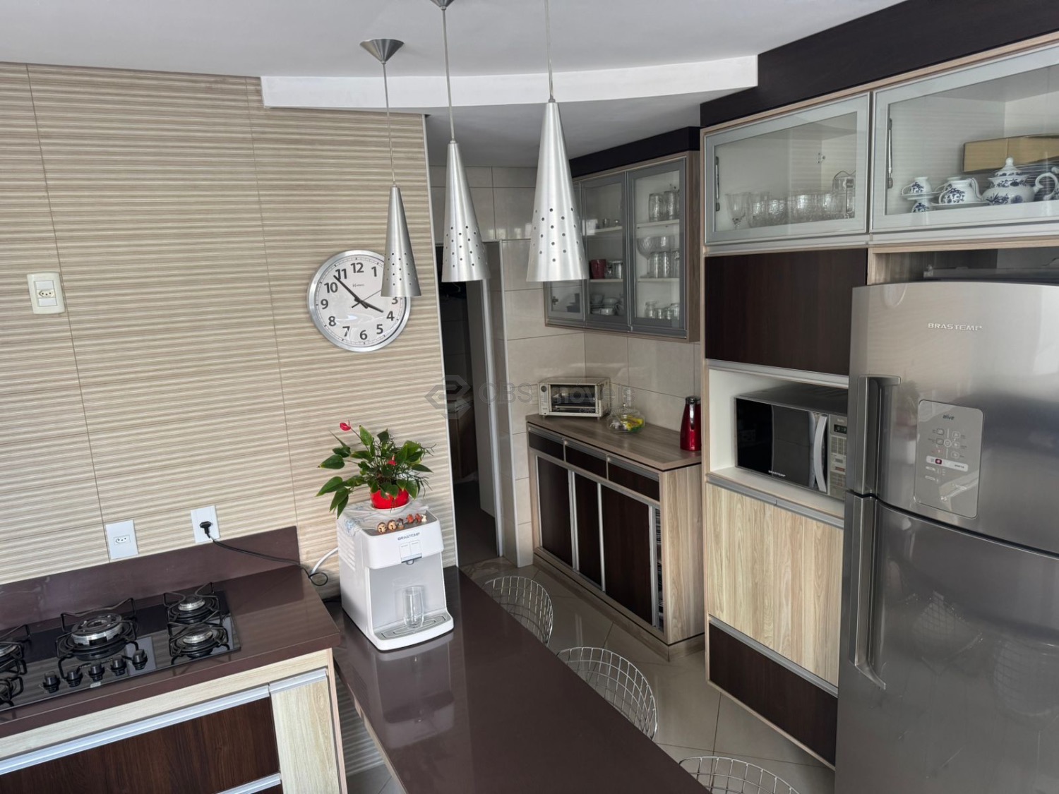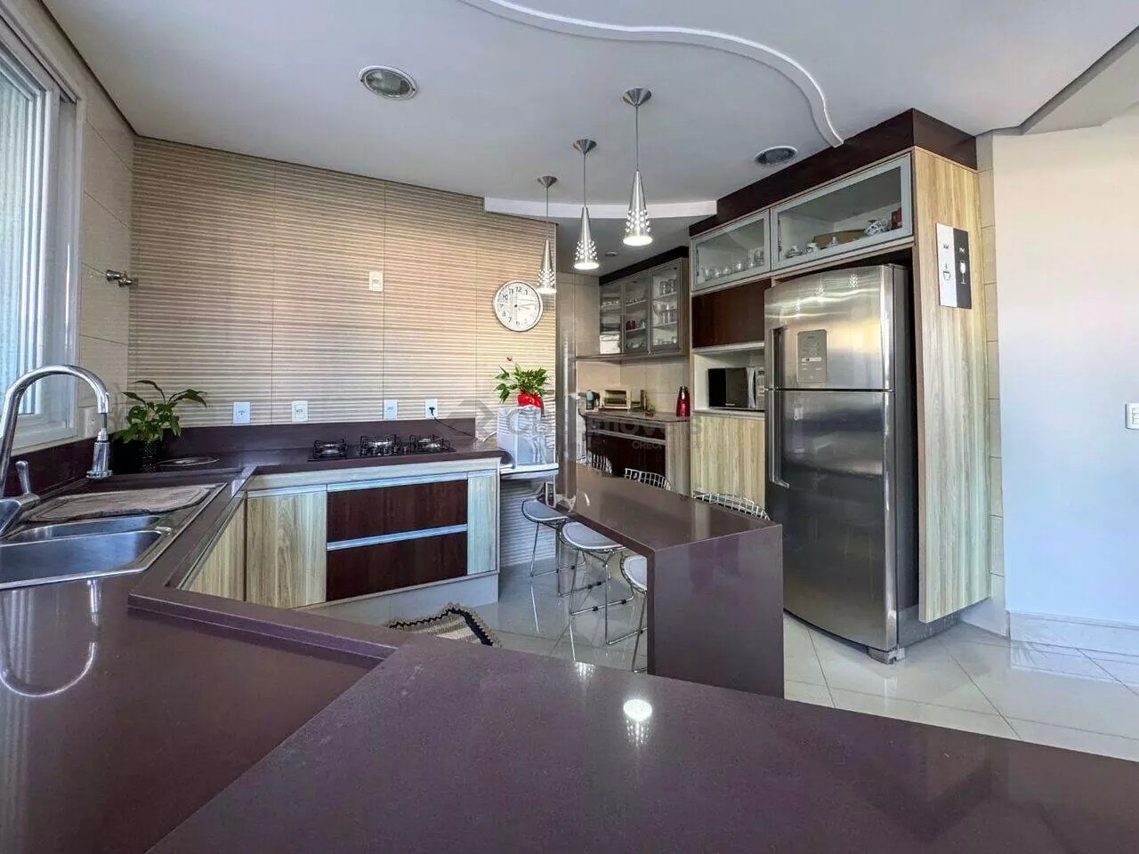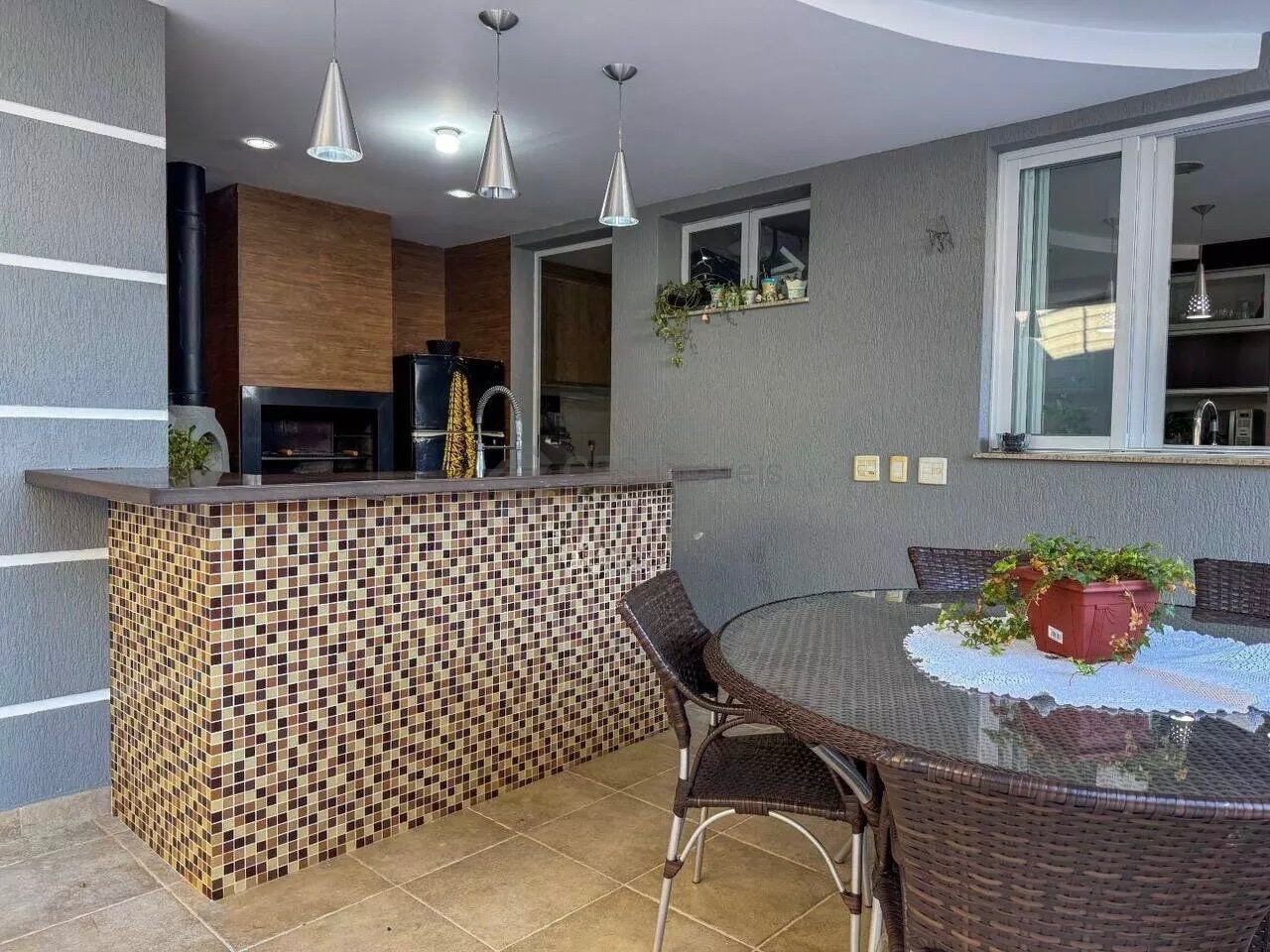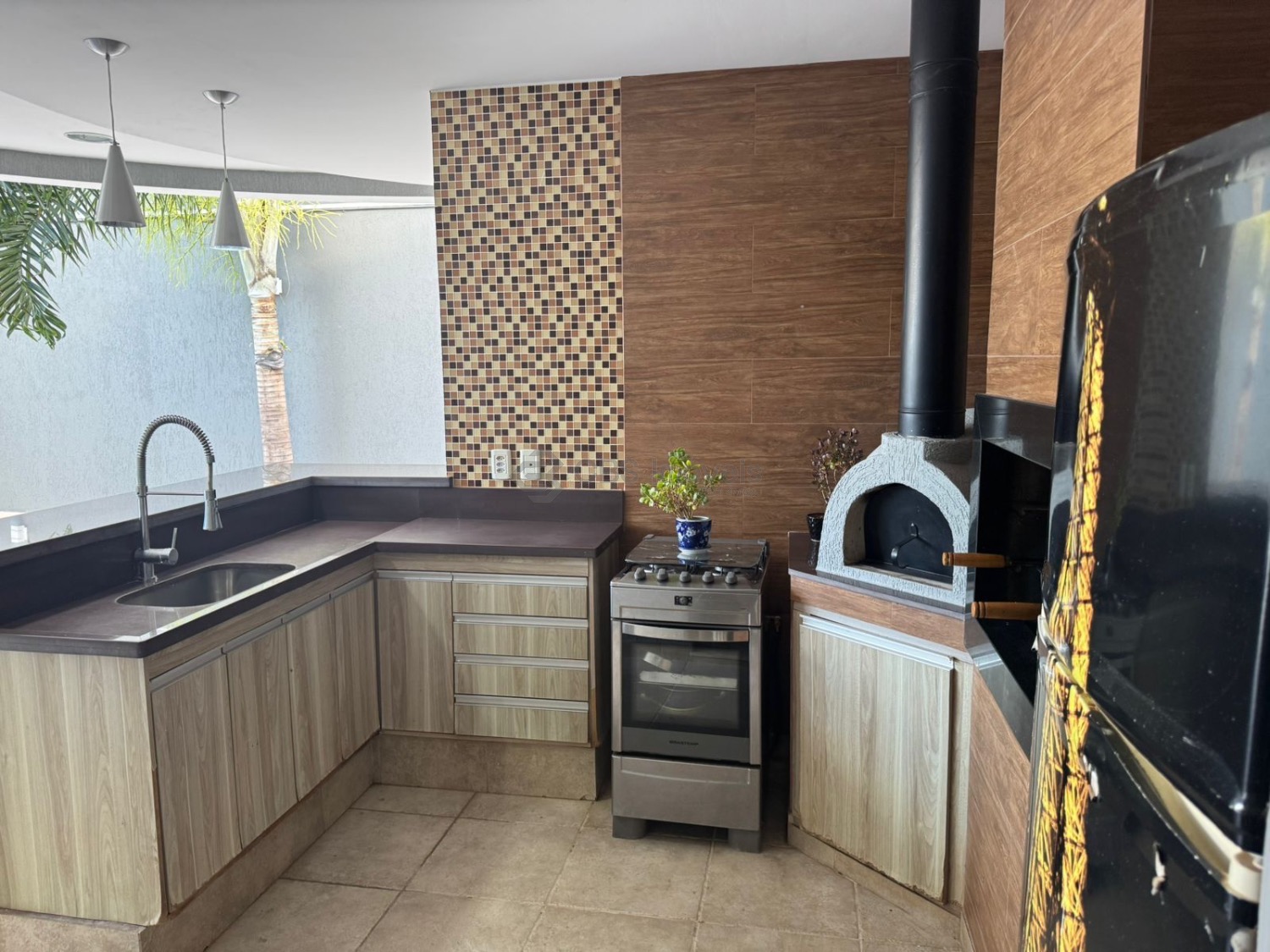 Cozinha americana integrada a sala de jantar e espaço gourmet que conta com forno a lenha e churrasqueira.