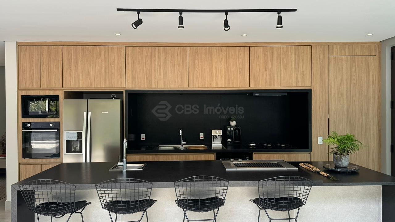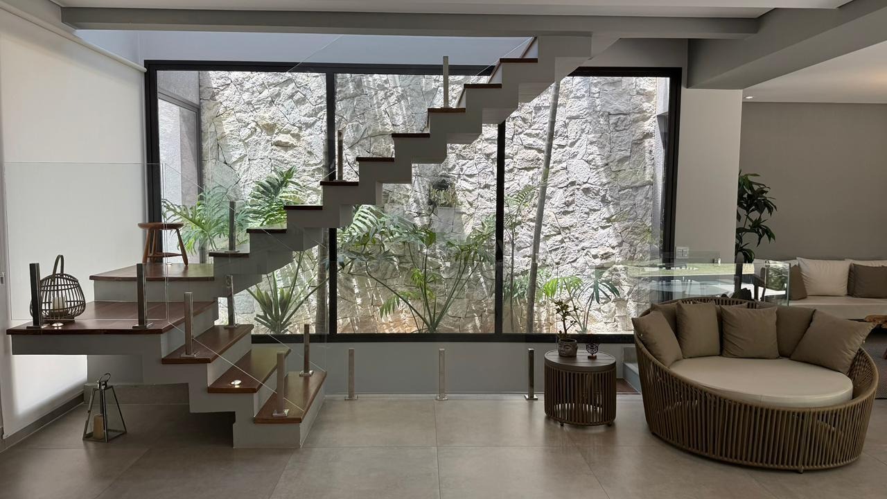 No térreo possui sala para 2 ambientes com pé direito duplo e muita integração. A cozinha é tipo americana completa com armários e ainda temos lavabo, lavanderia e garagem para 4 carros.