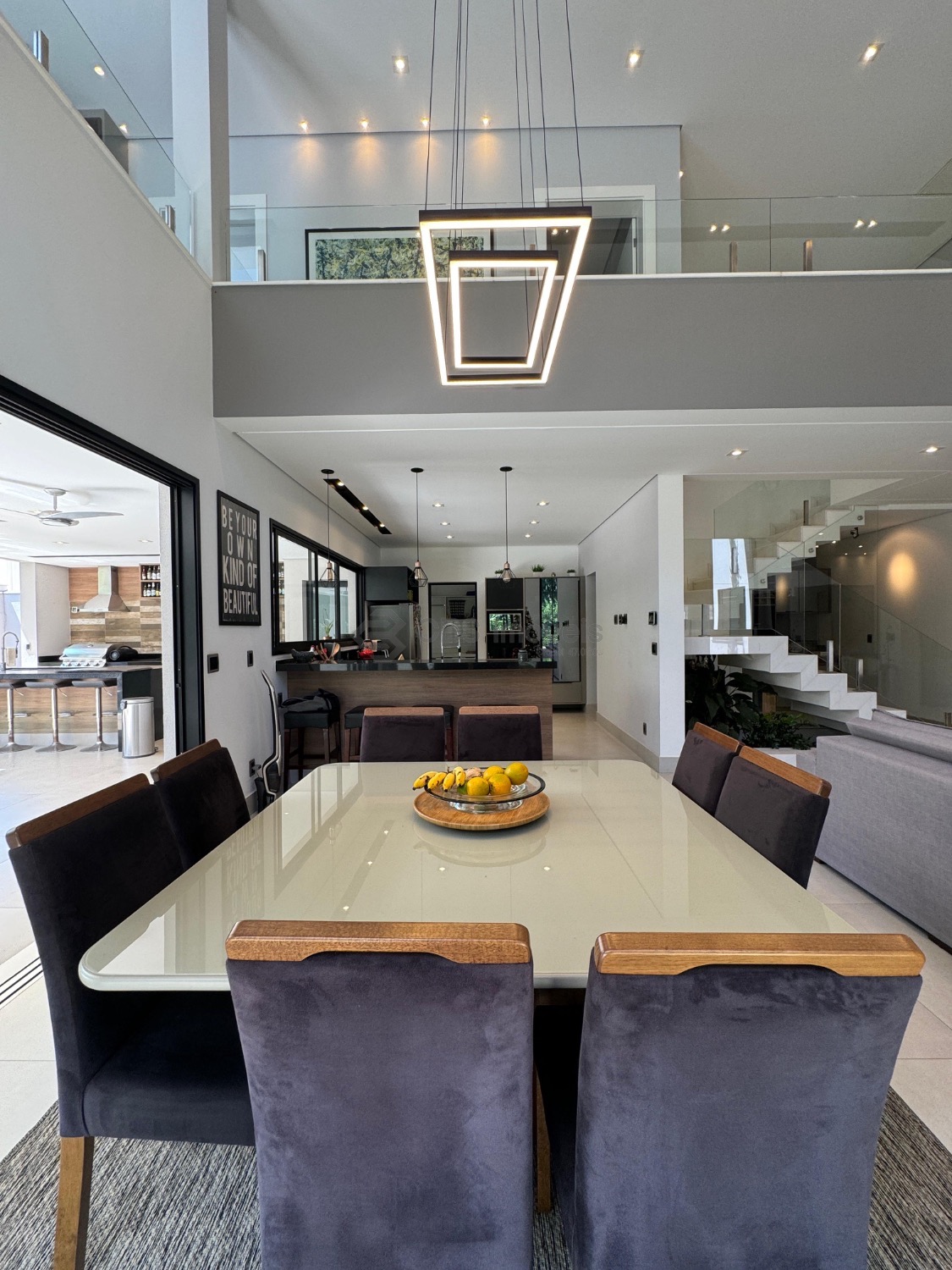Totalizando 411m² de área construída, escritório planejado no andar superior com vista para mata, com móveis e eletrodomésticos embutidos.