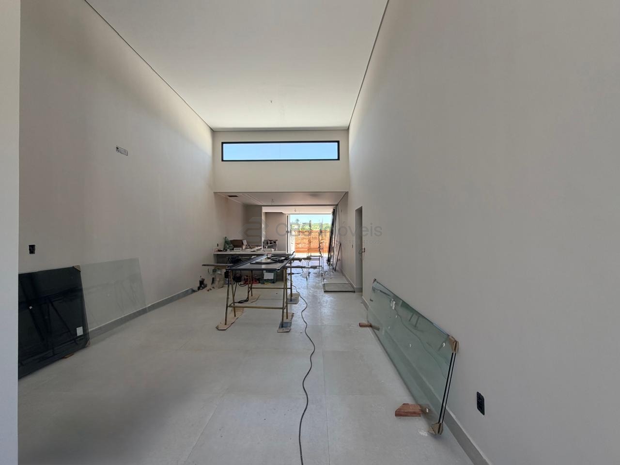 Sala com pé direito duplo para 2 ambientes, escritório e lavabo.
