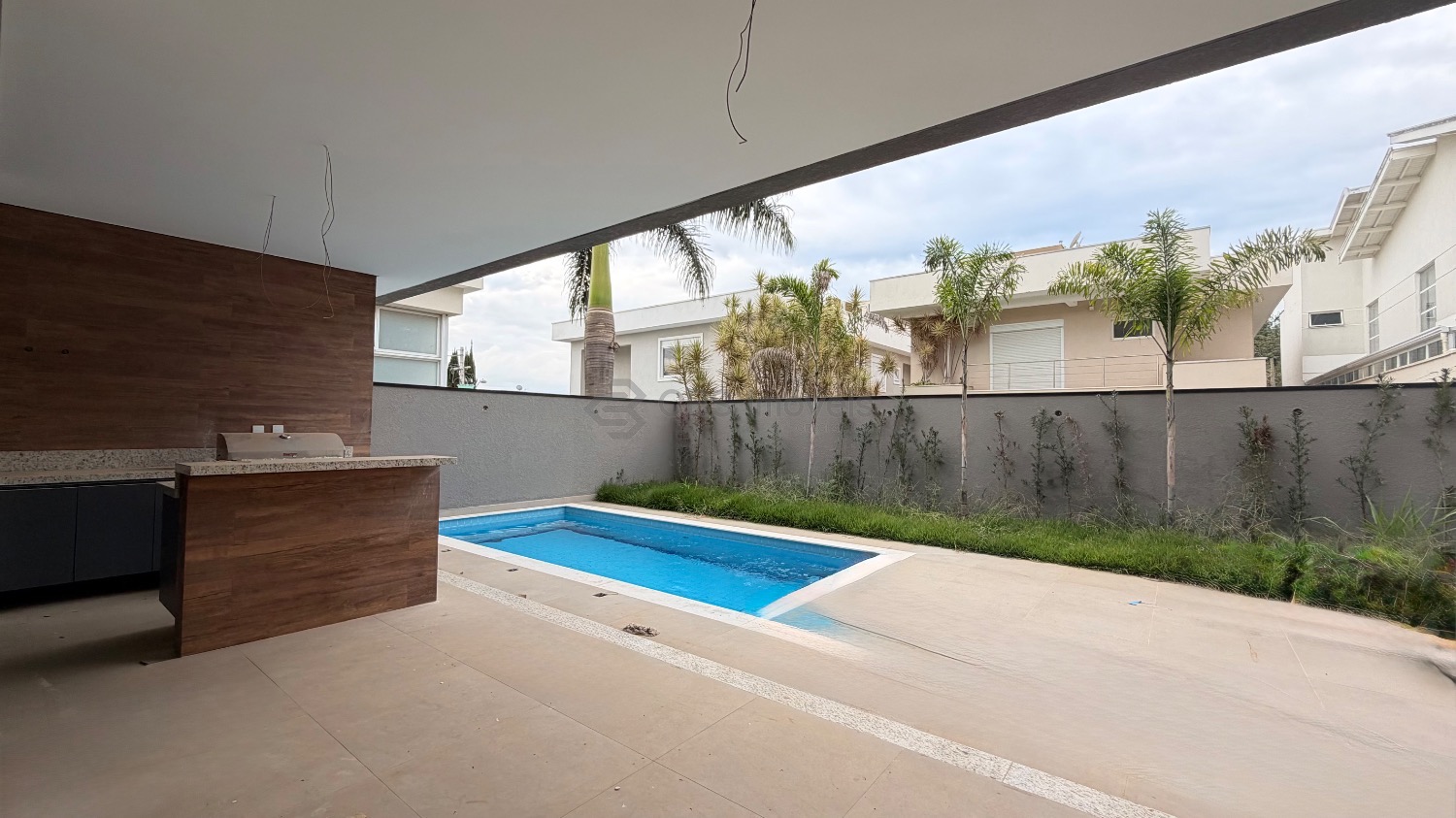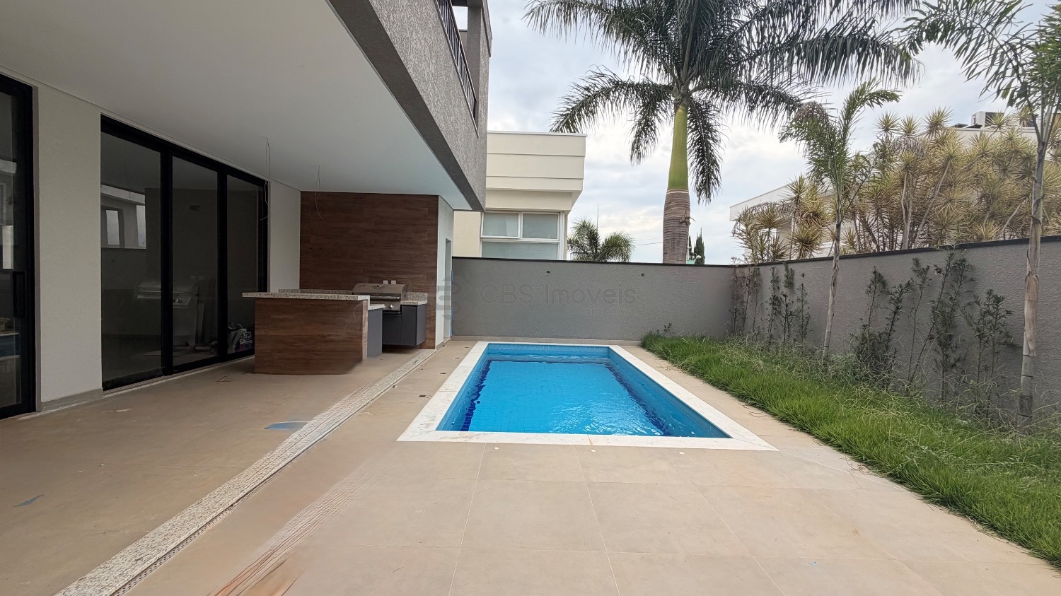 O lazer é completo com churrasqueira, piscina, banheiro de apoio, quintal com gramado.