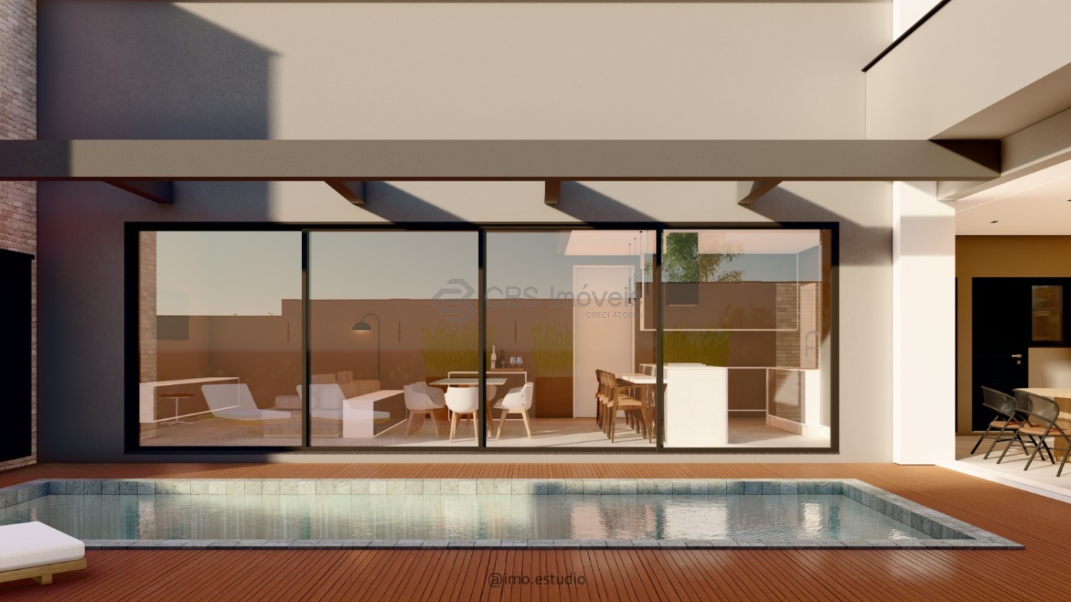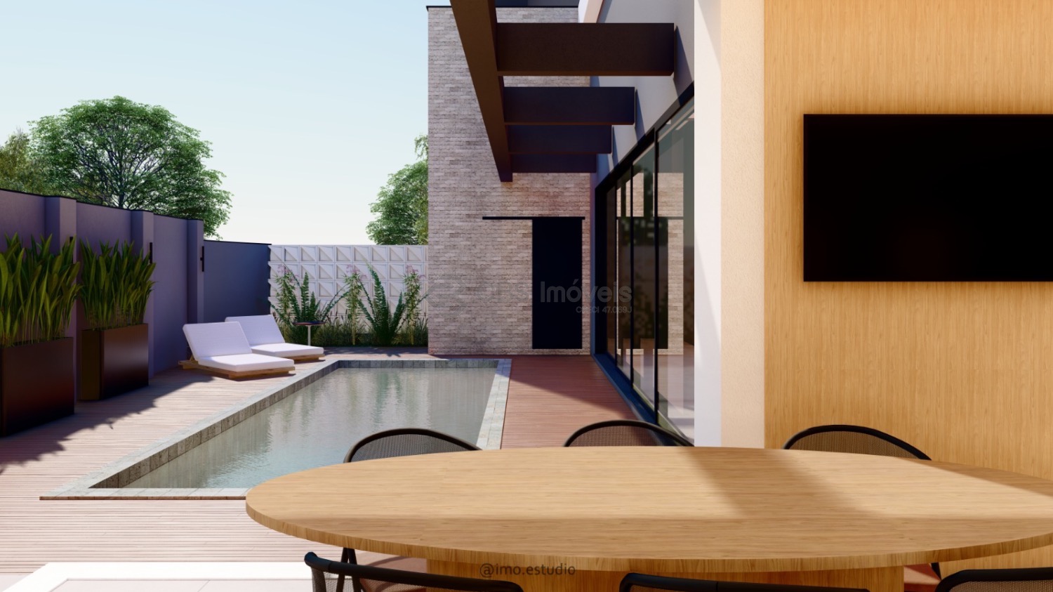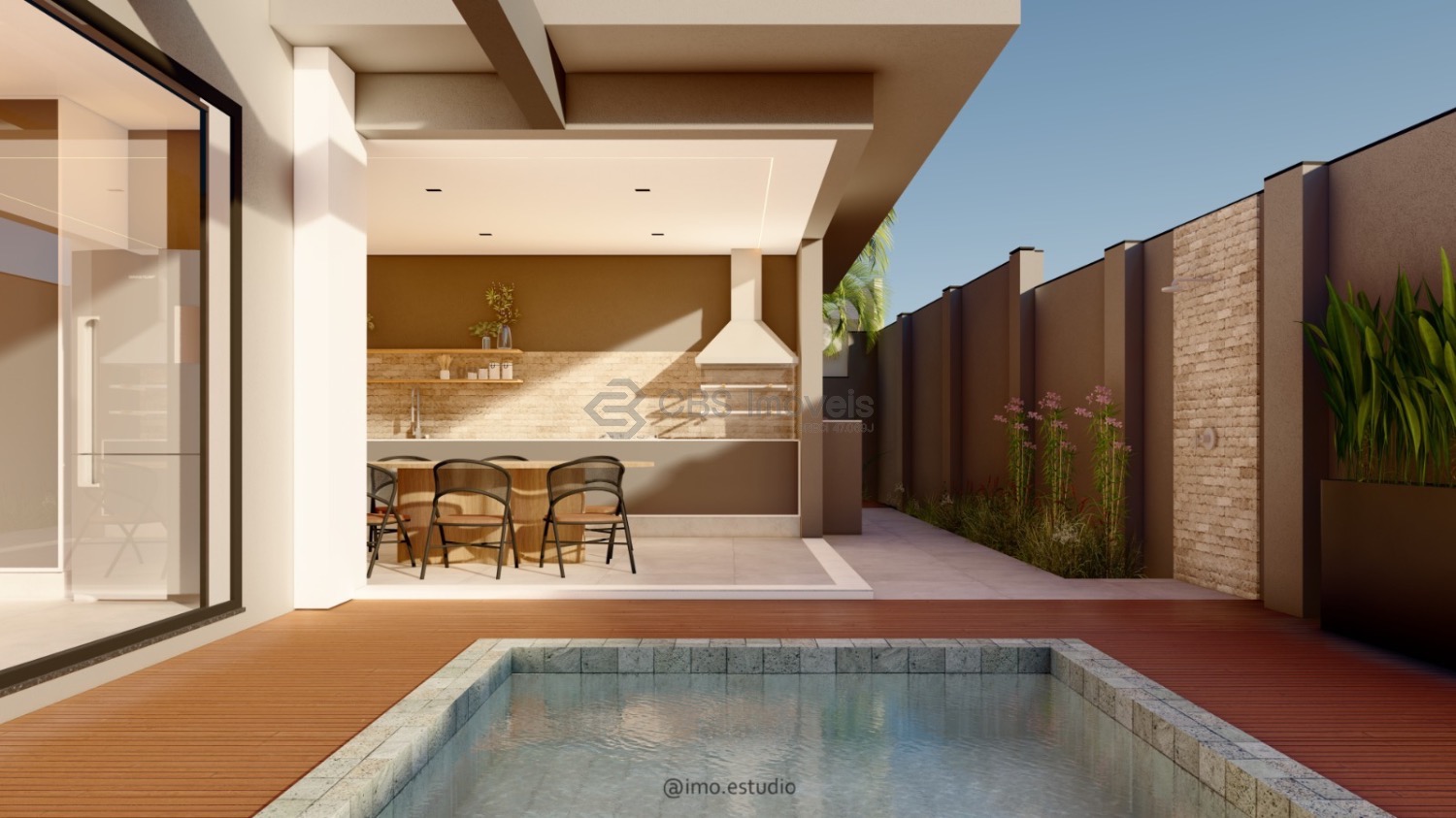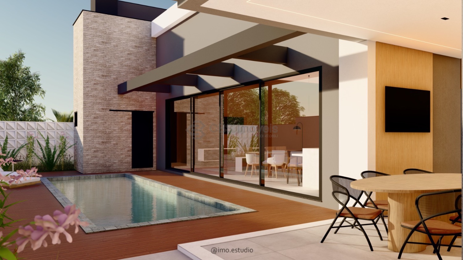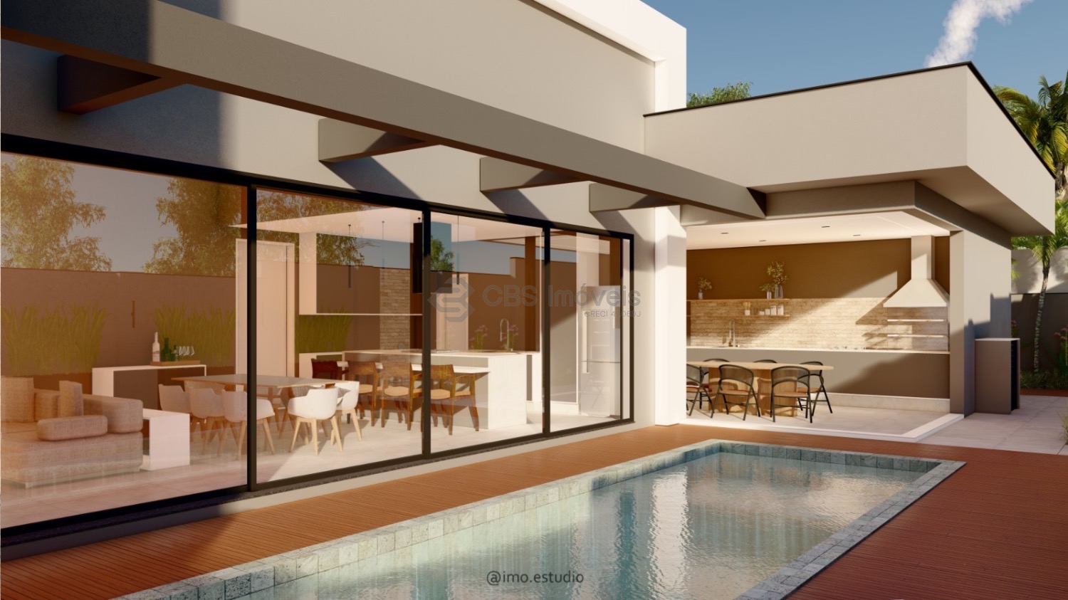 O lazer é completo com gourmet com churrasqueira, piscina, quintal, gramado e deck.