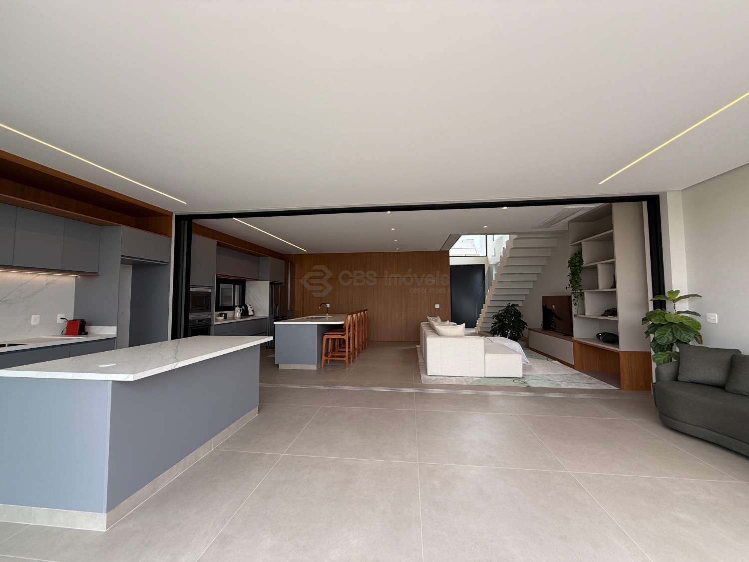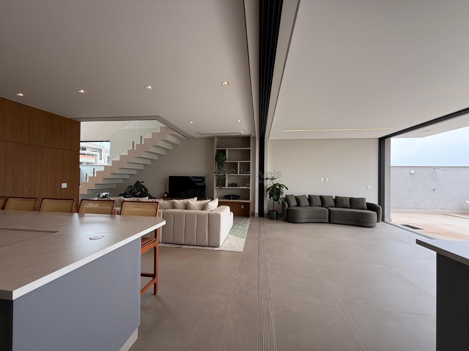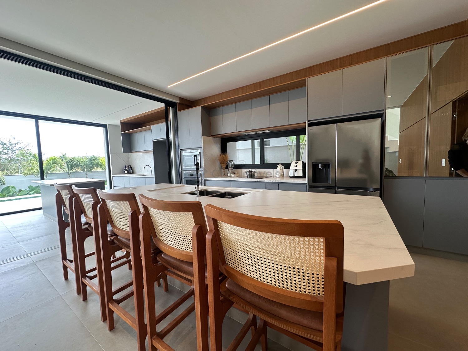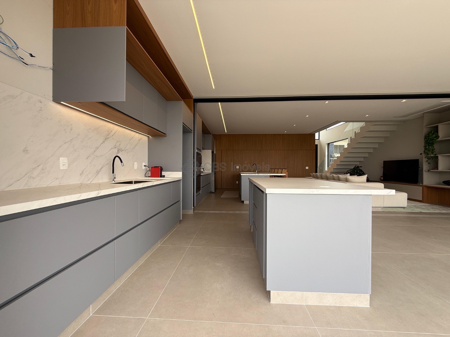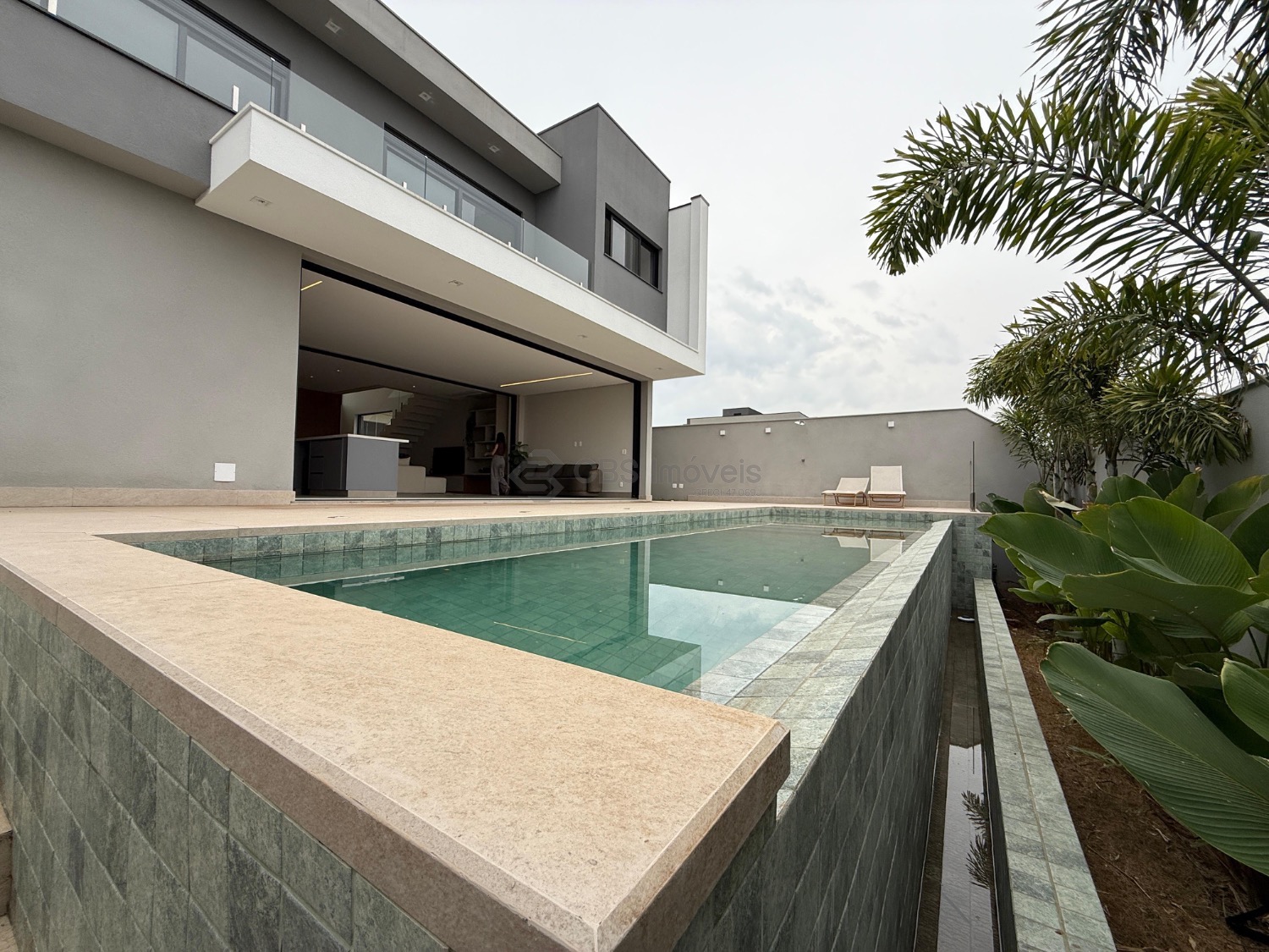 No térreo possui sala de estar e jantar, escritório, lavabo, cozinha americana com torre quente. Área gourmet com ponto para churrasqueira, a área gourmet possui porta de correr para divisão dos ambientes podendo deixar integrada ou fechada. A cassa possui um amplo quintal, Piscina com borda infinita, tendo vista para área de preservação do condomínio. Ainda no térreo possui área de serviço, despensa, banheiro de apoio para piscina e deposito.