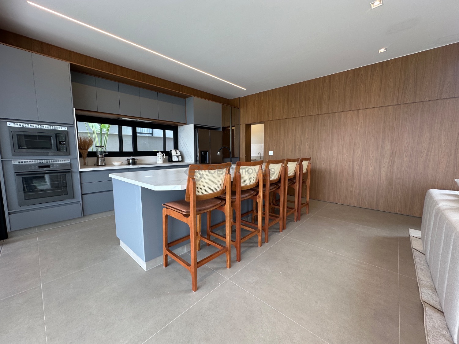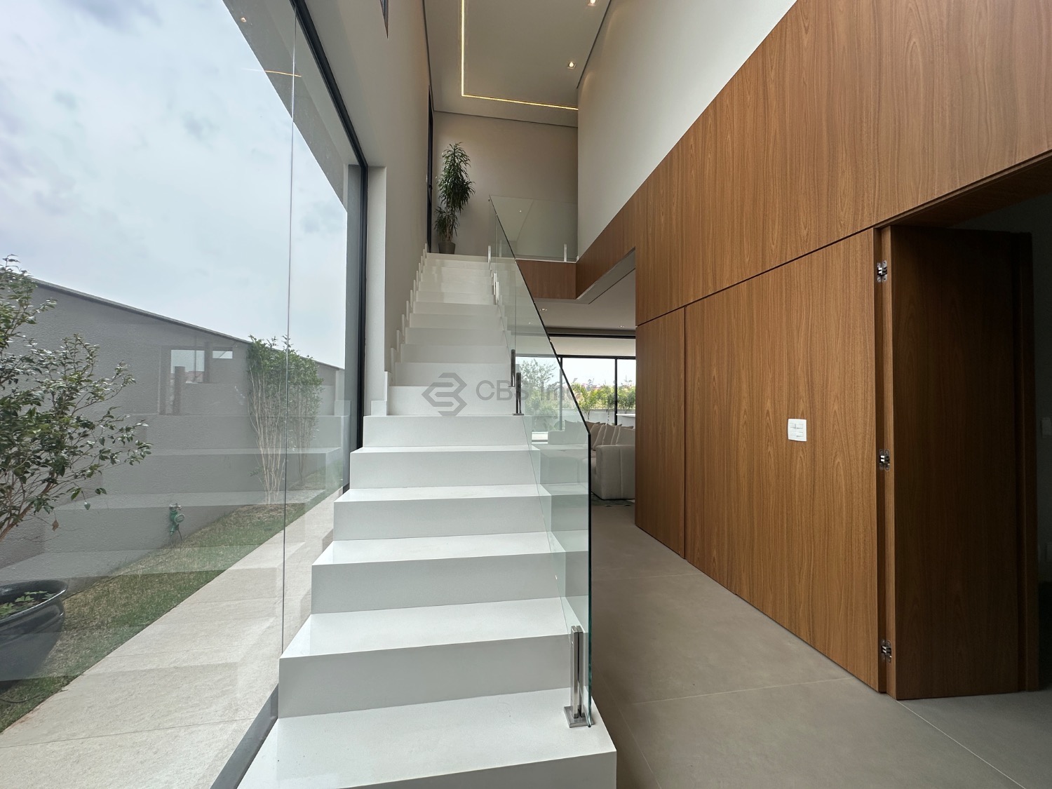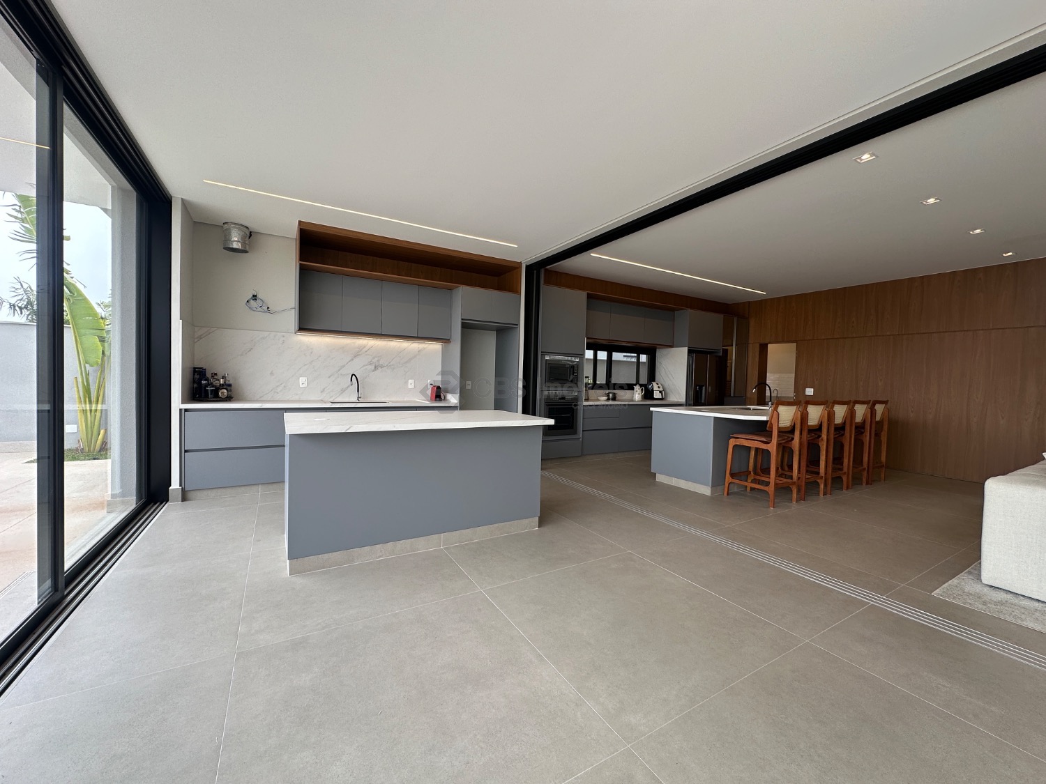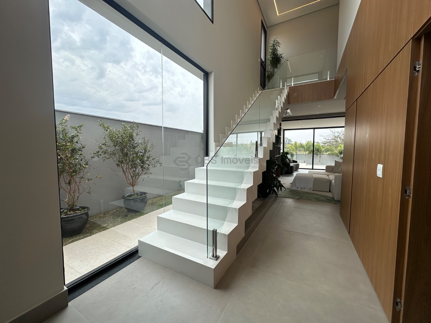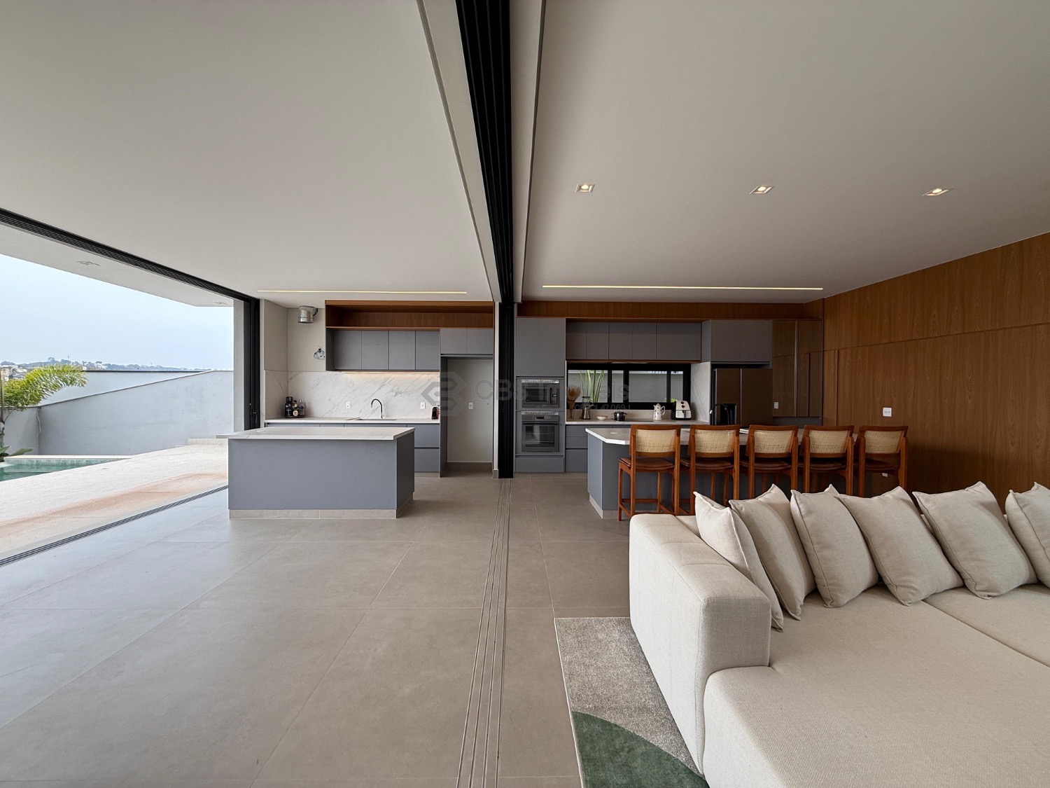 No térreo possui sala de estar e jantar, escritório, lavabo, cozinha americana com torre quente. Área gourmet com ponto para churrasqueira, a área gourmet possui porta de correr para divisão dos ambientes podendo deixar integrada ou fechada. A cassa possui um amplo quintal, Piscina com borda infinita, tendo vista para área de preservação do condomínio. Ainda no térreo possui área de serviço, despensa, banheiro de apoio para piscina e deposito.