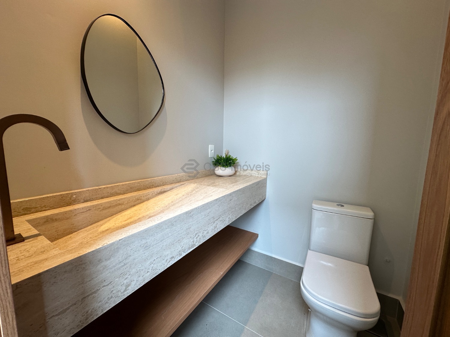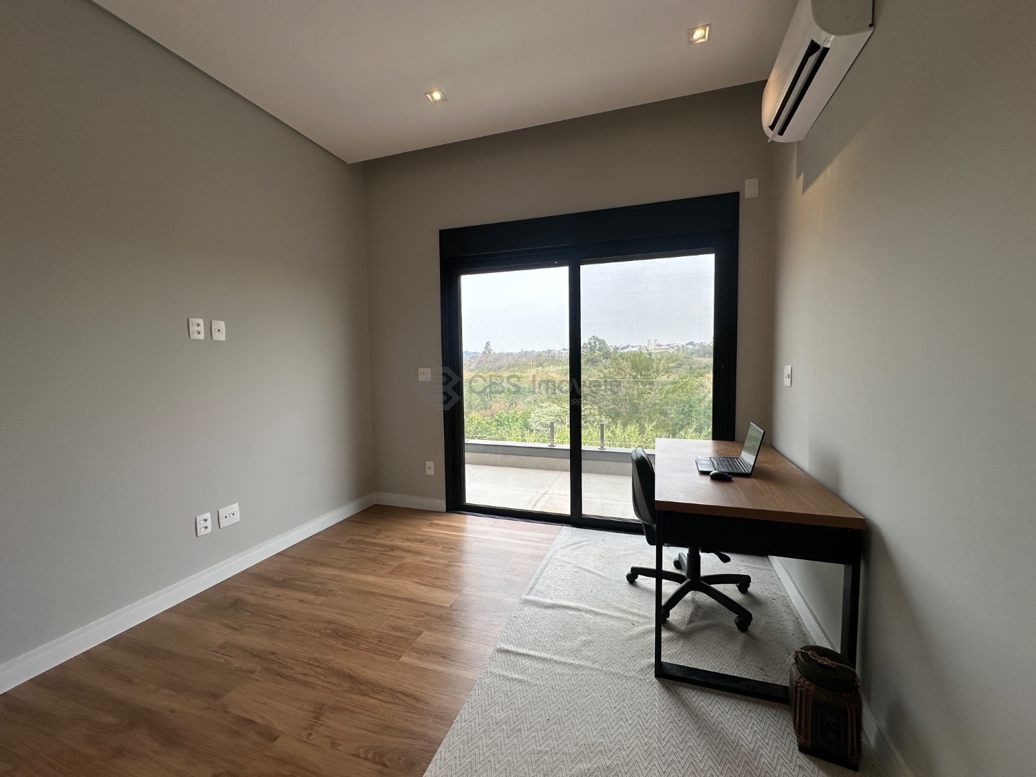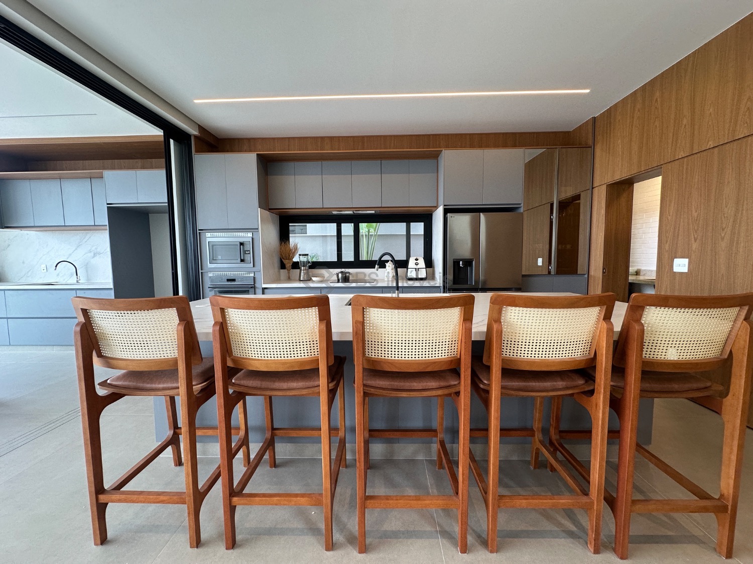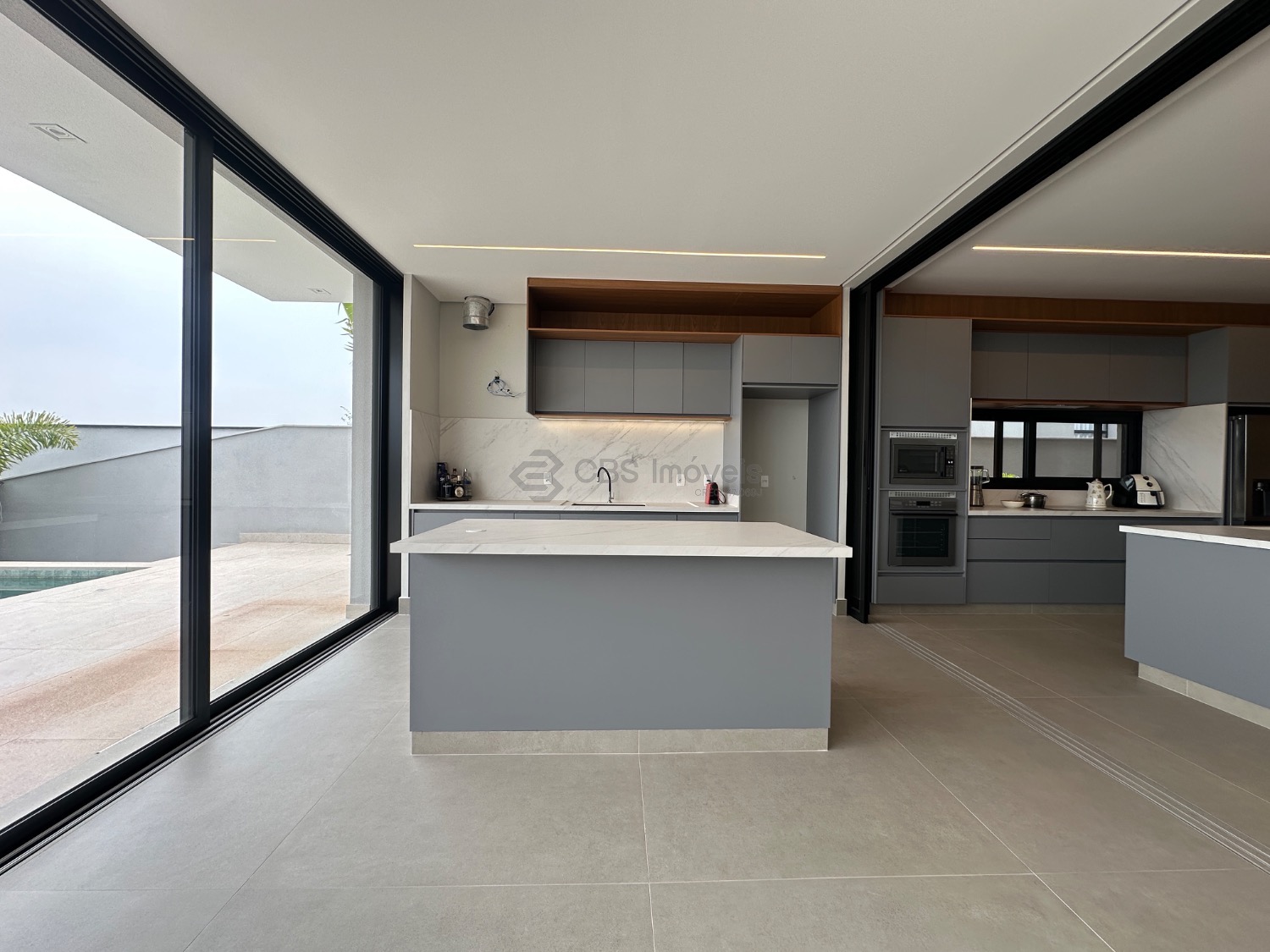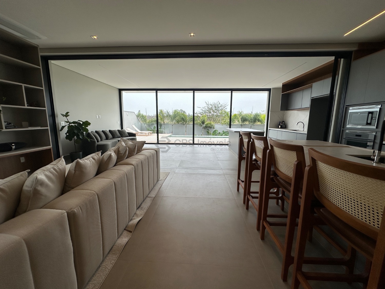 No térreo possui sala de estar e jantar, escritório, lavabo, cozinha americana com torre quente. Área gourmet com ponto para churrasqueira, a área gourmet possui porta de correr para divisão dos ambientes podendo deixar integrada ou fechada. A cassa possui um amplo quintal, Piscina com borda infinita, tendo vista para área de preservação do condomínio. Ainda no térreo possui área de serviço, despensa, banheiro de apoio para piscina e deposito.