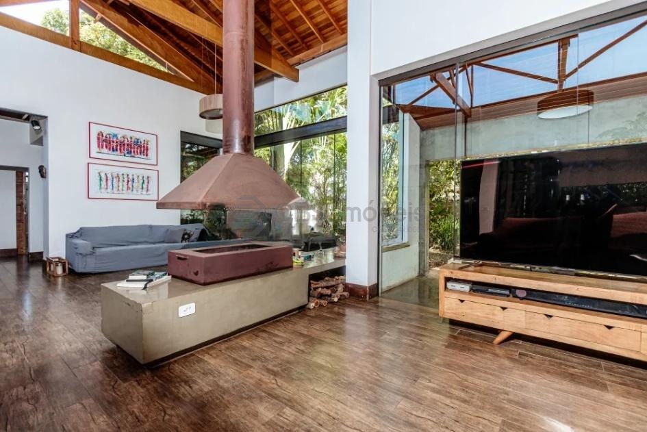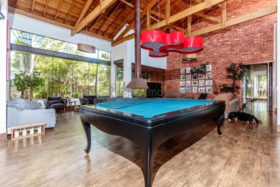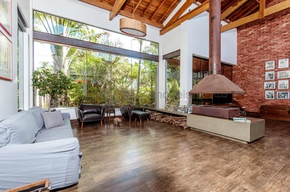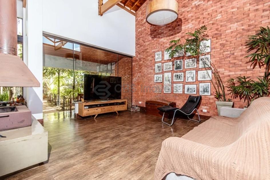Sala de estar ampla, dividida em 3 ambientes e com pé-direito duplo;