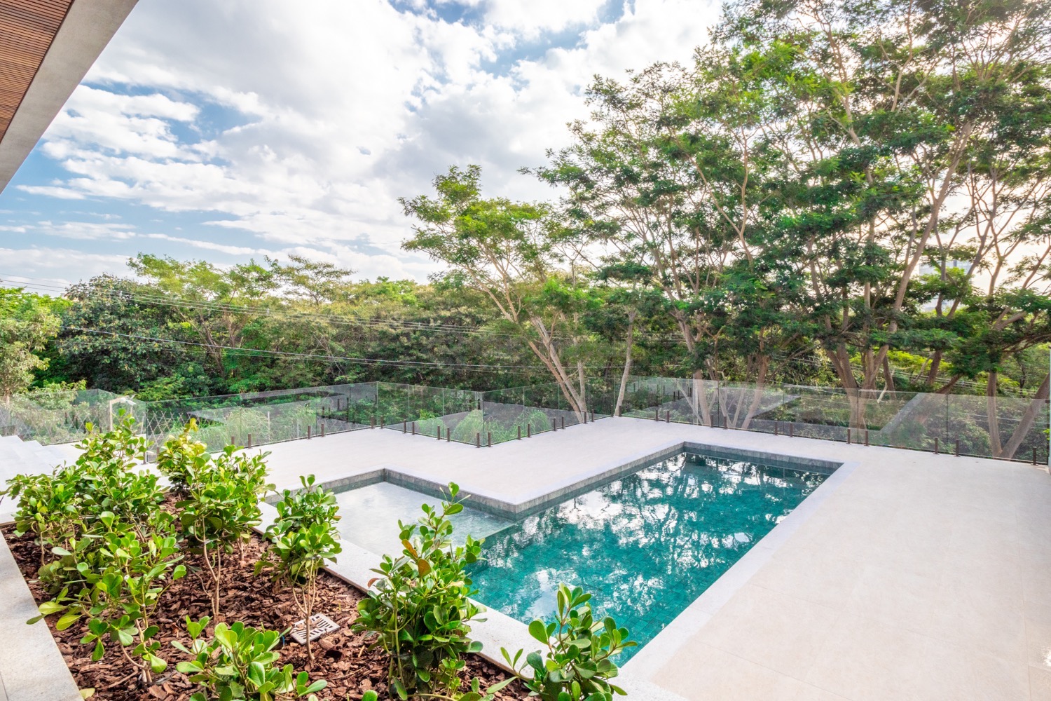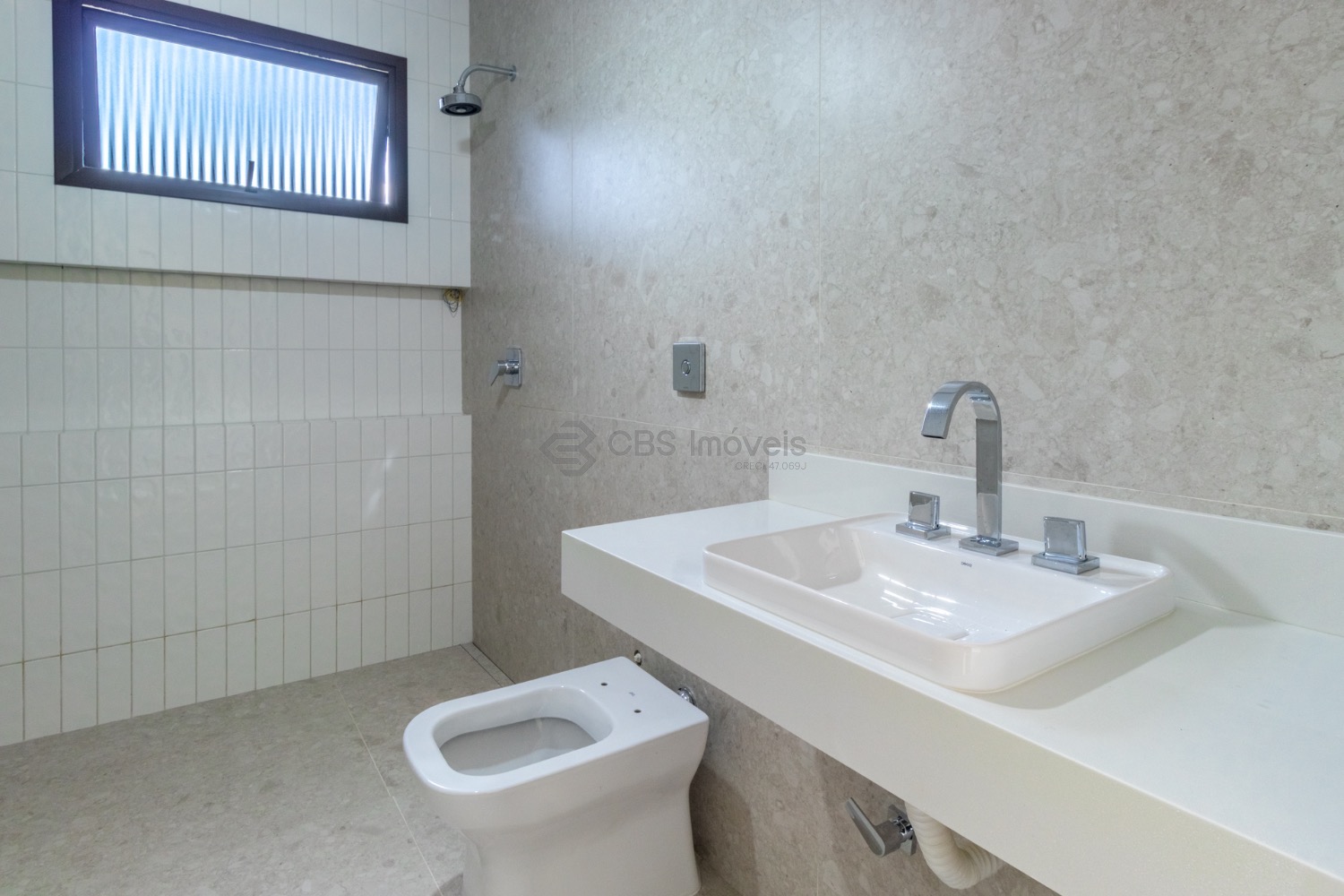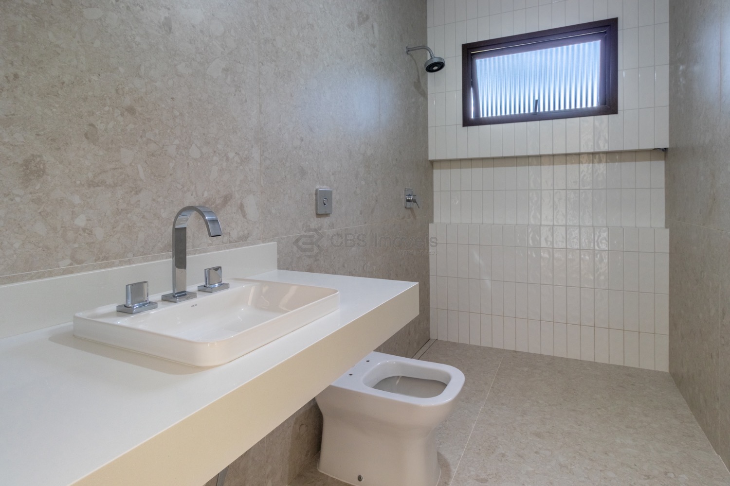 No pavimento inferior, a casa dispõe de quatro suítes, todas com varanda, lavabo, living integrado com home theater, sala de jantar e sala de estar, cozinha, área gourmet, despensa, lavanderia, suíte de serviços e um quintal com piscina, ideal para momentos de lazer.
