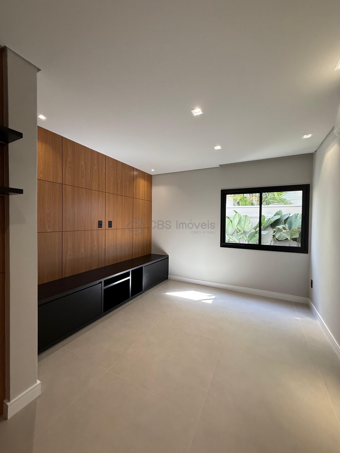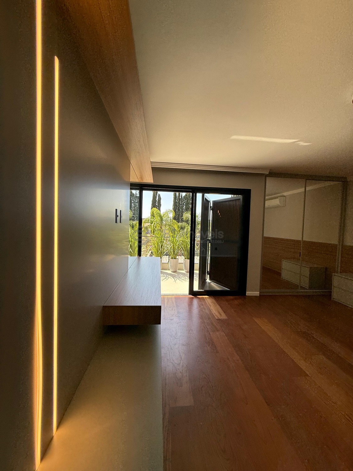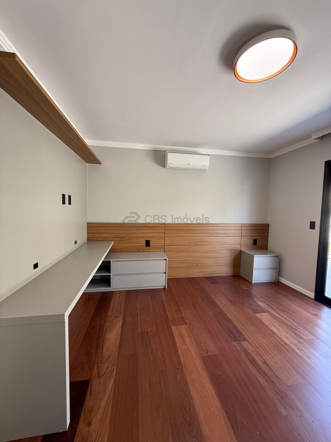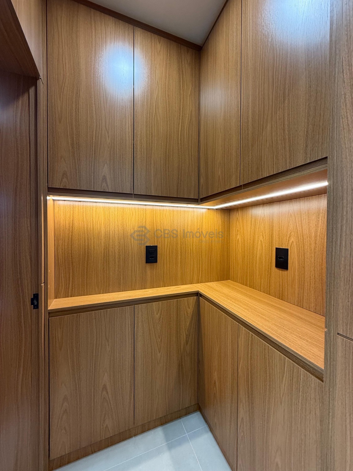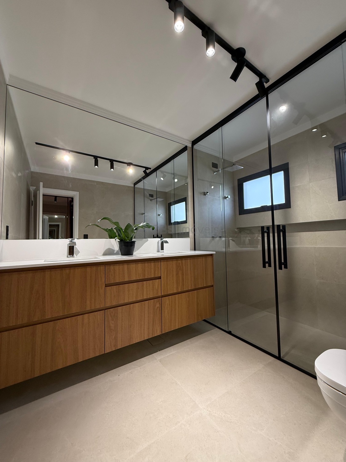 O imóvel dispõe de 4 suítes, sendo uma térrea e três no pavimento superior, todas com armários planejados. A suíte master é um verdadeiro refúgio, com closet espelhado em vidro refletivo bronze, proporcionando sofisticação e amplitude.