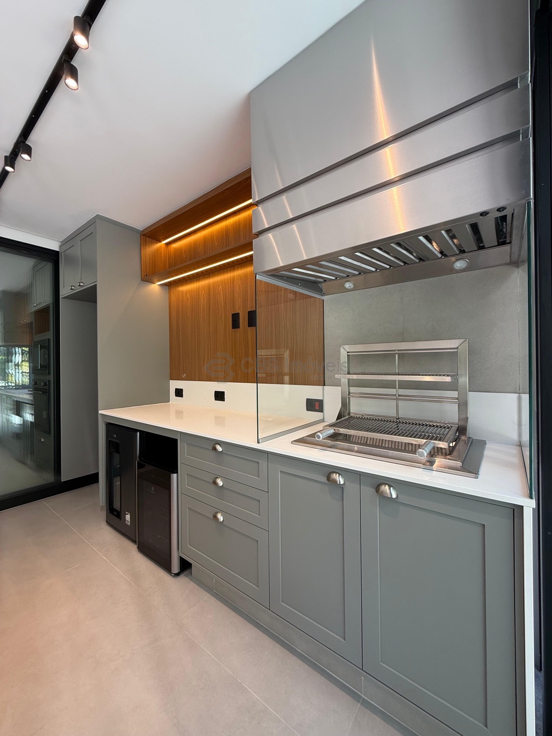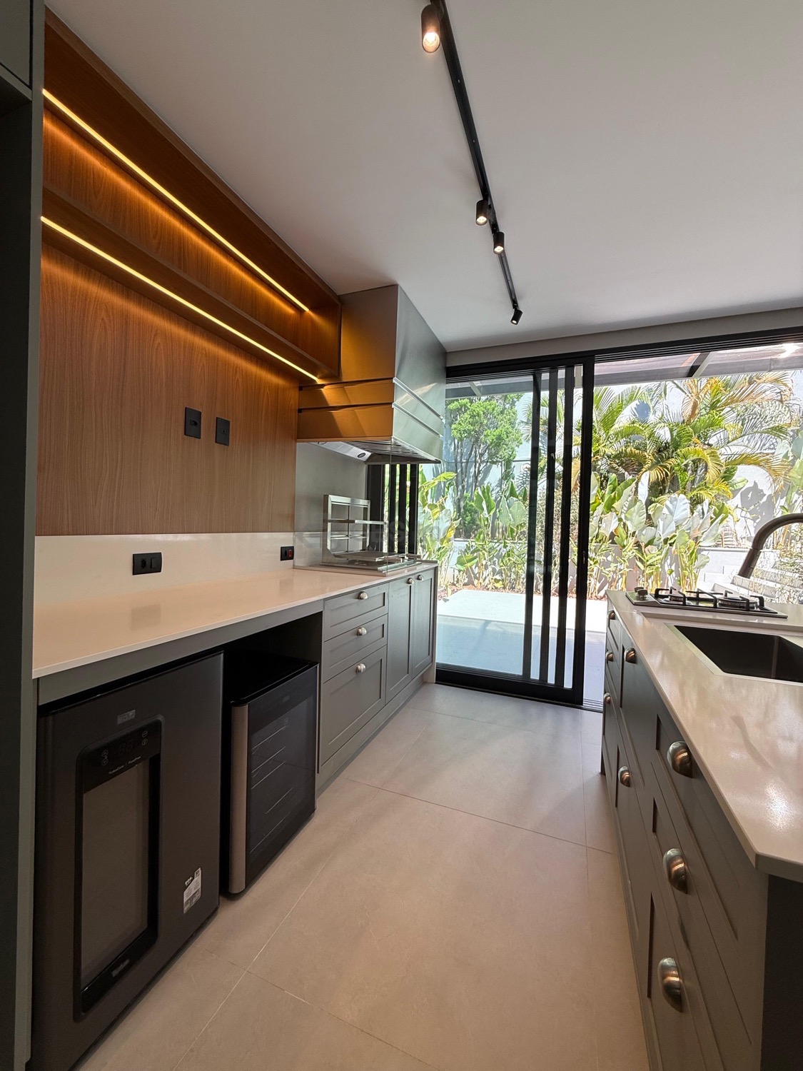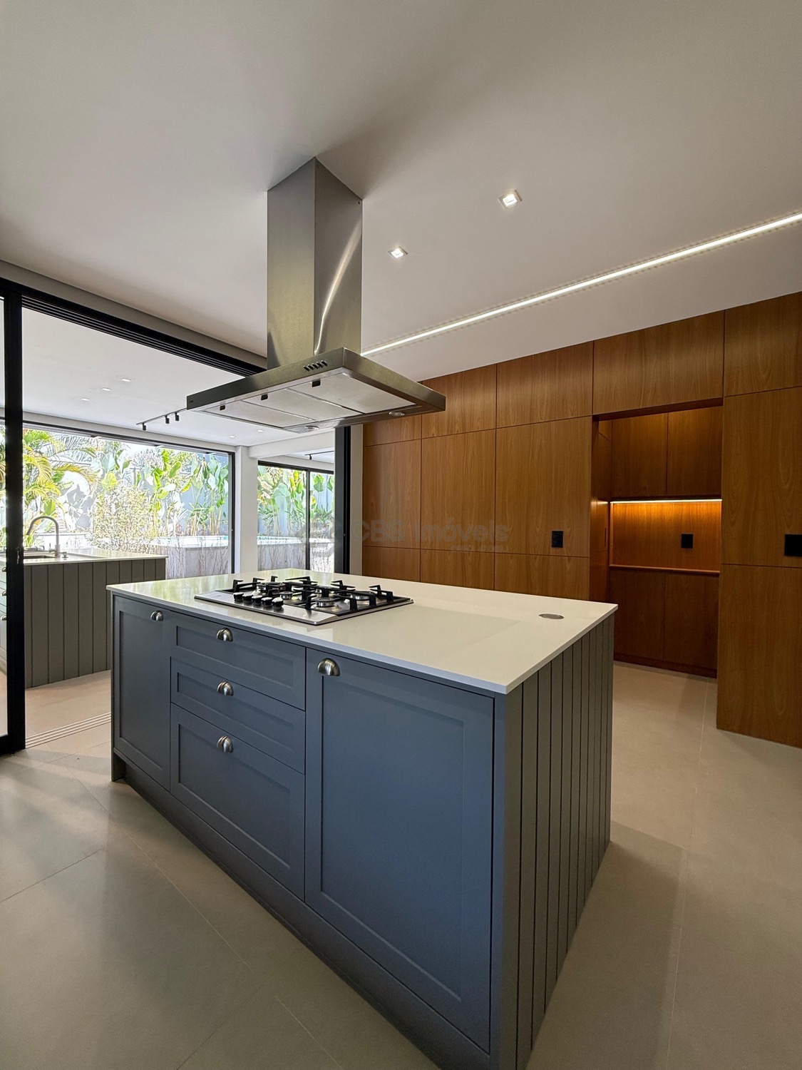 Cozinha integrada ao espaço gourmet, equipada com planejados e eletros embutidos (cooktop, forno, micro-ondas, coifa de ilha).