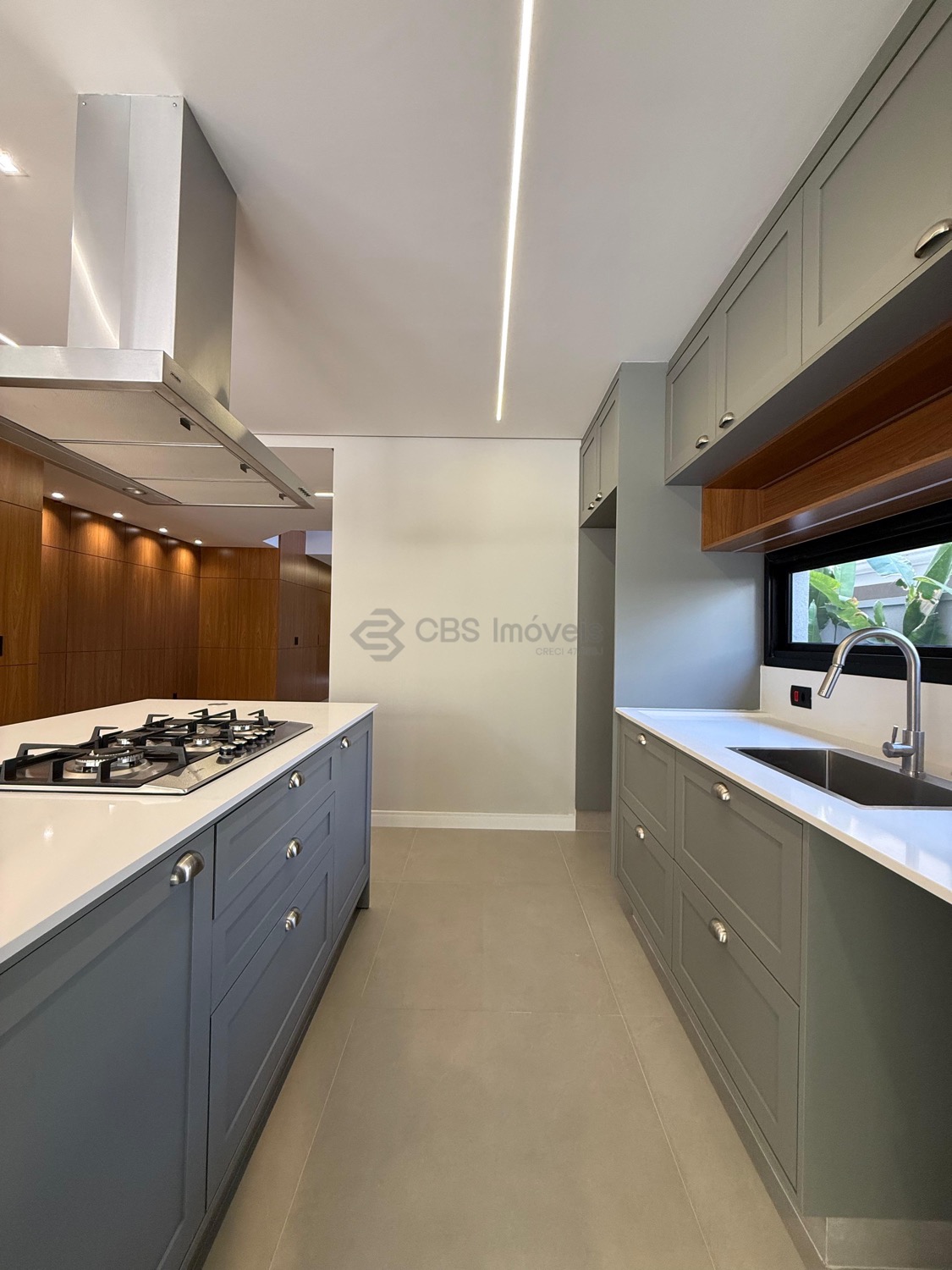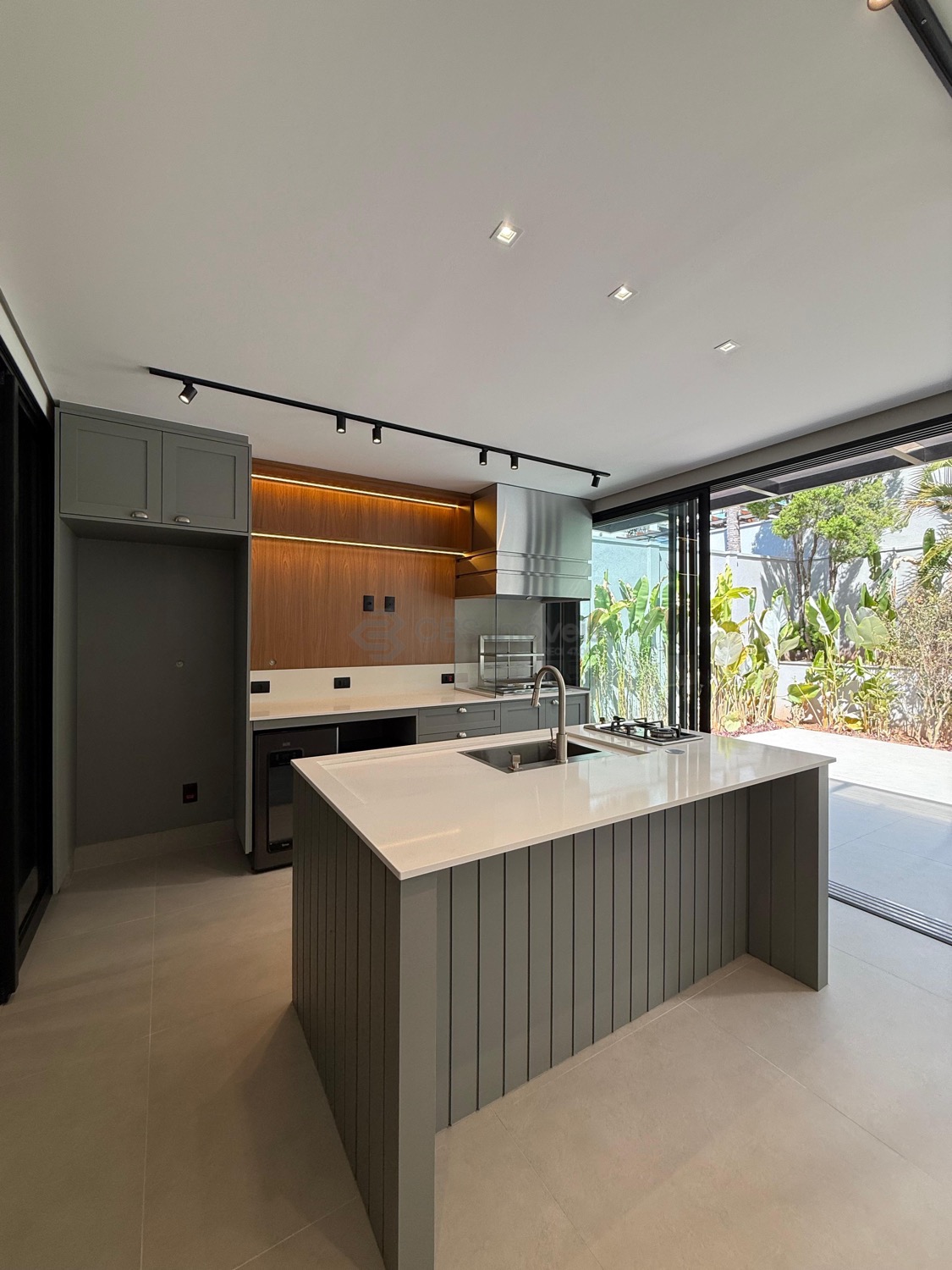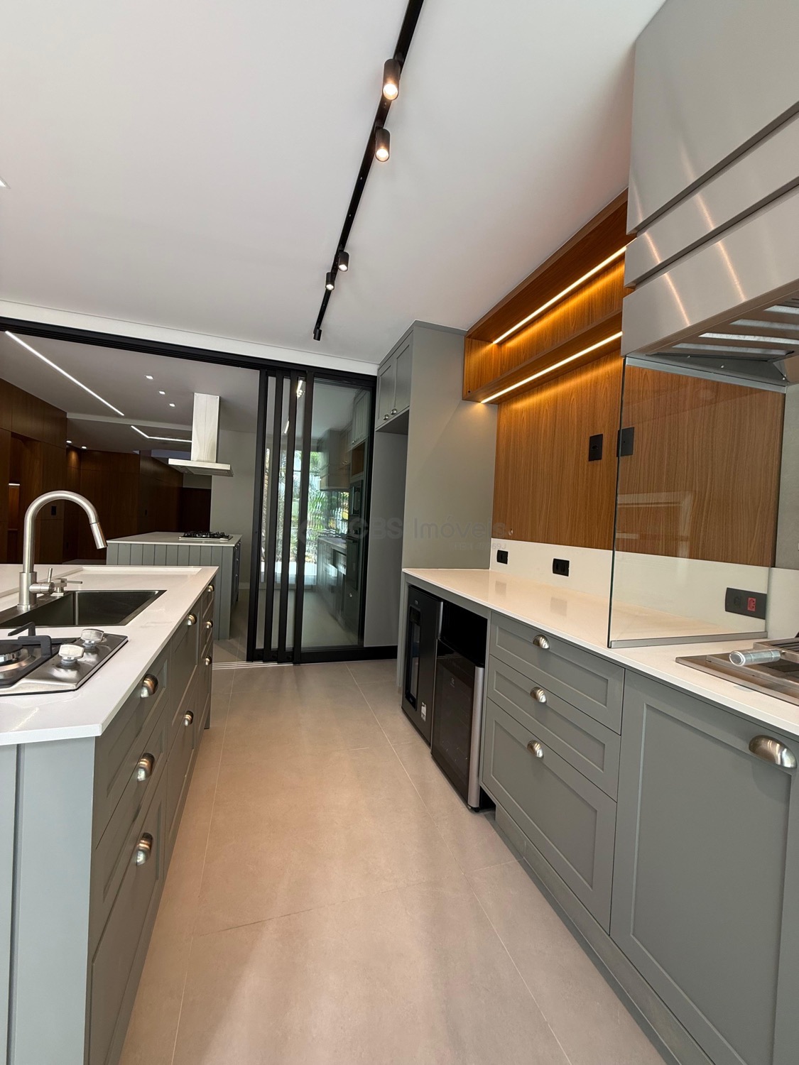 Cozinha integrada ao espaço gourmet, equipada com planejados e eletros embutidos (cooktop, forno, micro-ondas, coifa de ilha).