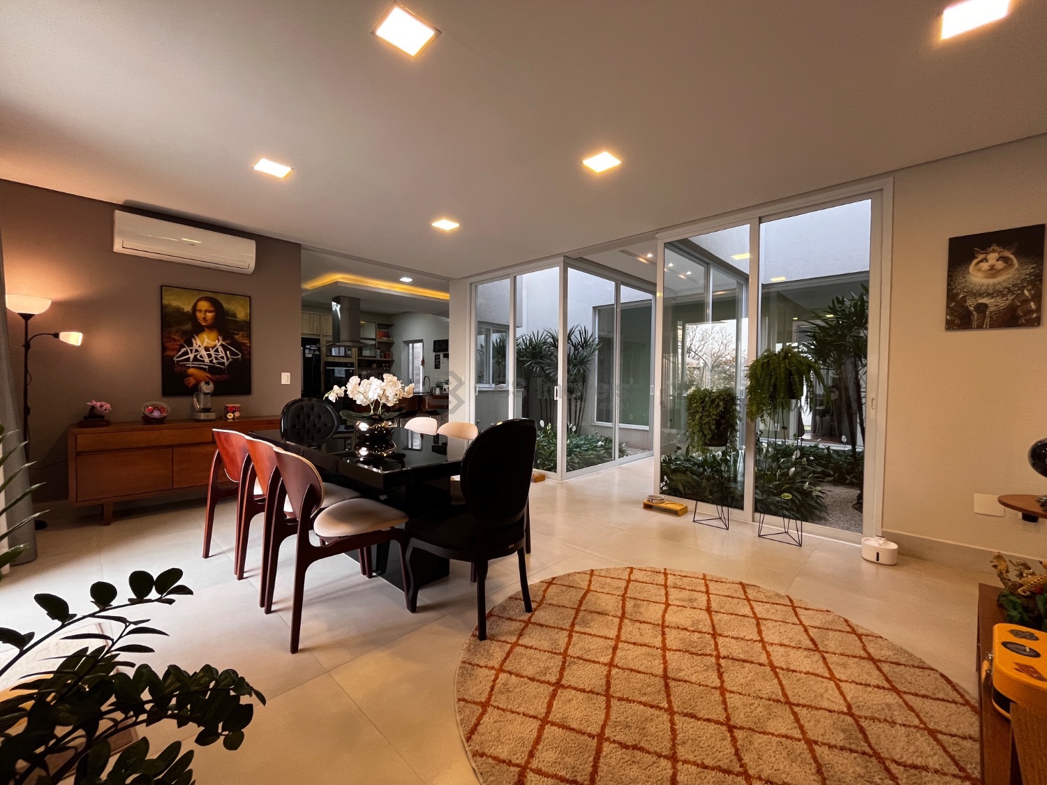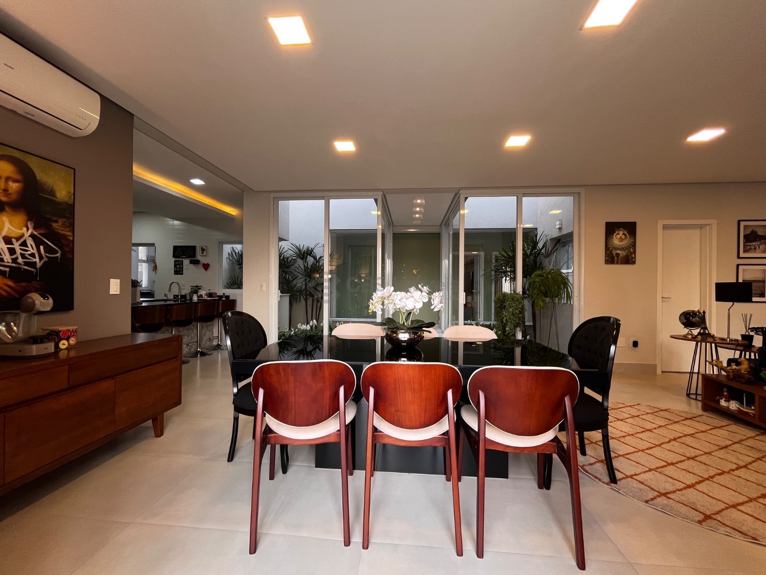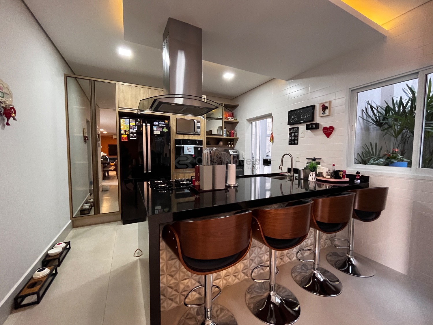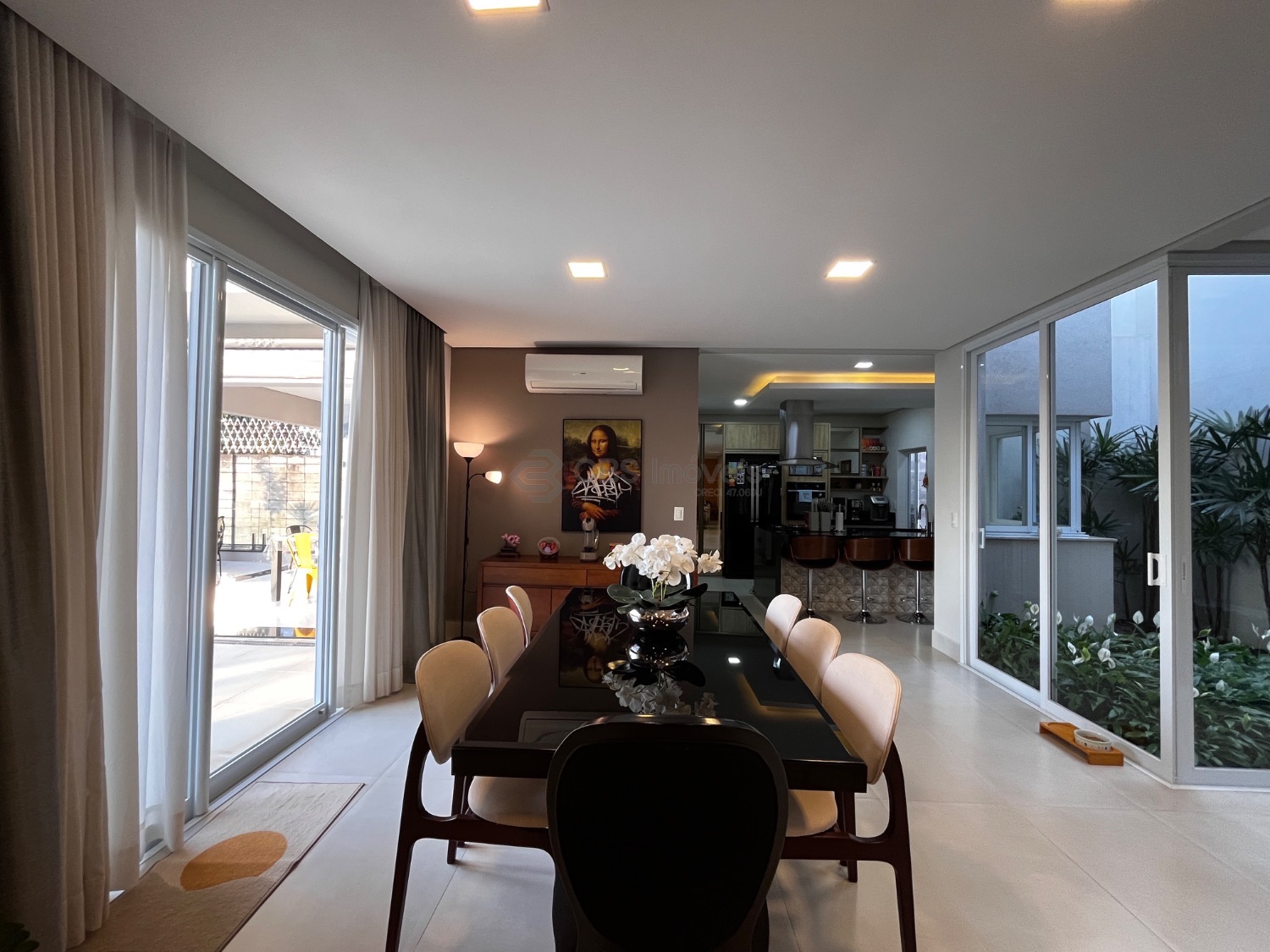 Possui, cozinha tipo americana completa de armários, sala de estar integrada com a sala de jantar, lindo jardim de inverno e home theater.