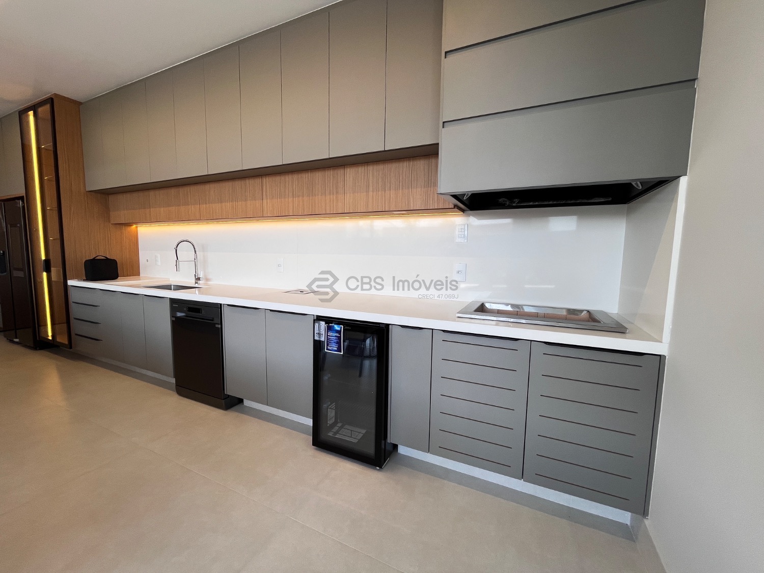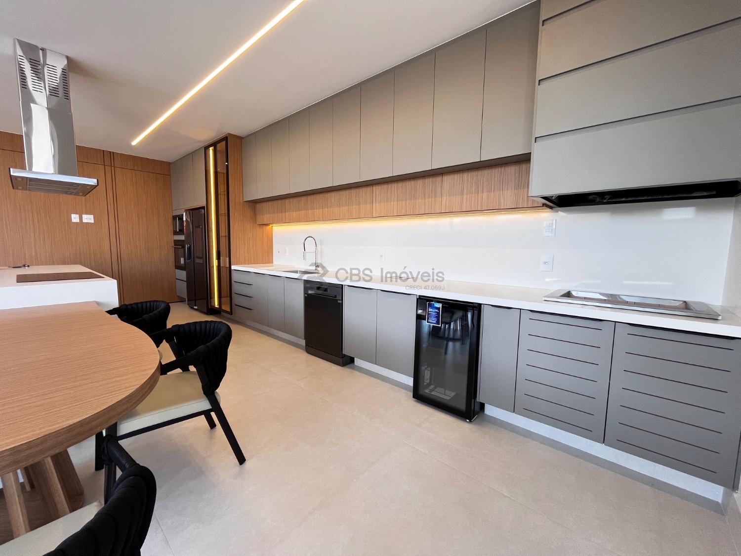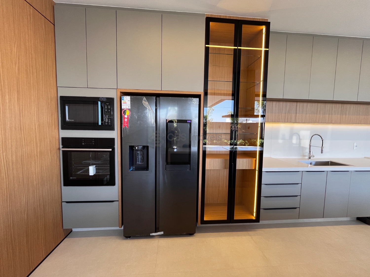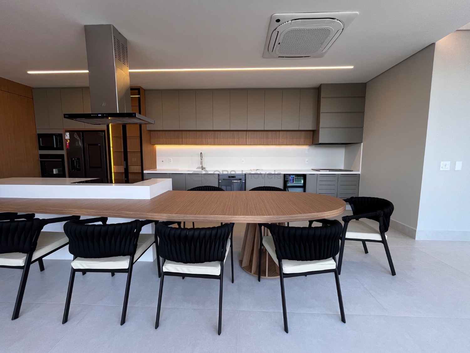 A cozinha é tipo americana, com linda mesa projetada para o ambiente, possui eletrodomésticos instaldos, inclusive cervejeira e forno elétrico com função air fryer.