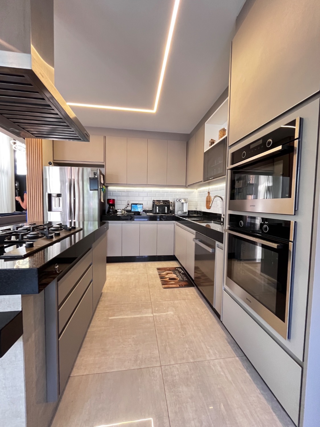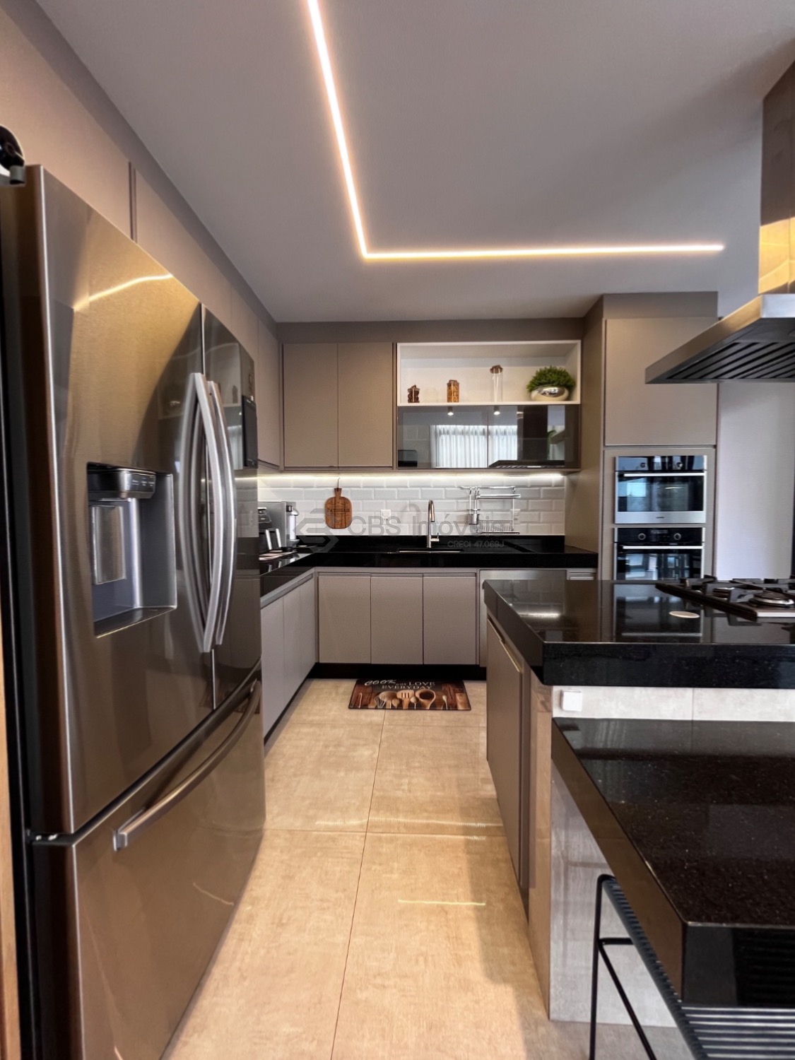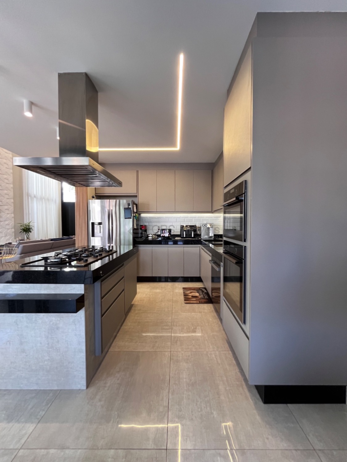 A cozinha é tipo americana, completa com armários e eletrodomésticos de primeira linha. Ela ainda possui lavabo, área de serviço, depósito e um fino acabamento por toda casa!
