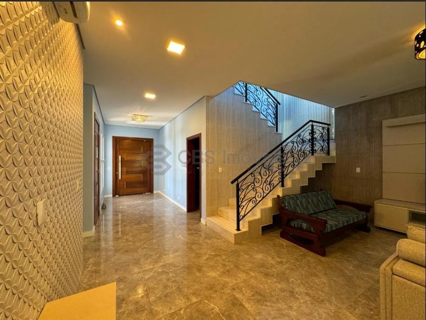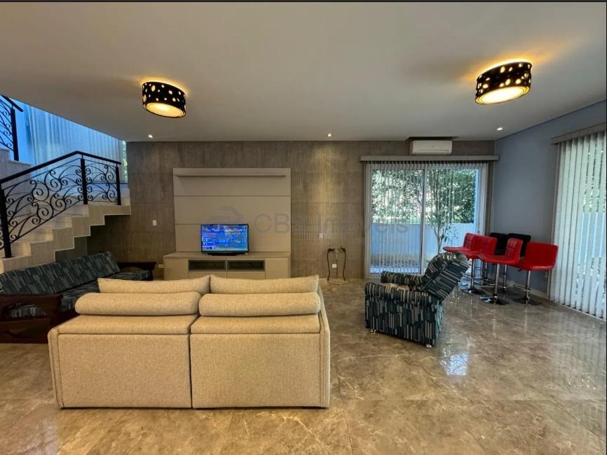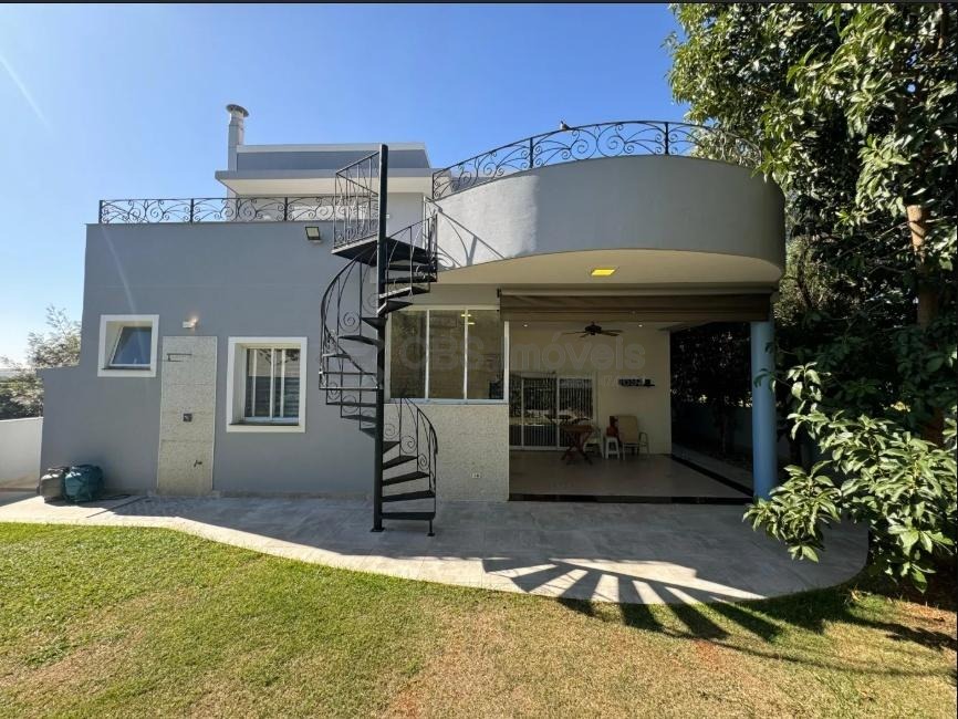 pressurização na origem. A casa conta com cinco suítes – quatro no piso superior e uma noinferior. No piso inferior, há uma suíte, um hall amplo, sala de estar e jantar integradas com a