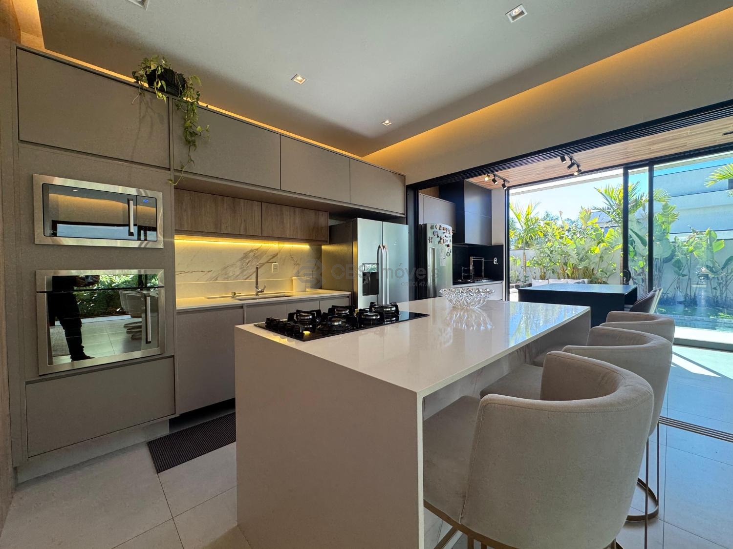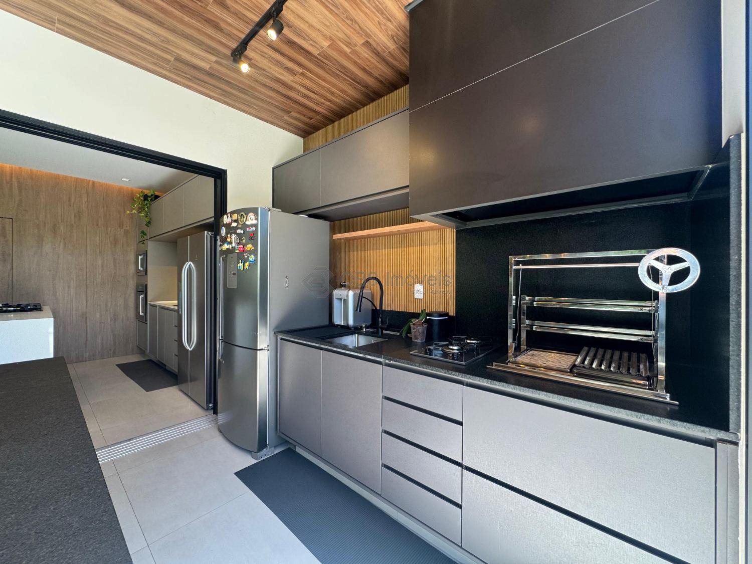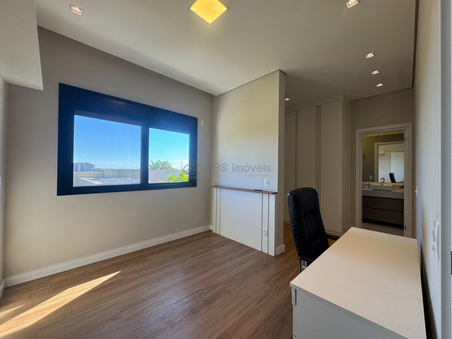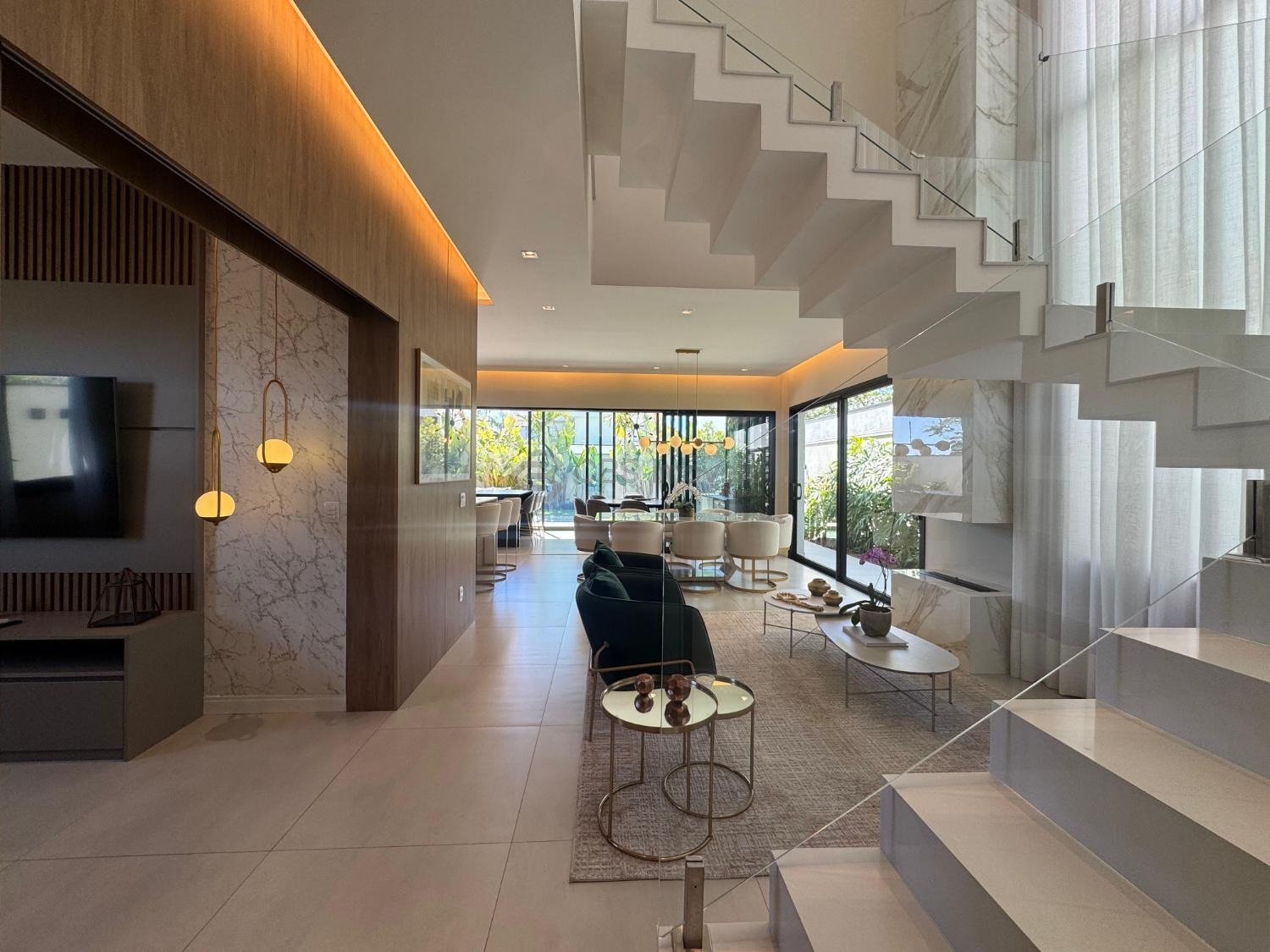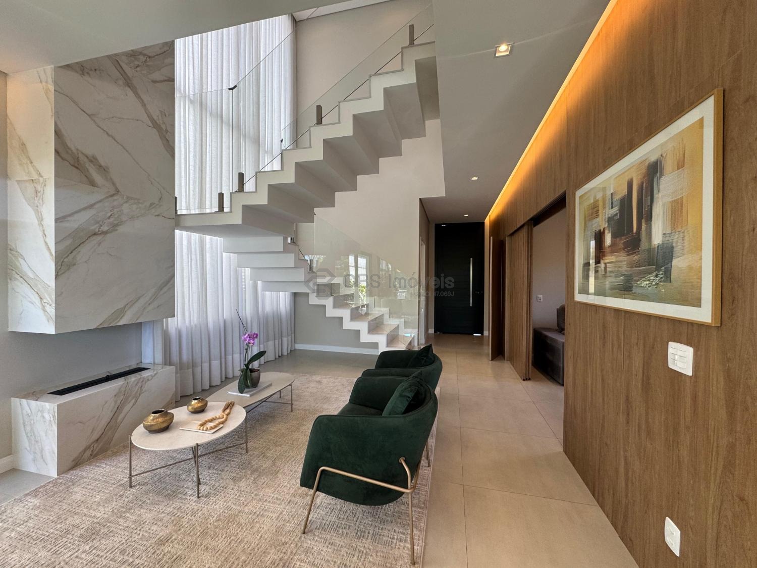 No térreo possui sala para 2 ambientes, com lareira e cozinha integradas, escritório, lavabo, sala de tv que pode ser um quarto, espaço gourmet, e com fechamento em vidro e garagem para 4 carros.