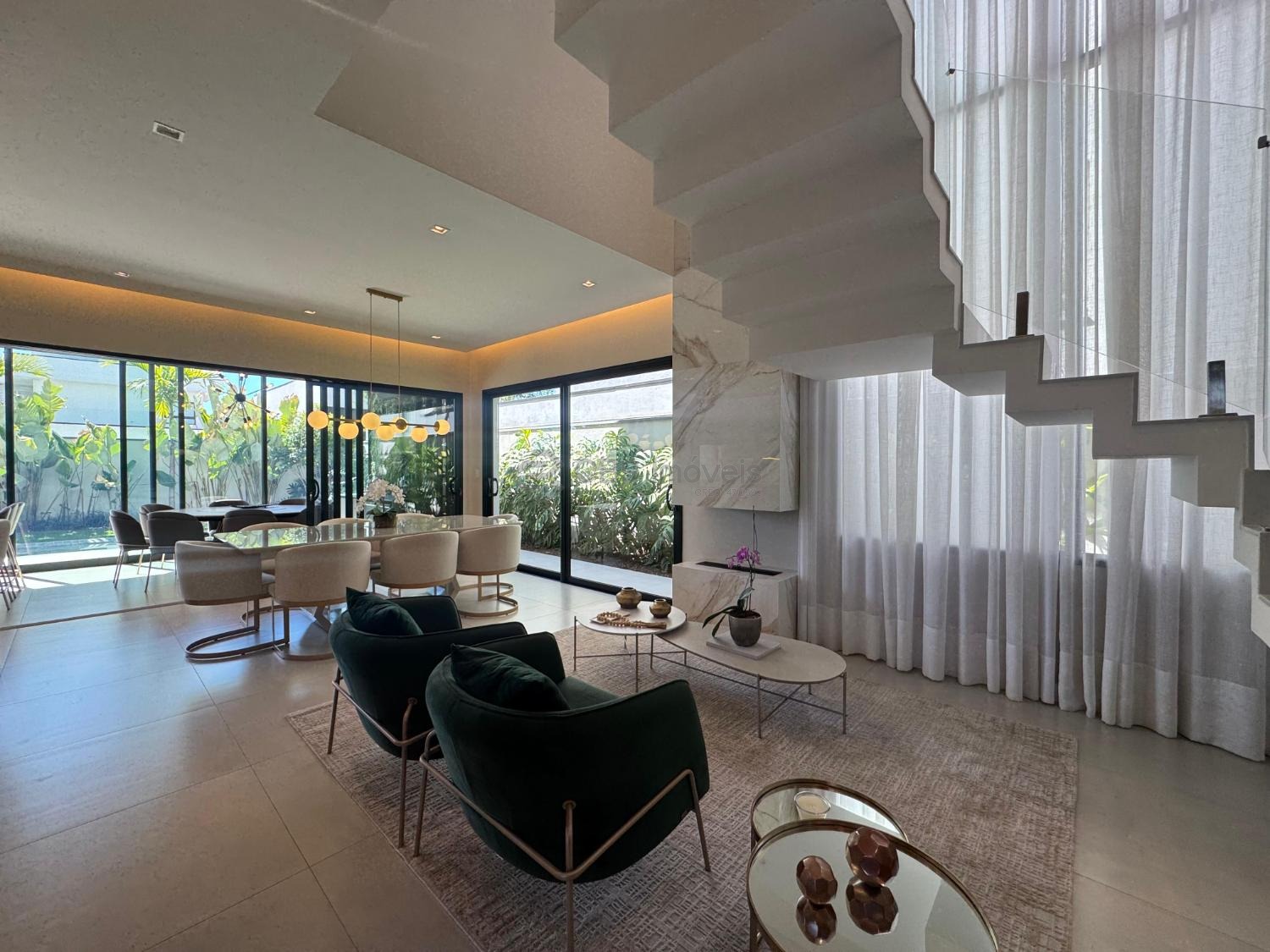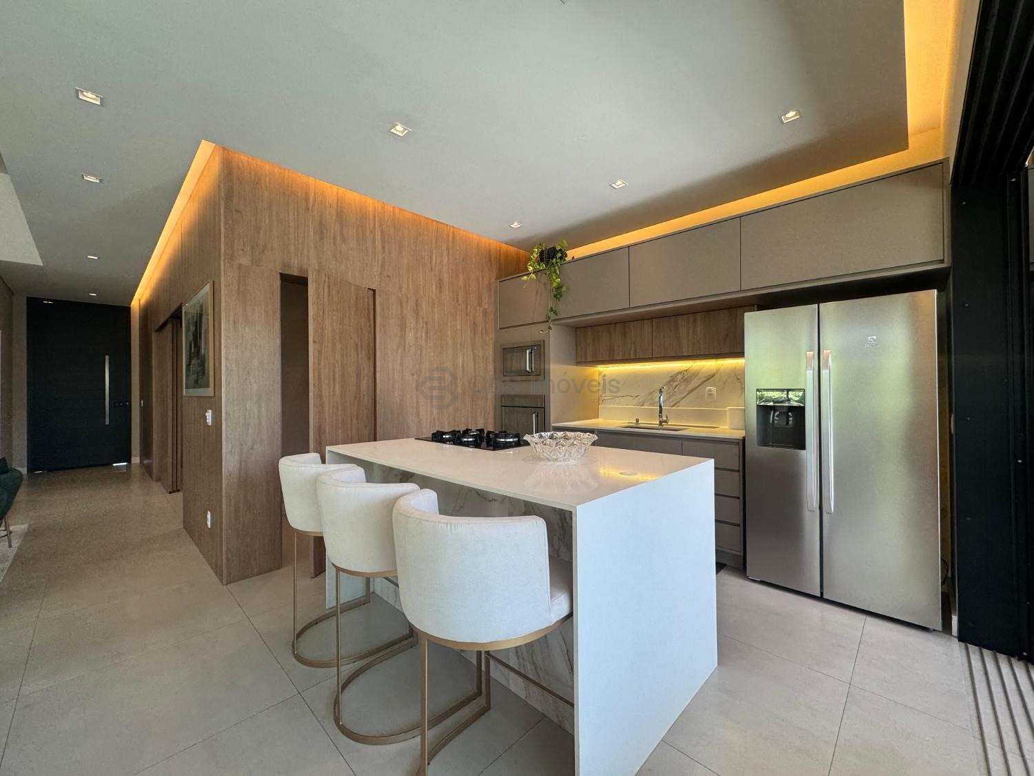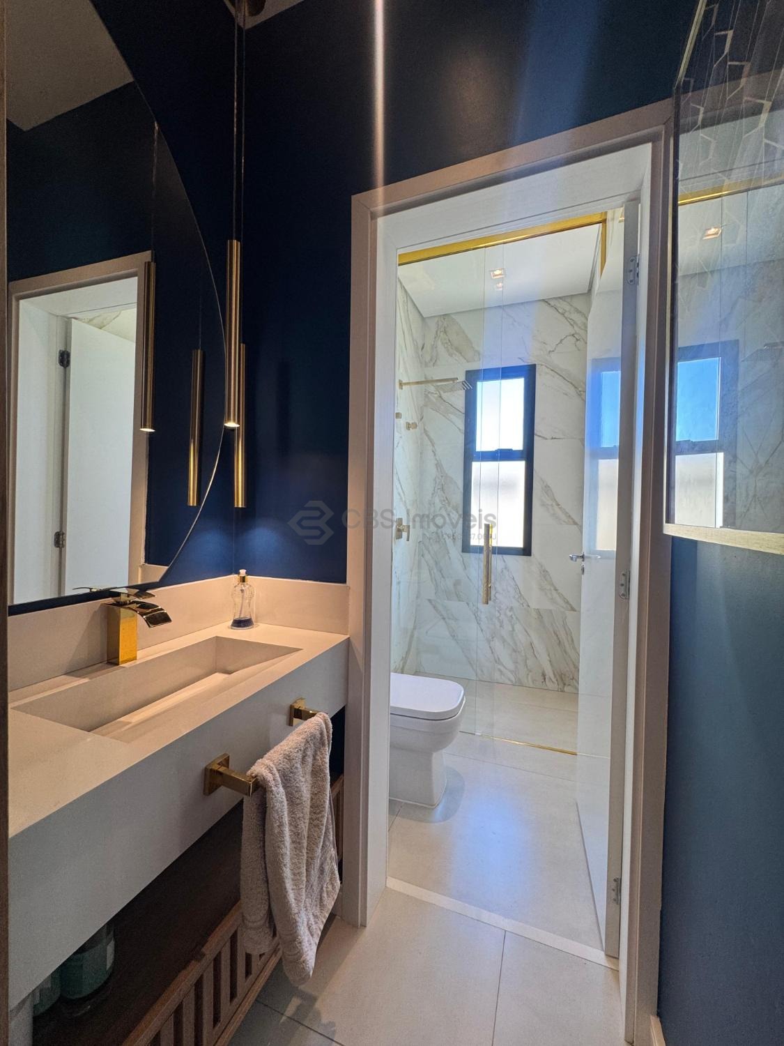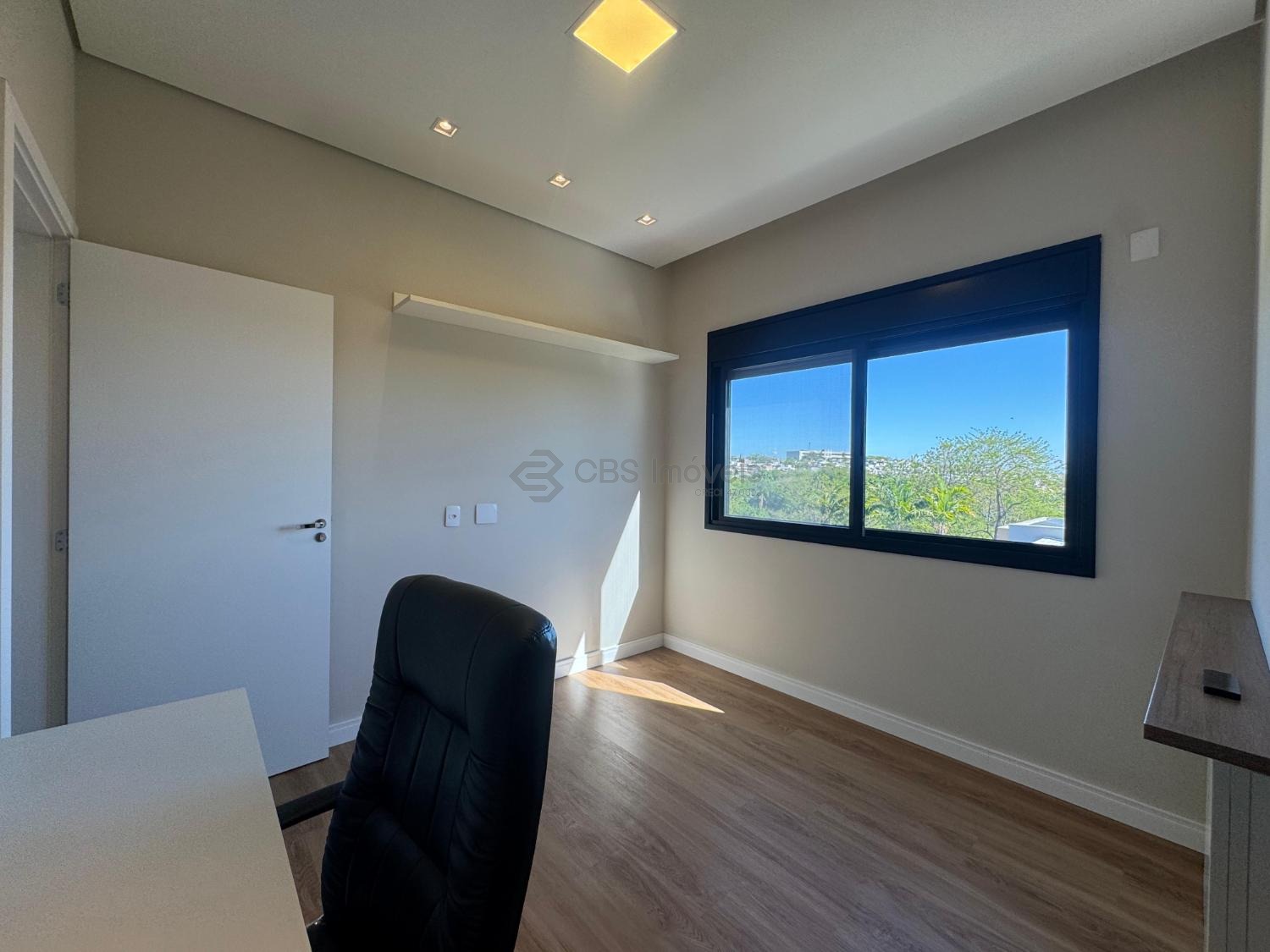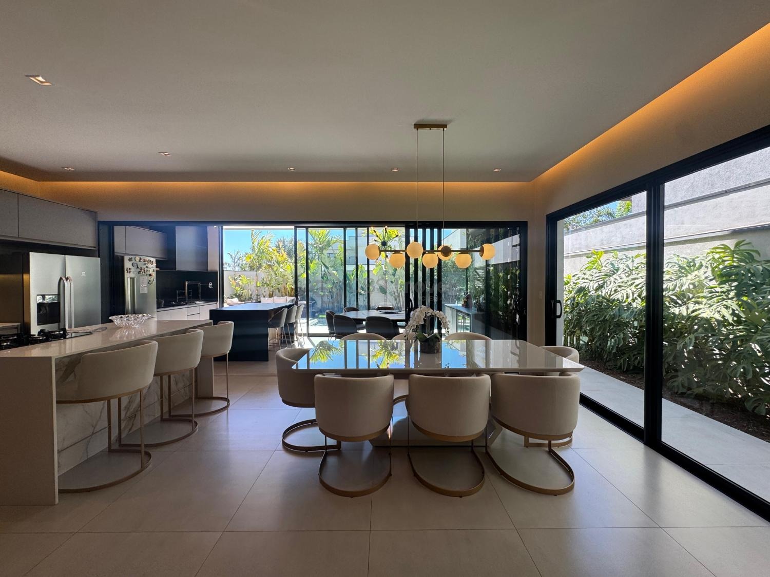 No térreo possui sala para 2 ambientes, com lareira e cozinha integradas, escritório, lavabo, sala de tv que pode ser um quarto, espaço gourmet, e com fechamento em vidro e garagem para 4 carros.