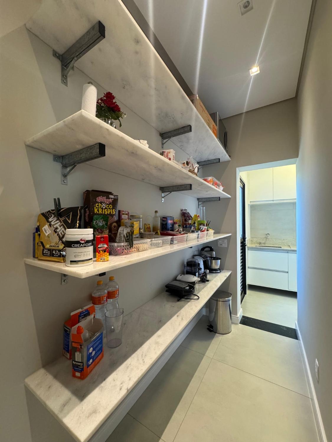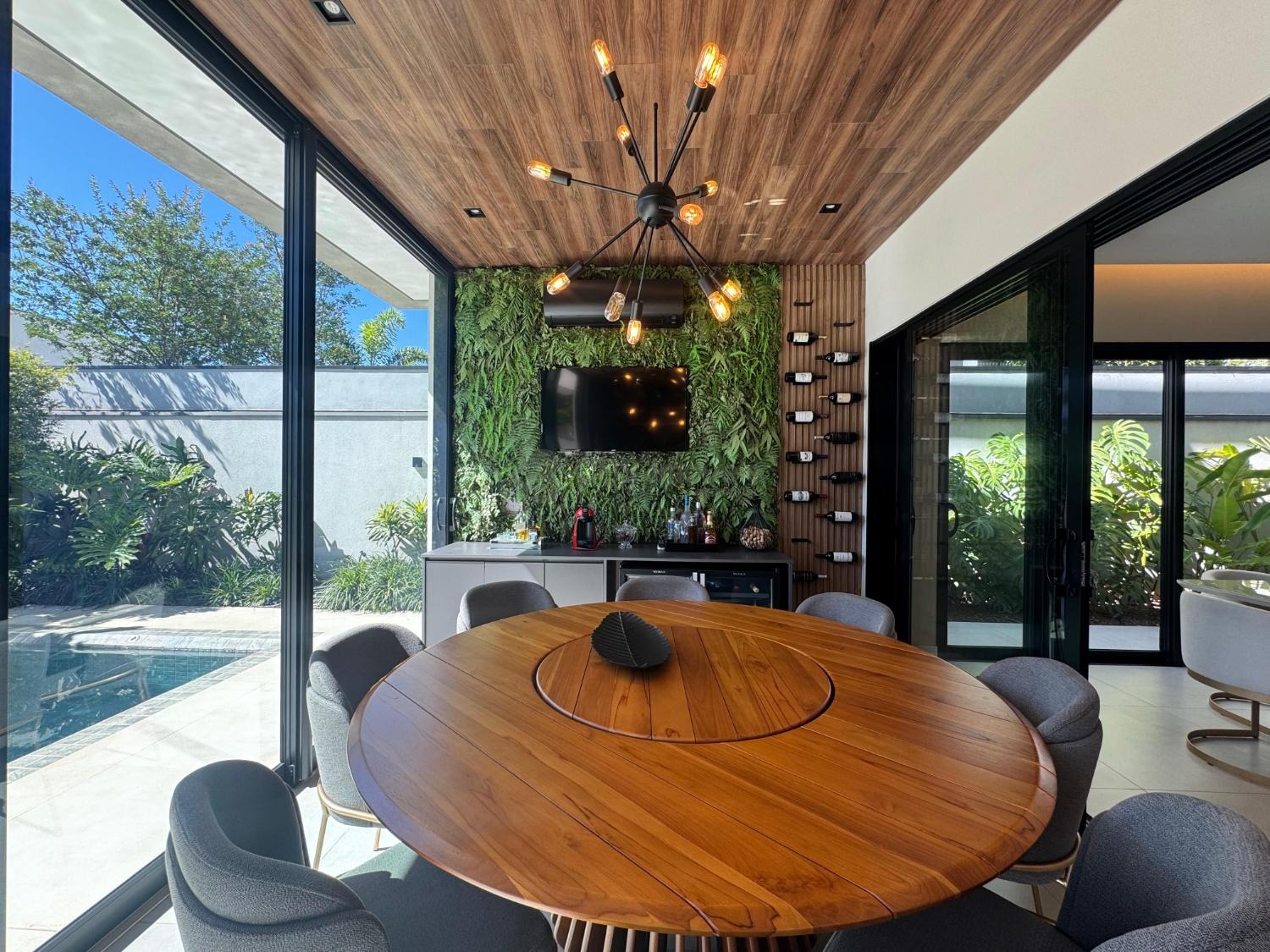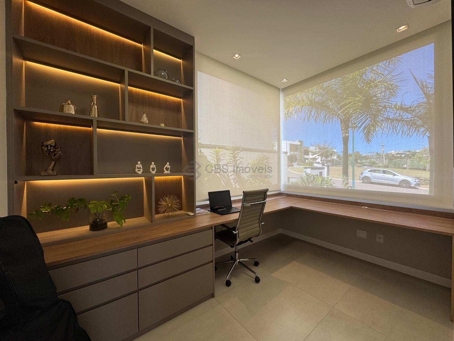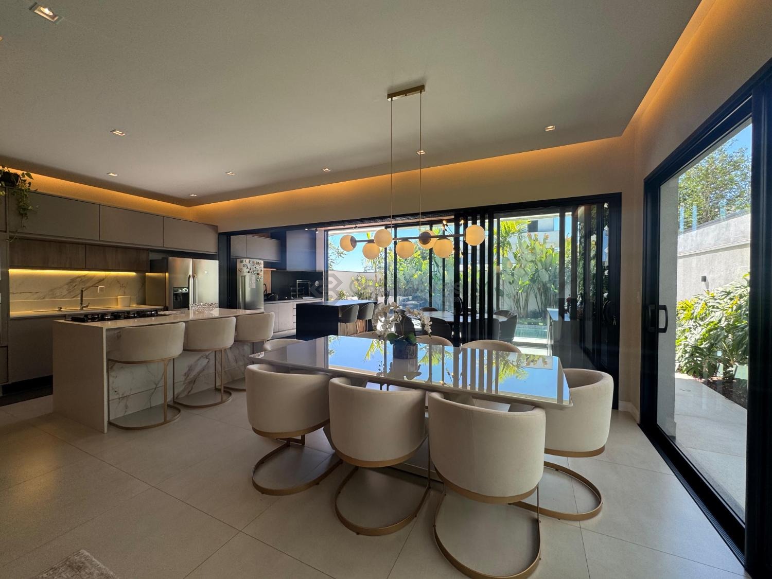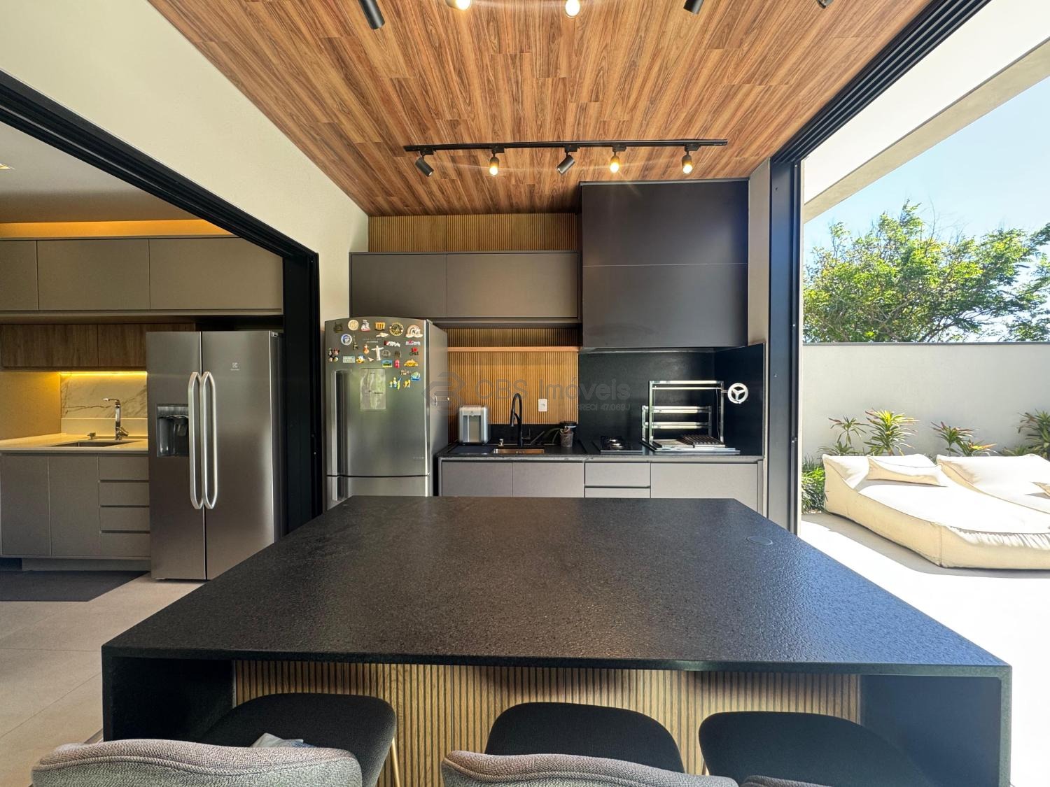 No térreo possui sala para 2 ambientes, com lareira e cozinha integradas, escritório, lavabo, sala de tv que pode ser um quarto, espaço gourmet, e com fechamento em vidro e garagem para 4 carros.