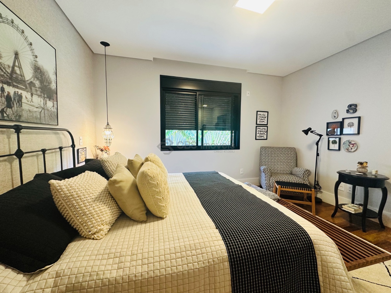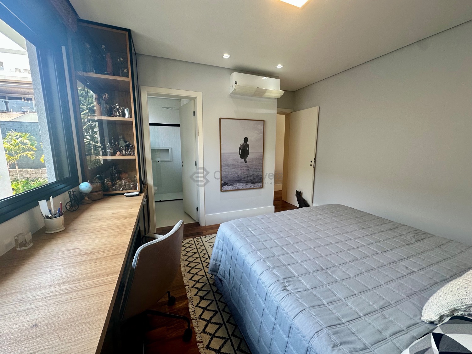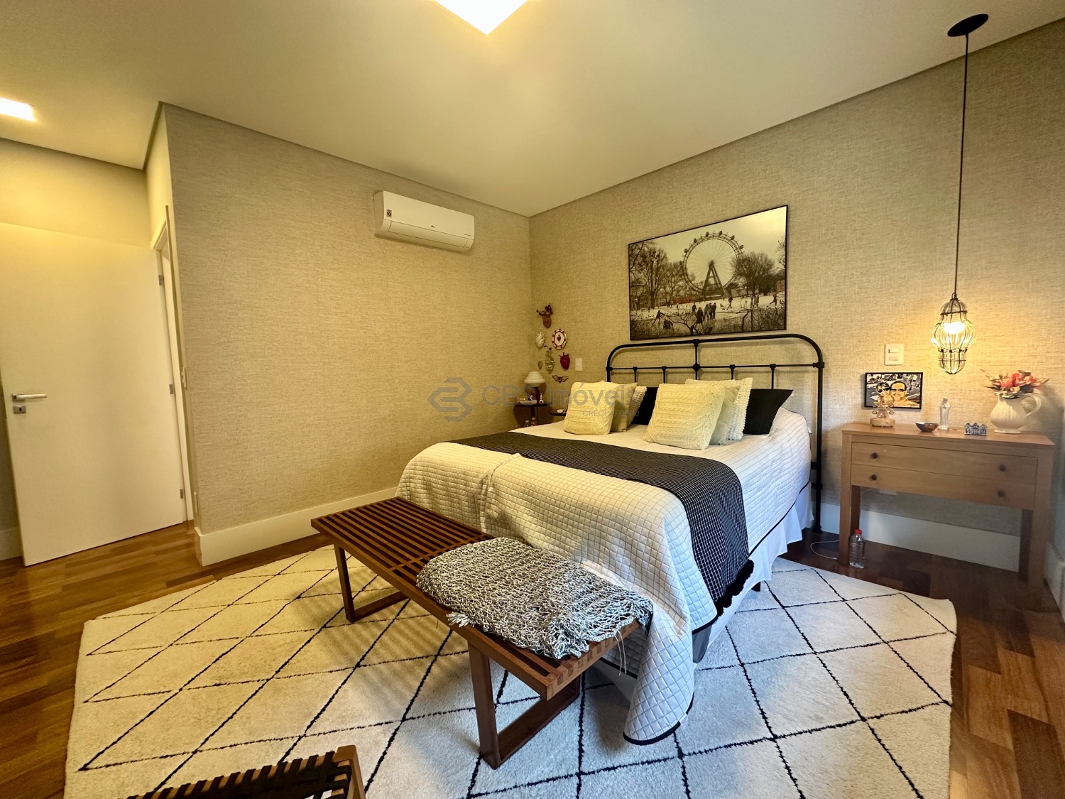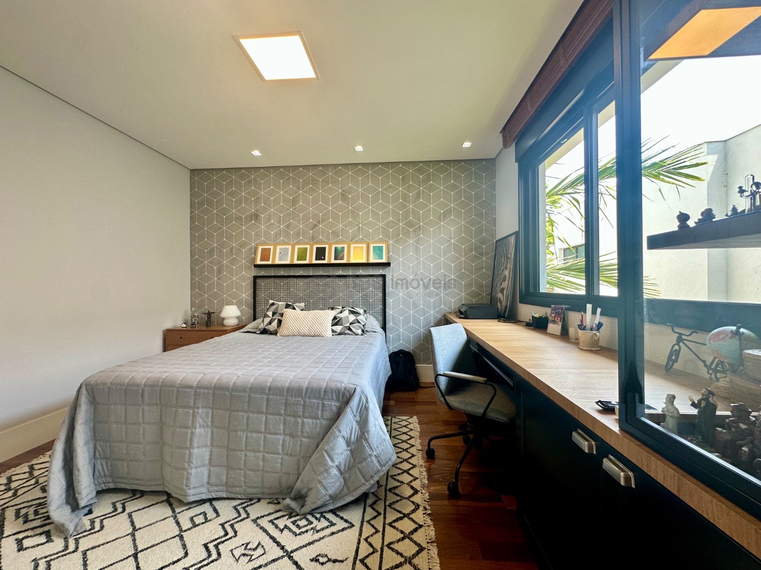 Este imóvel se destaca pelo pé-direito alto e pela integração dos espaços, oferecendo uma ampla sala para três ambientes, lavabo, escritório e depósito. No piso superior, são três suítes, todas climatizadas com ar-condicionado, sendo a master com closet e armários planejados, garantindo praticidade e sofisticação.