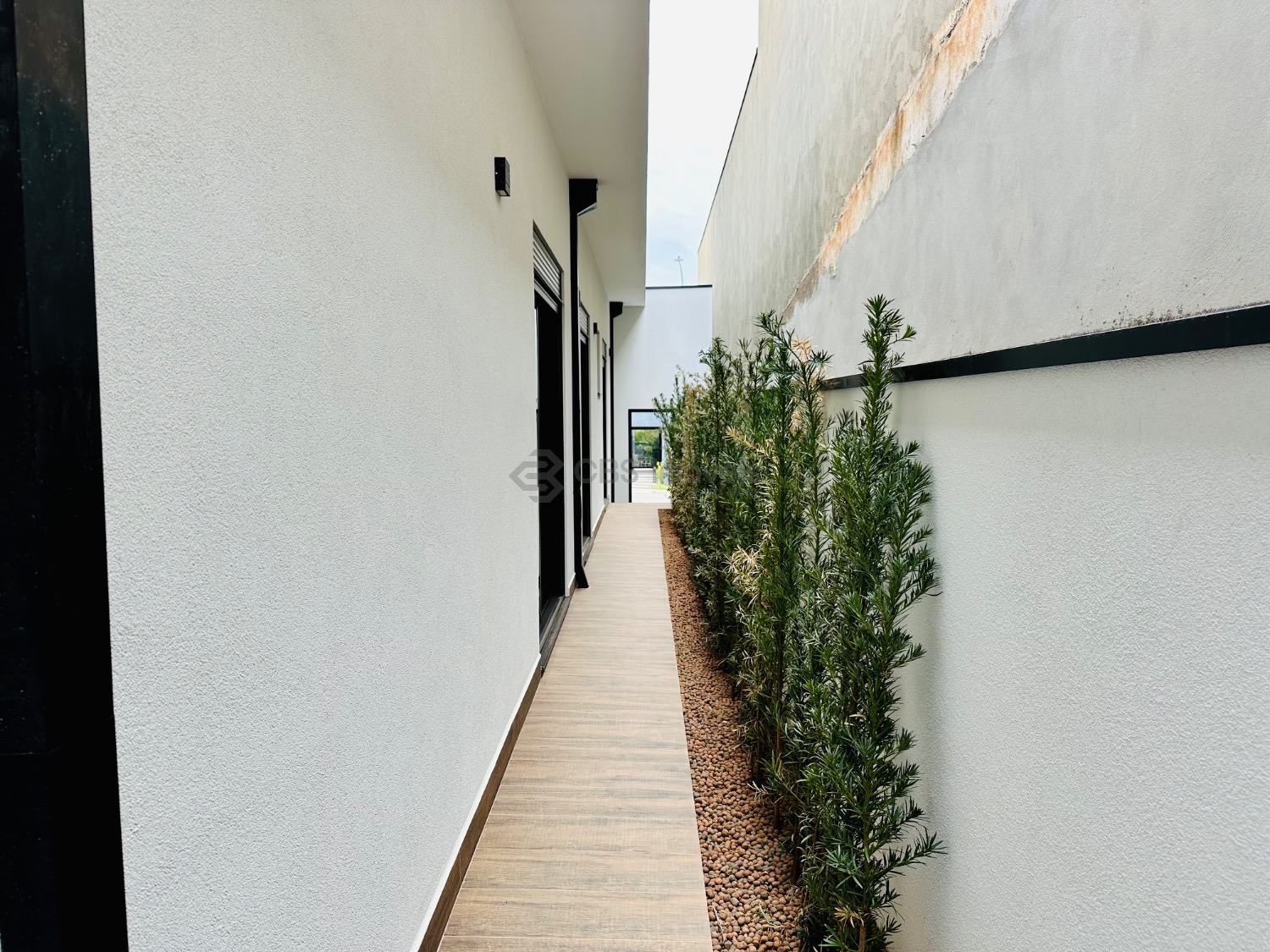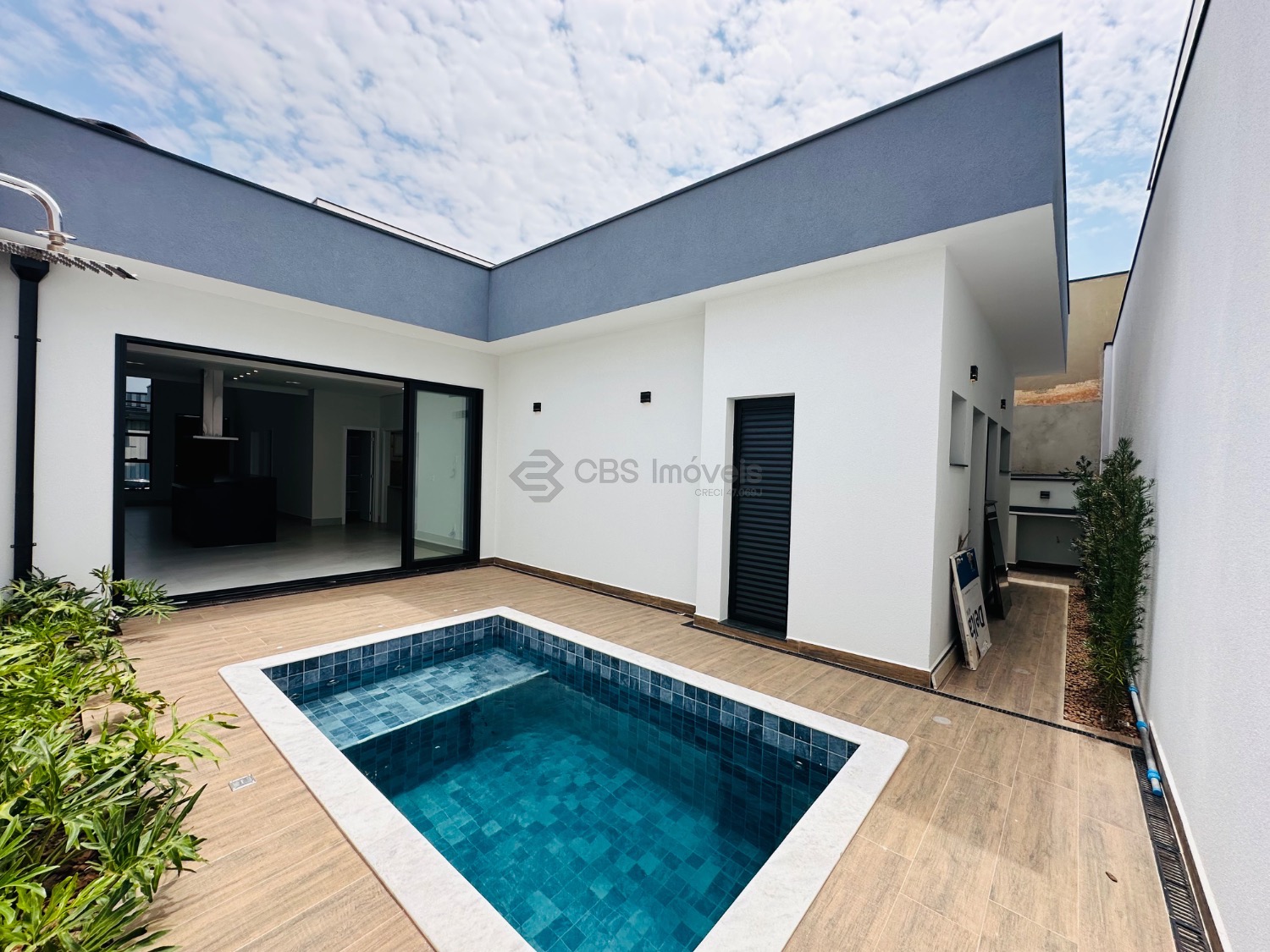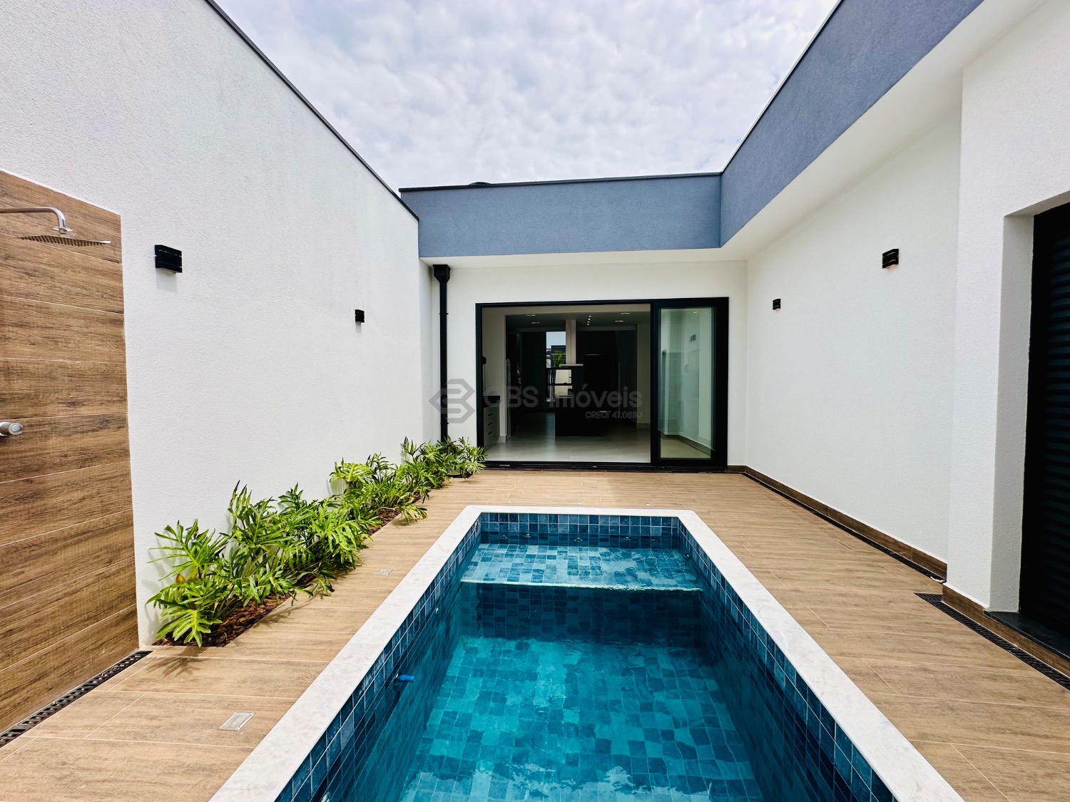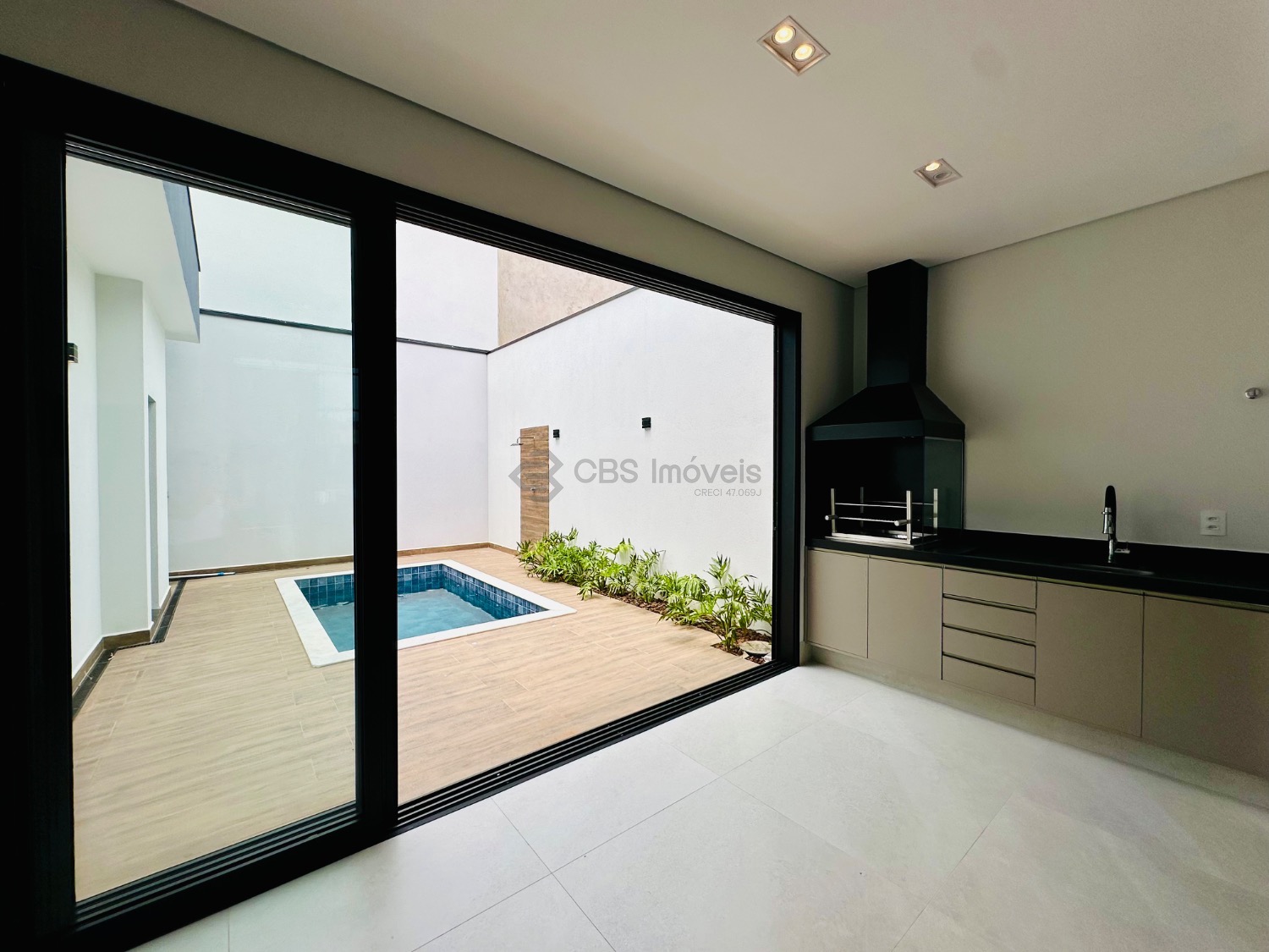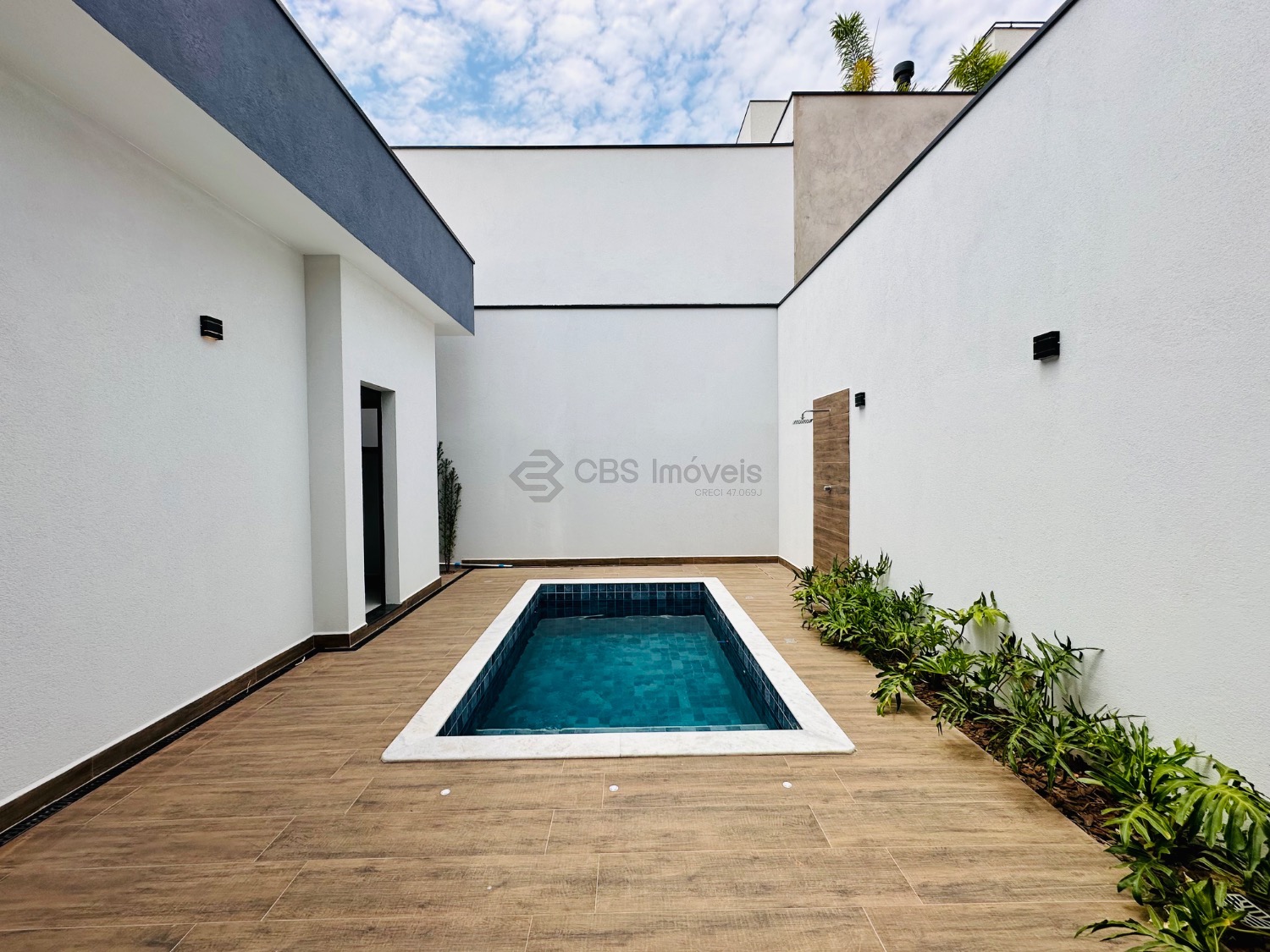 A área externa conta com paisagismo, piscina com banheiro de apoio e lavanderia independente. O imóvel possui ainda boiler e pressurizador nas torneiras e chuveiros, infraestrutura pronta para energia solar e aquecimento da piscina, além de infraestrutura completa para ar-condicionado (cabeamento e cobre instalados).