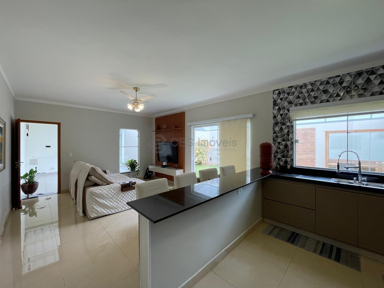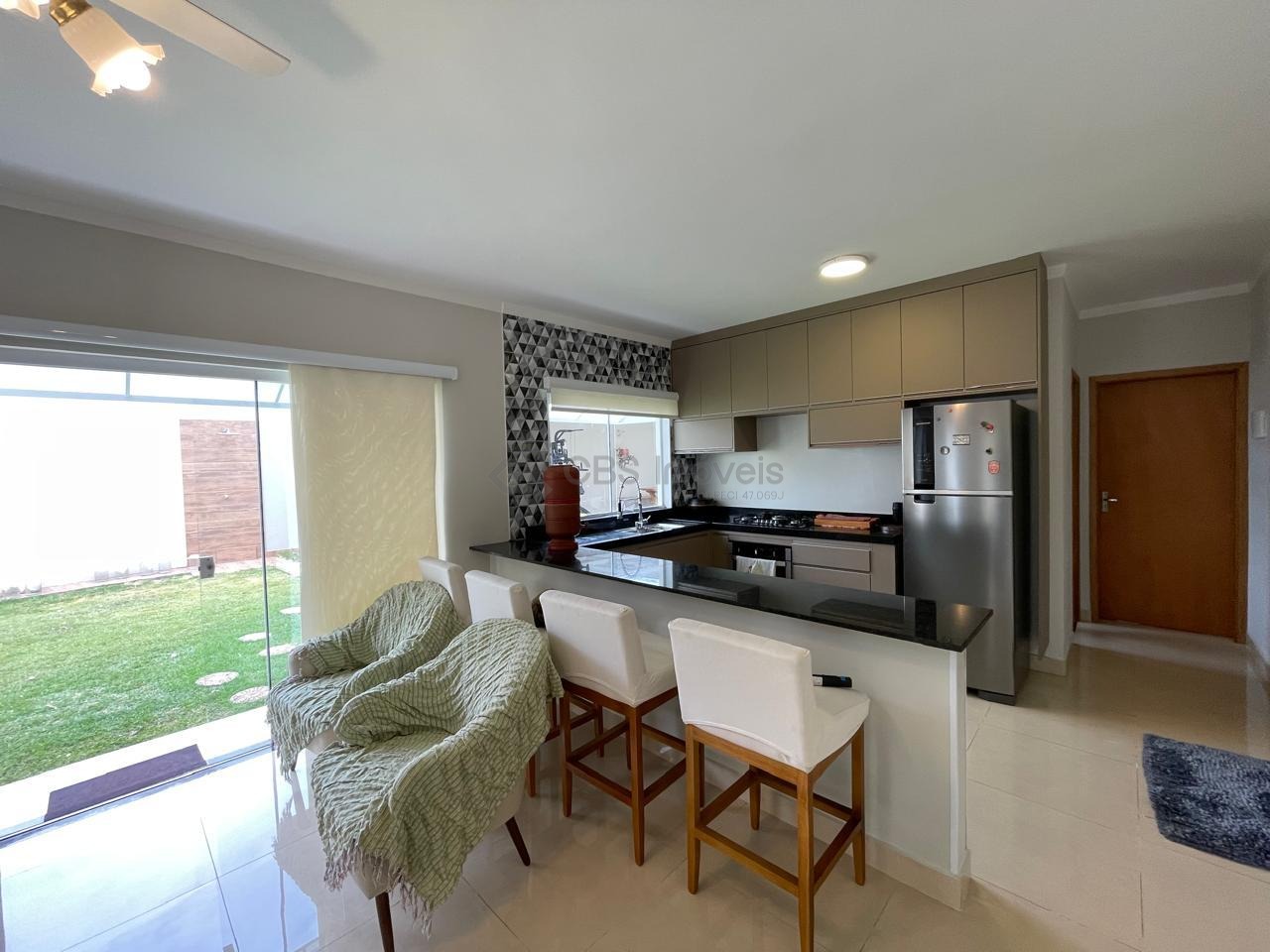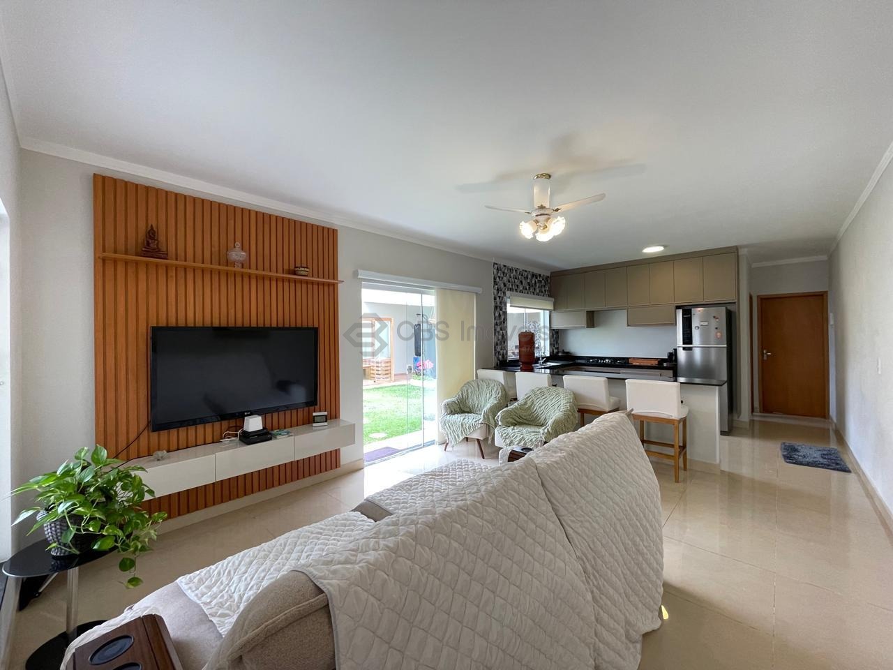 Possui sala com painel de TV e ventilador de teto, cozinha integrada com armários planejados e banheiro social com box e gabinete.