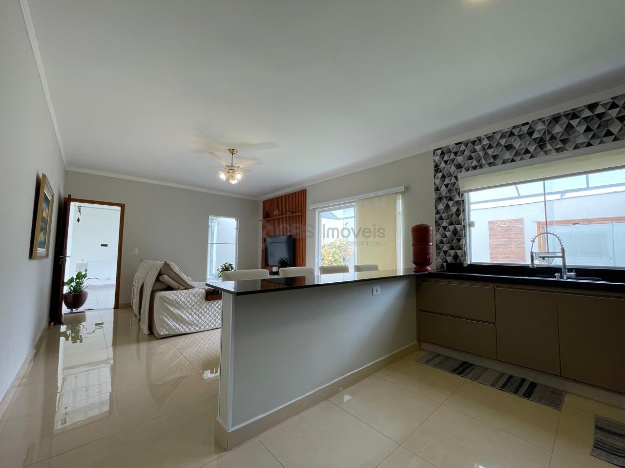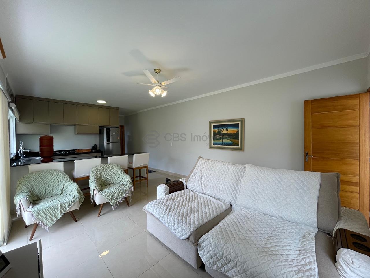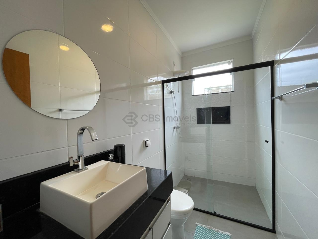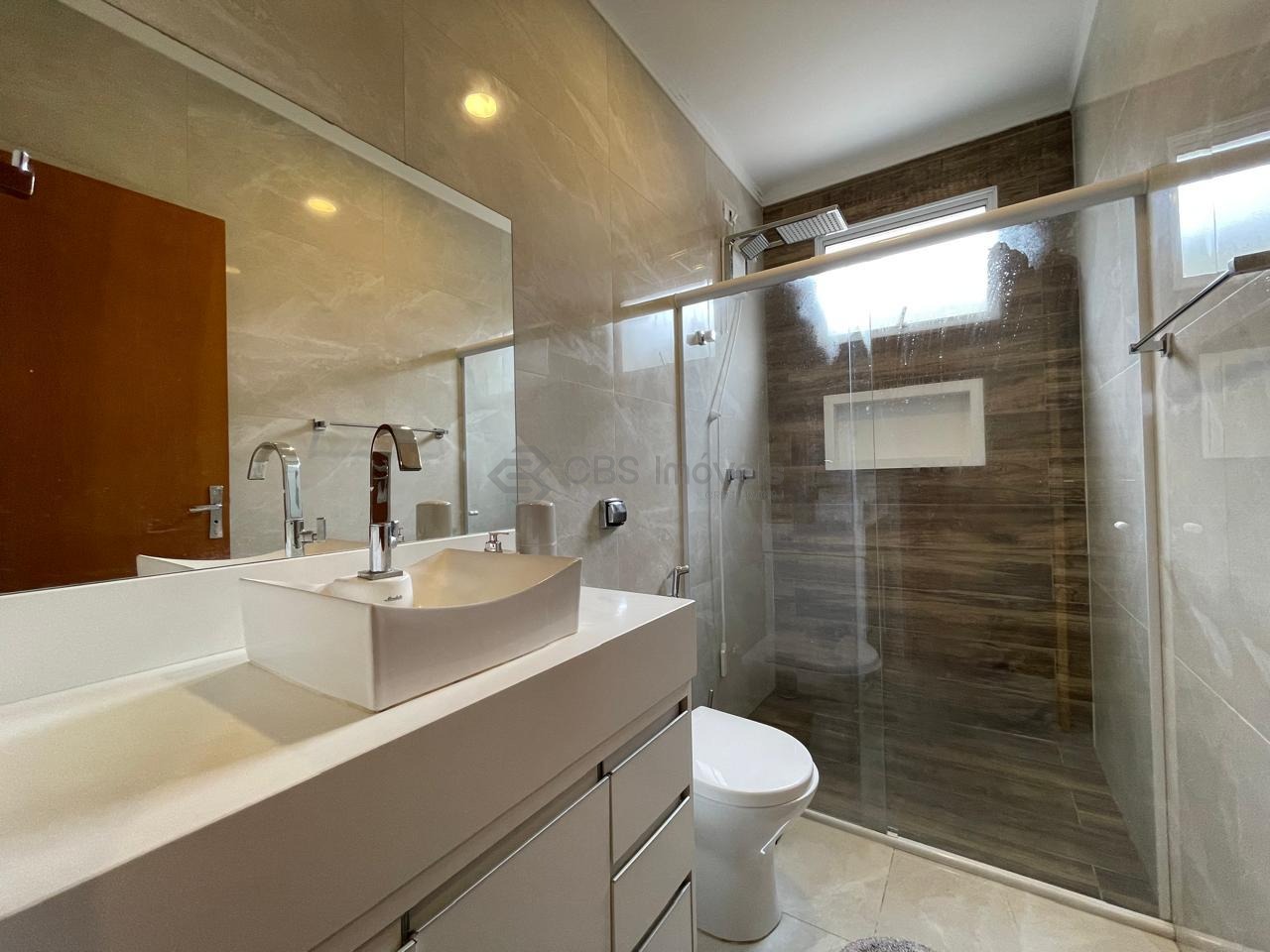 Possui sala com painel de TV e ventilador de teto, cozinha integrada com armários planejados e banheiro social com box e gabinete.