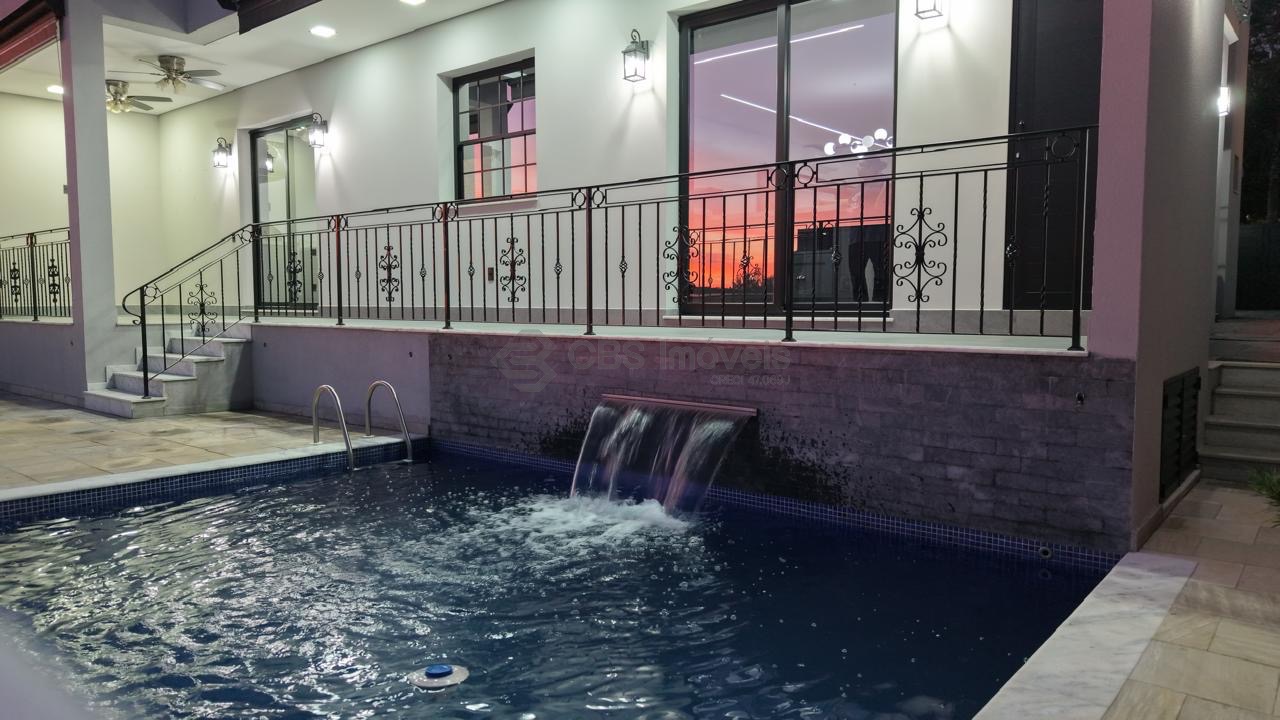 A área externa é um convite ao lazer, com piscina com hidro e cascata, garagem para quatro carros (duas vagas cobertas com portão automatizado), banheiro de apoio e espaço gourmet integrado.