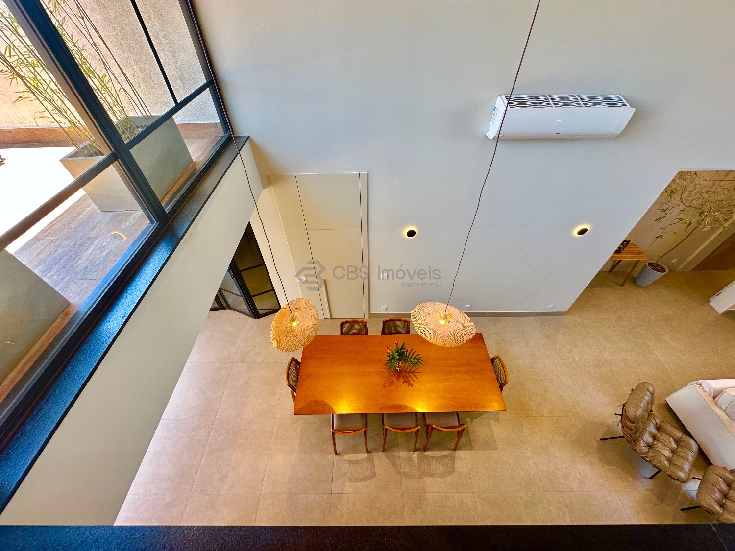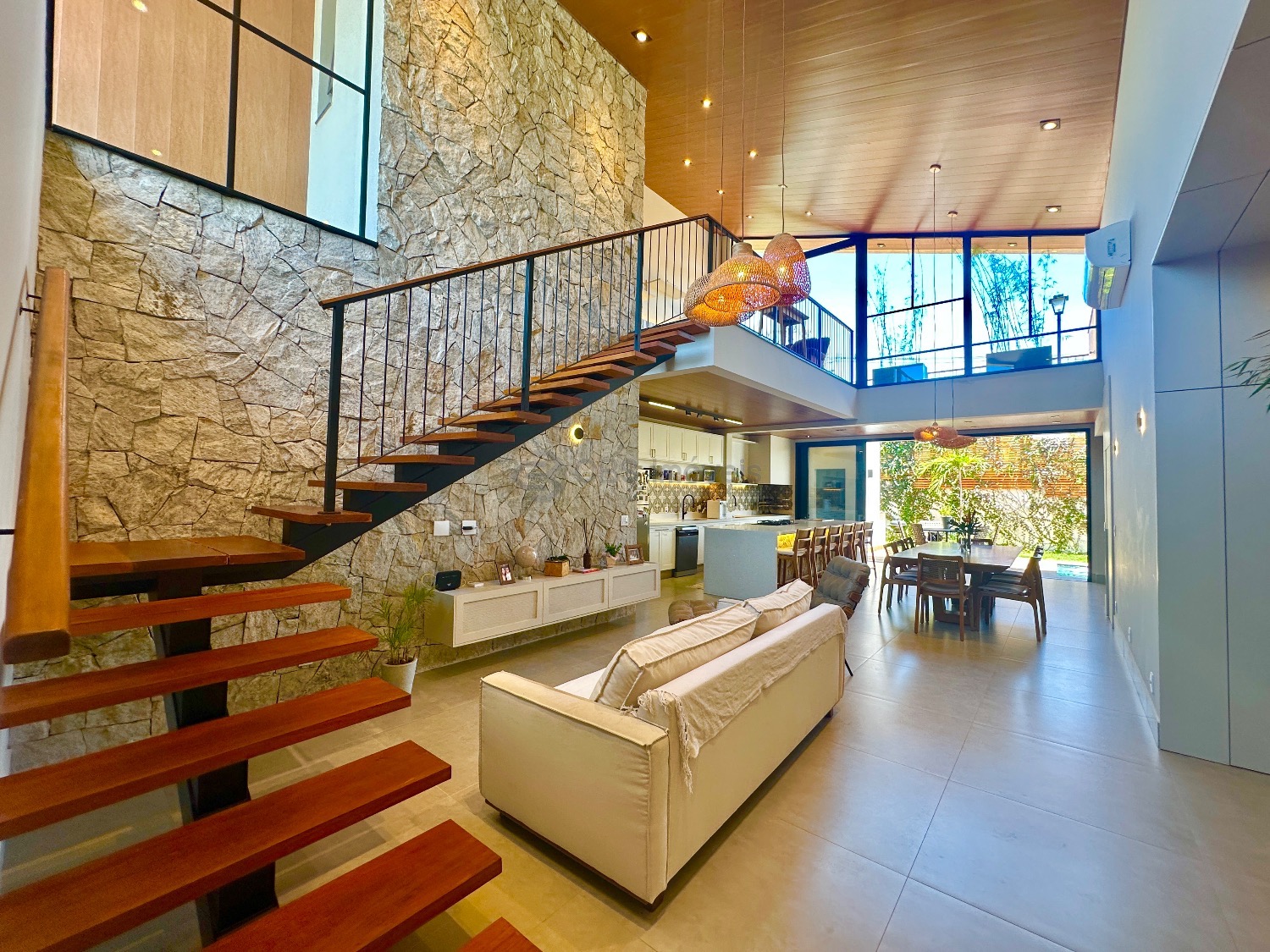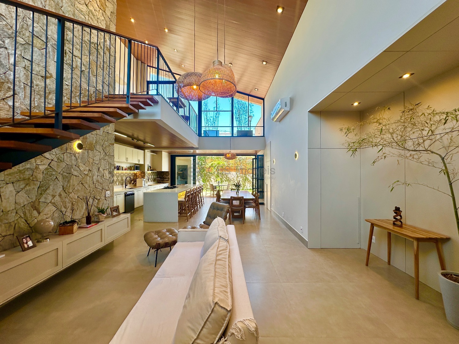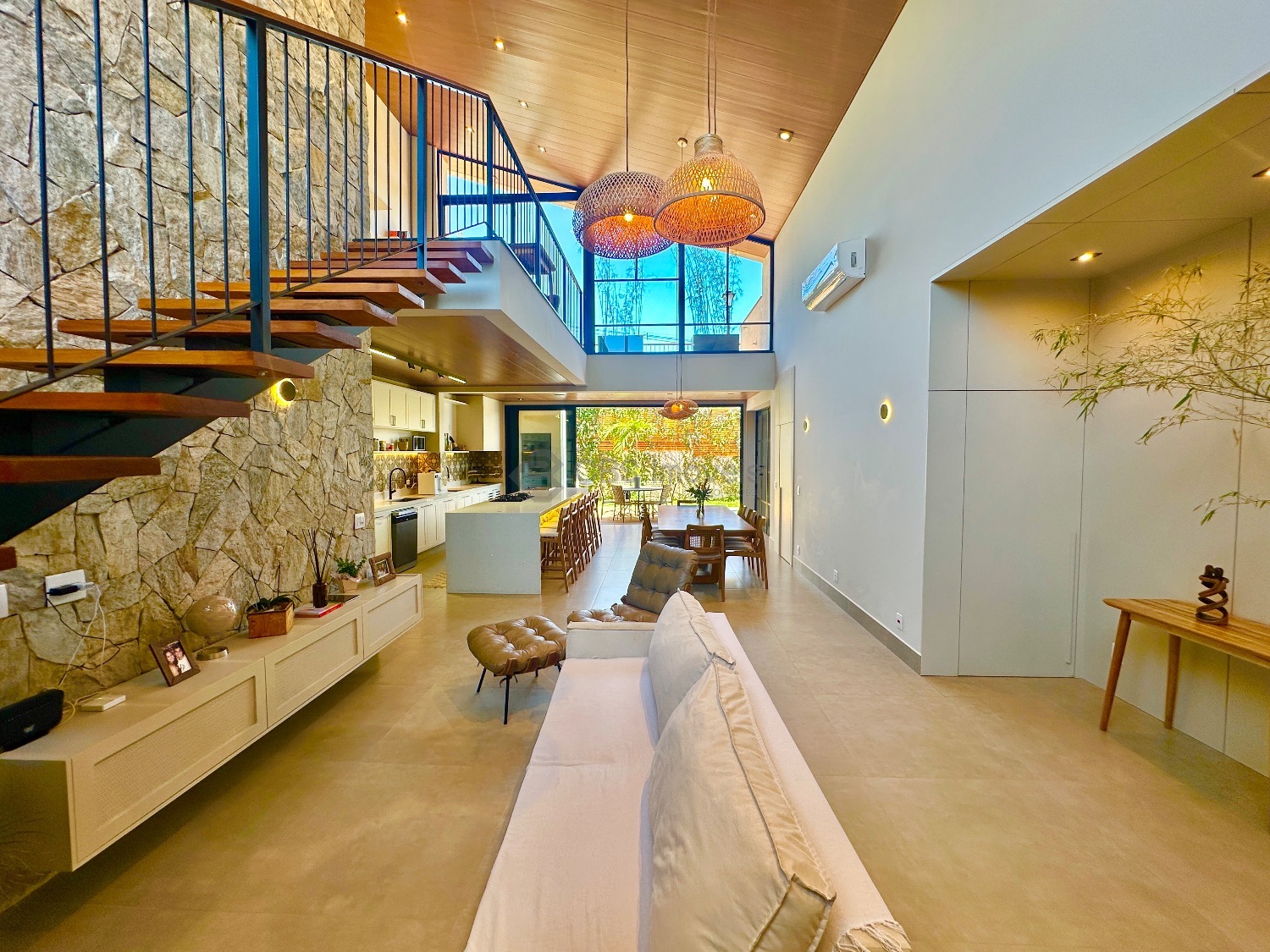 O projeto inclui ainda escritório, ideal para home office, e um living impressionante com pé-direito duplo, integrando sala de estar e jantar em um ambiente sofisticado e iluminado naturalmente.