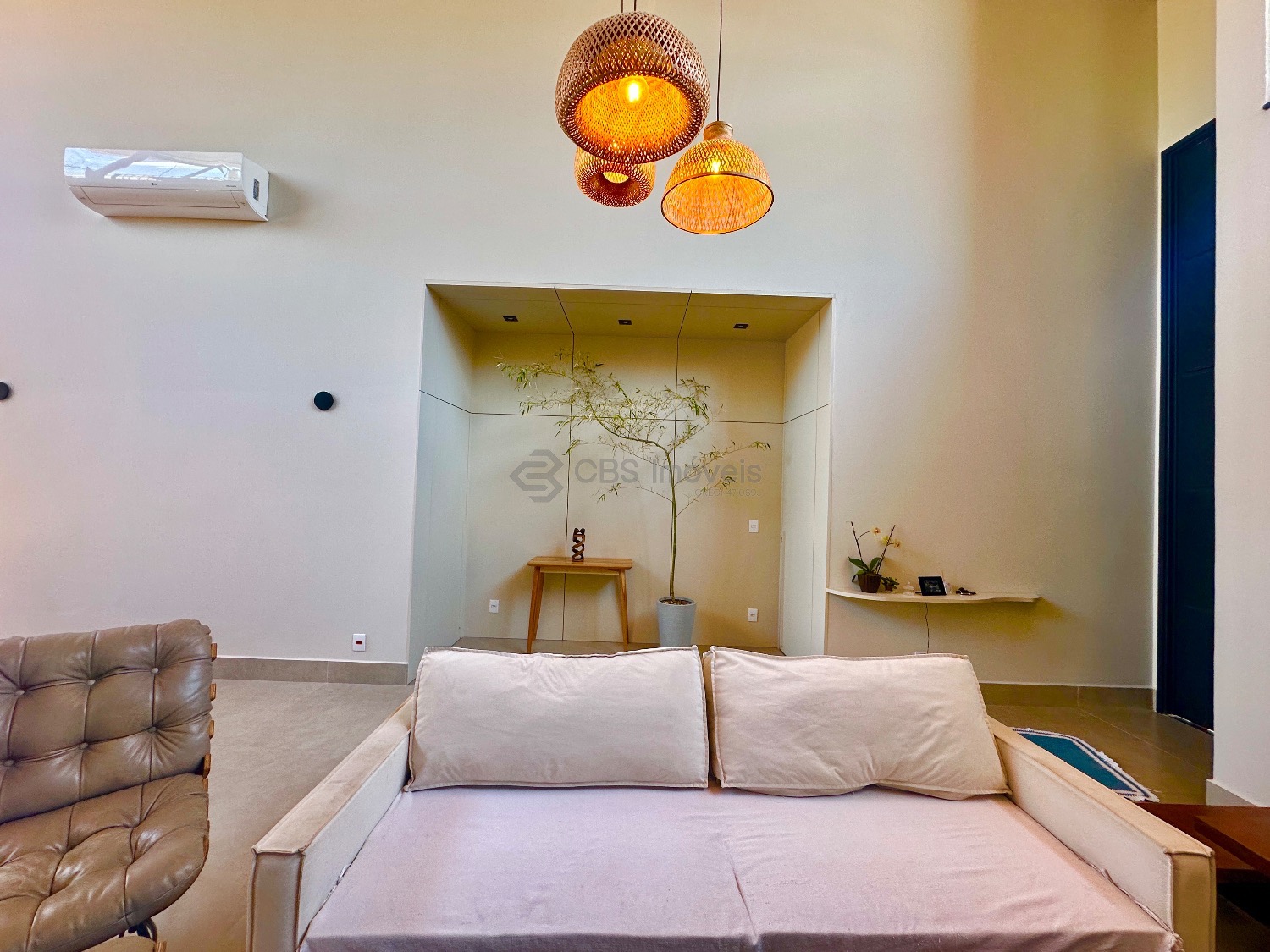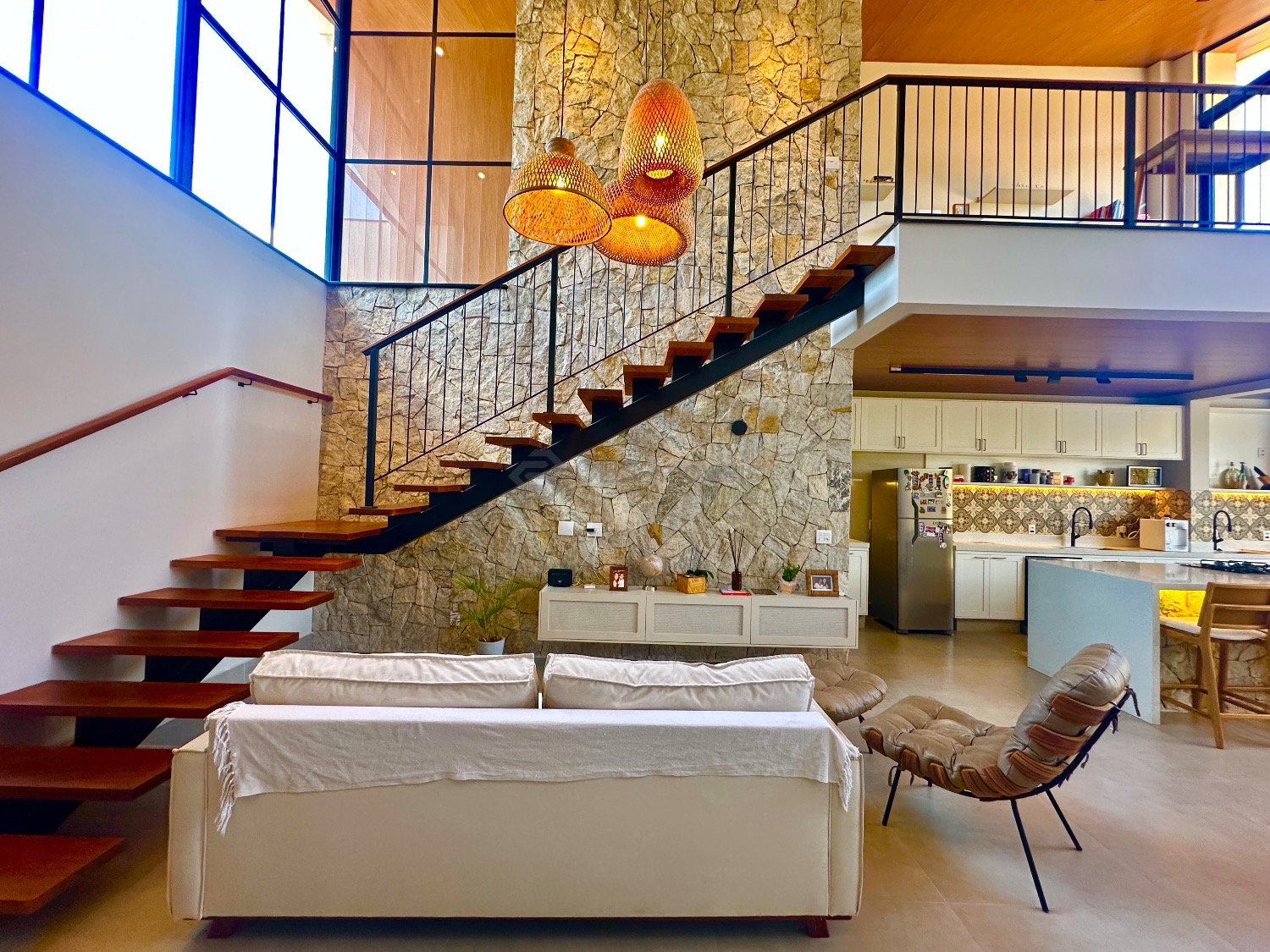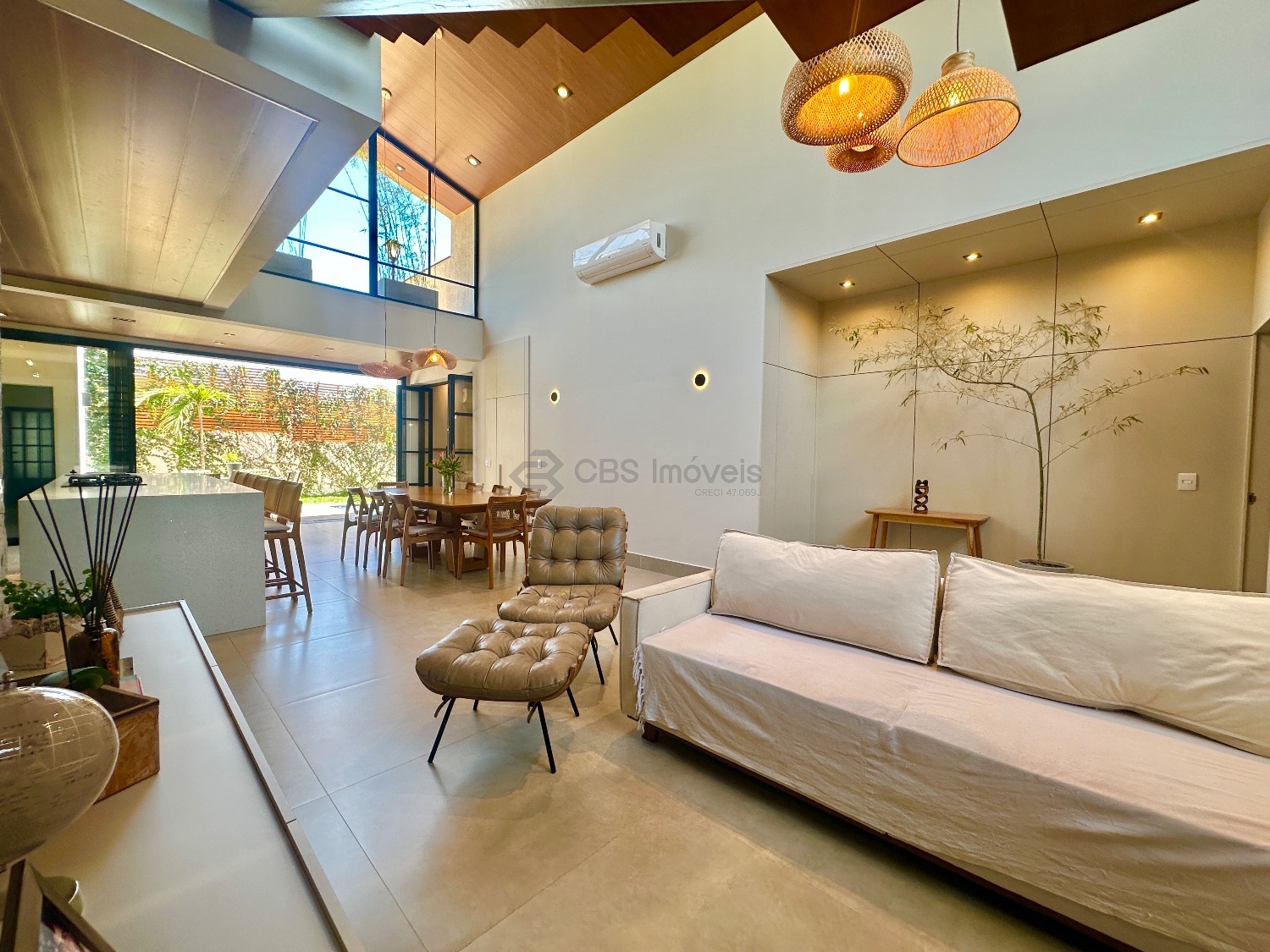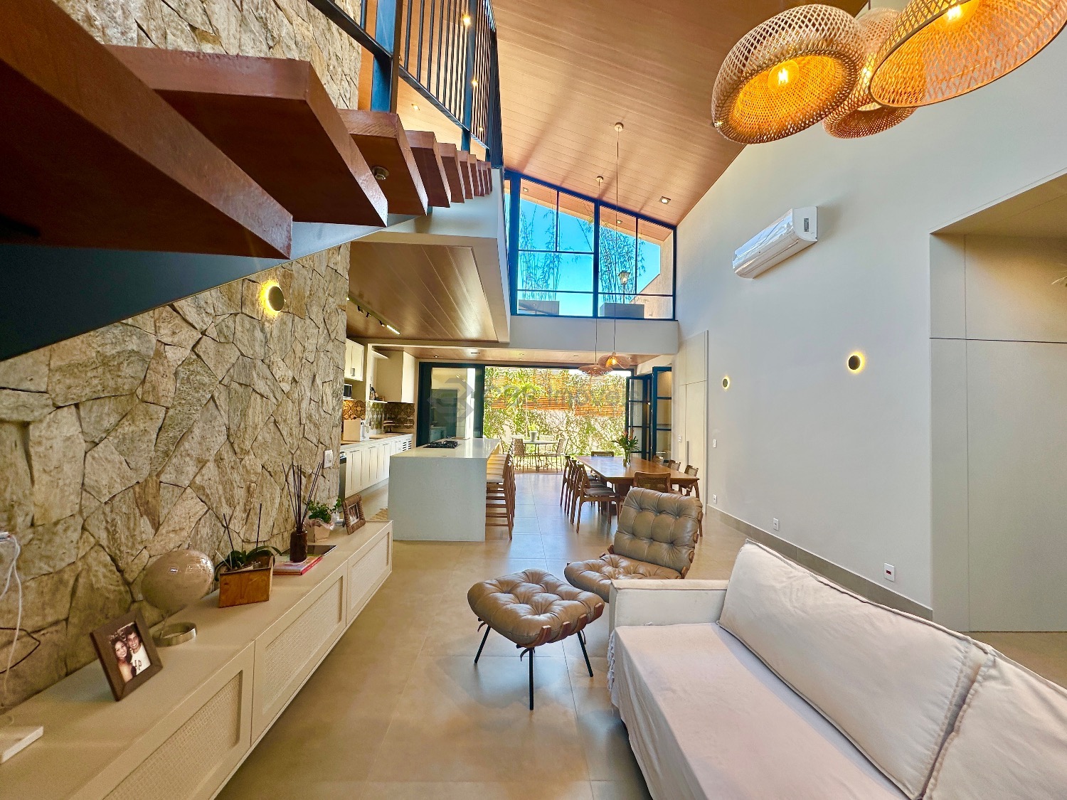 O projeto inclui ainda escritório, ideal para home office, e um living impressionante com pé-direito duplo, integrando sala de estar e jantar em um ambiente sofisticado e iluminado naturalmente.