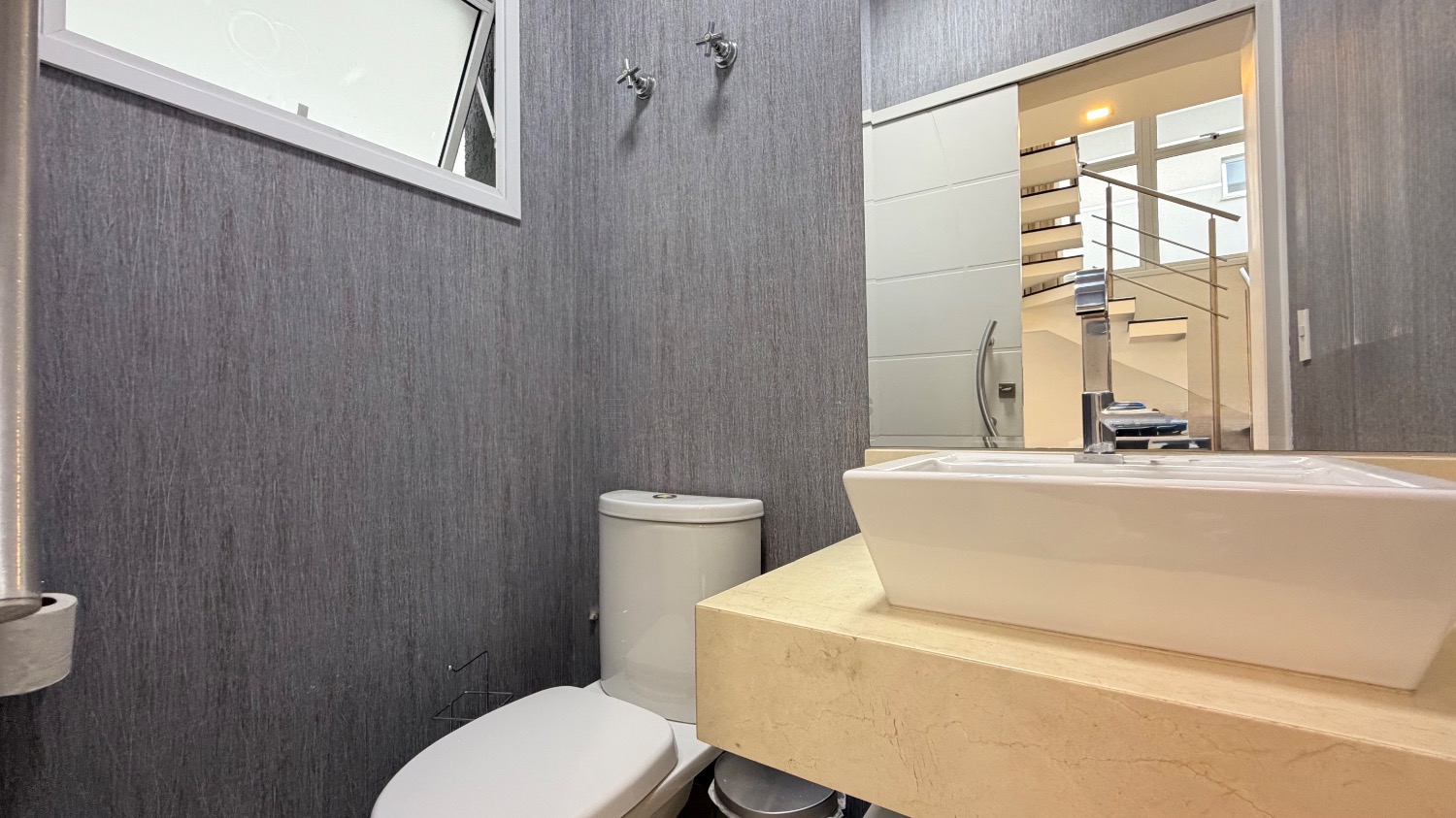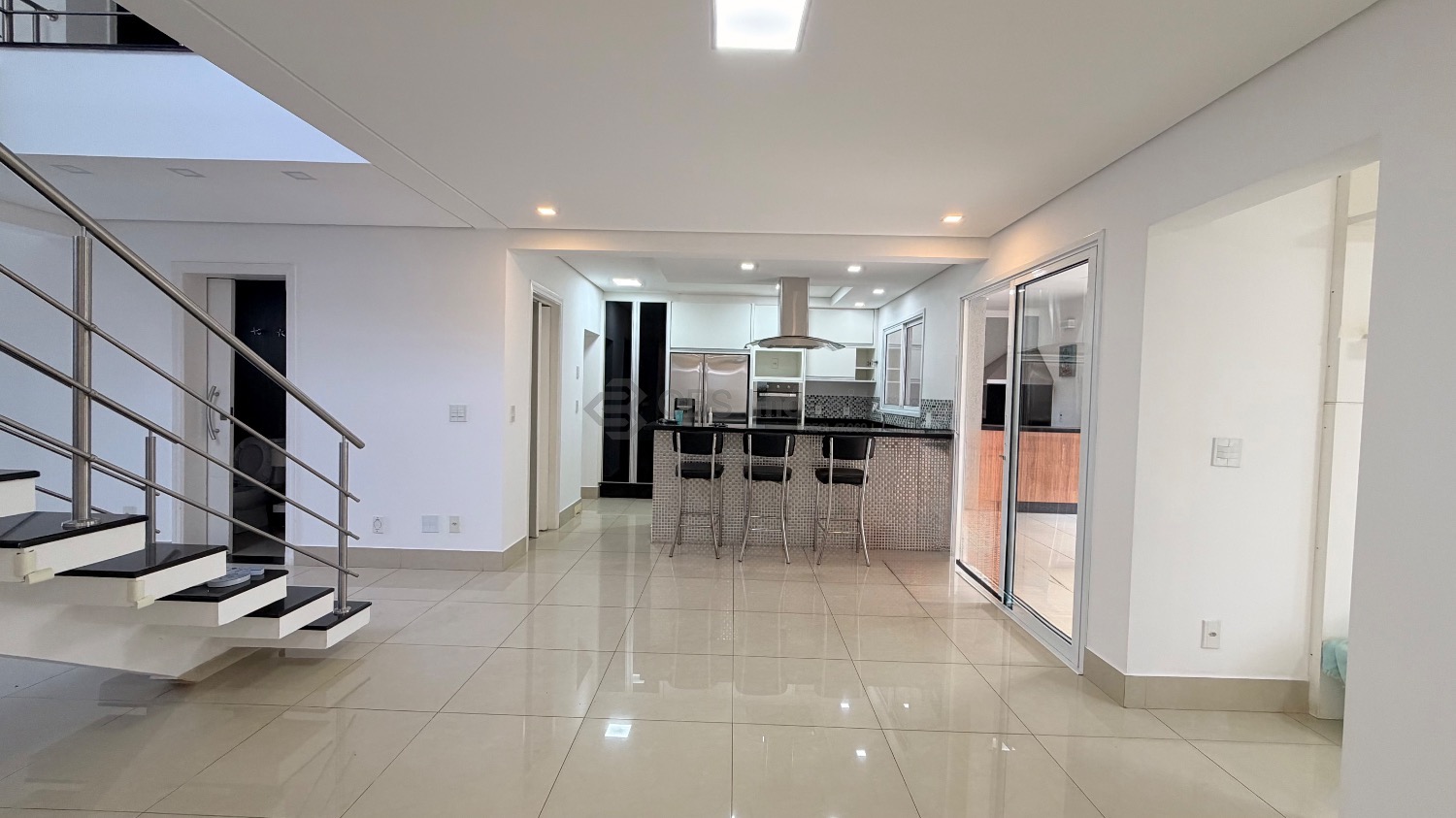No térreo possui sala para 02 ambientes com pé direito duplo e muita integração. A cozinha é tipo americana, completa com armários e ainda temos quarto/suíte reversível para home ou escritório, lavabo, lavanderia e garagem para 4 carros.