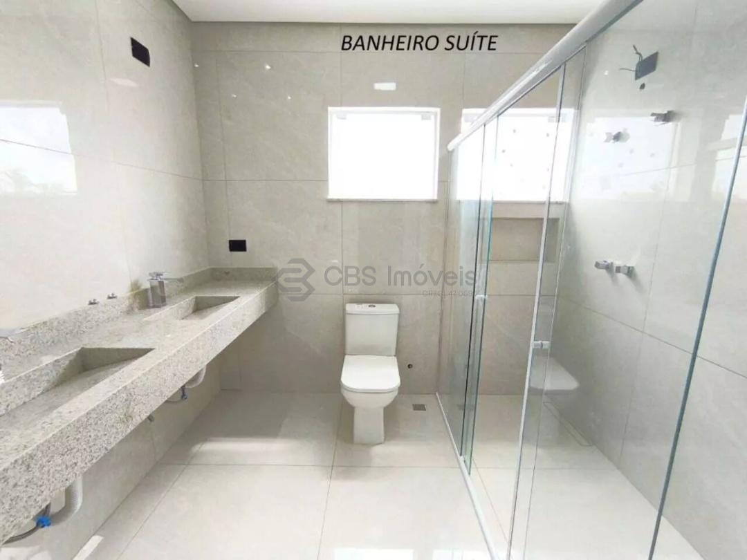 Banheiro da suíte com bancada em granito, duas cubas esculpidas, box em blindex e chuveiro duplo