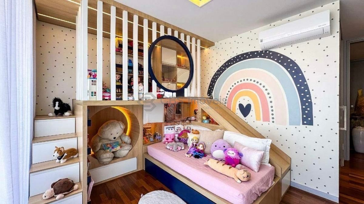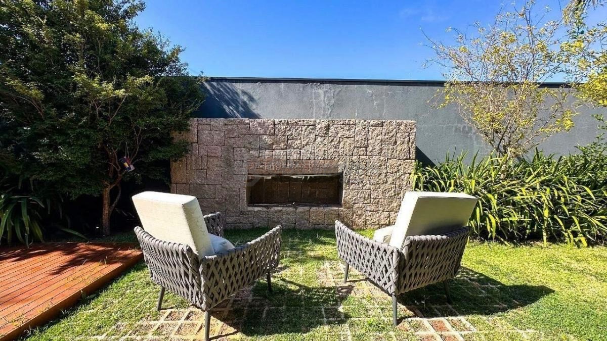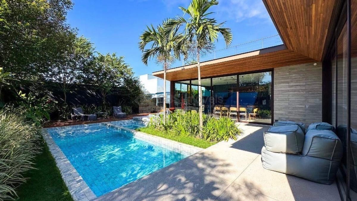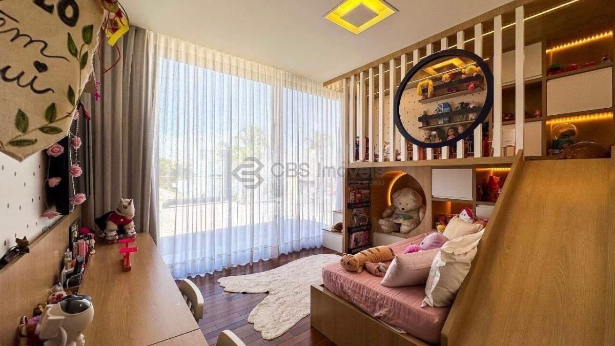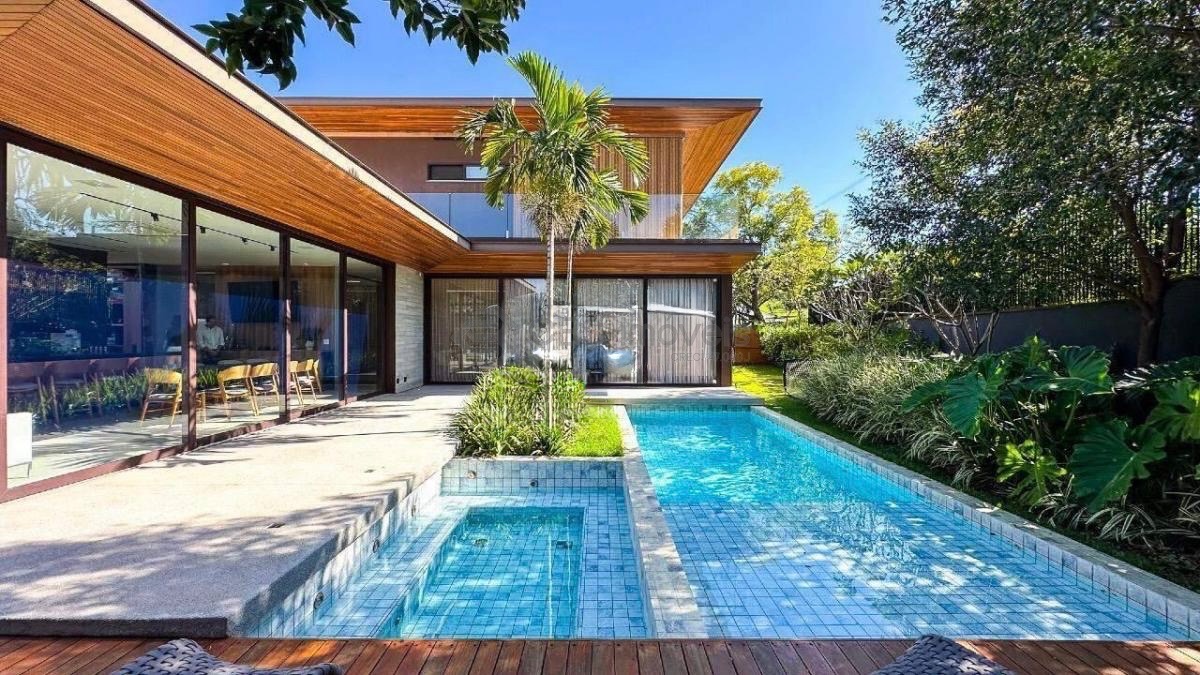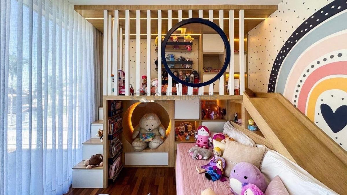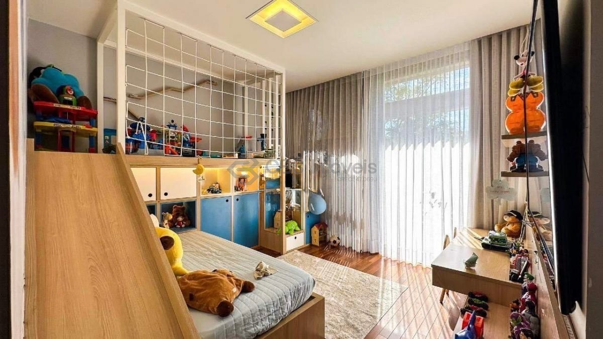 No piso térreo, a casa conta com amplo living integrado para dois ambientes, home theater, lavabo, cozinha americana planejada e área gourmet com churrasqueira, brinquedoteca e banheiro de apoio. O espaço externo é encantador, com lindo quintal, piscina com prainha, hidromassagem aquecida e espaço com lareira. Possui ainda área de serviço completa, depósitos, banheiro de serviço e quarto para funcionário.