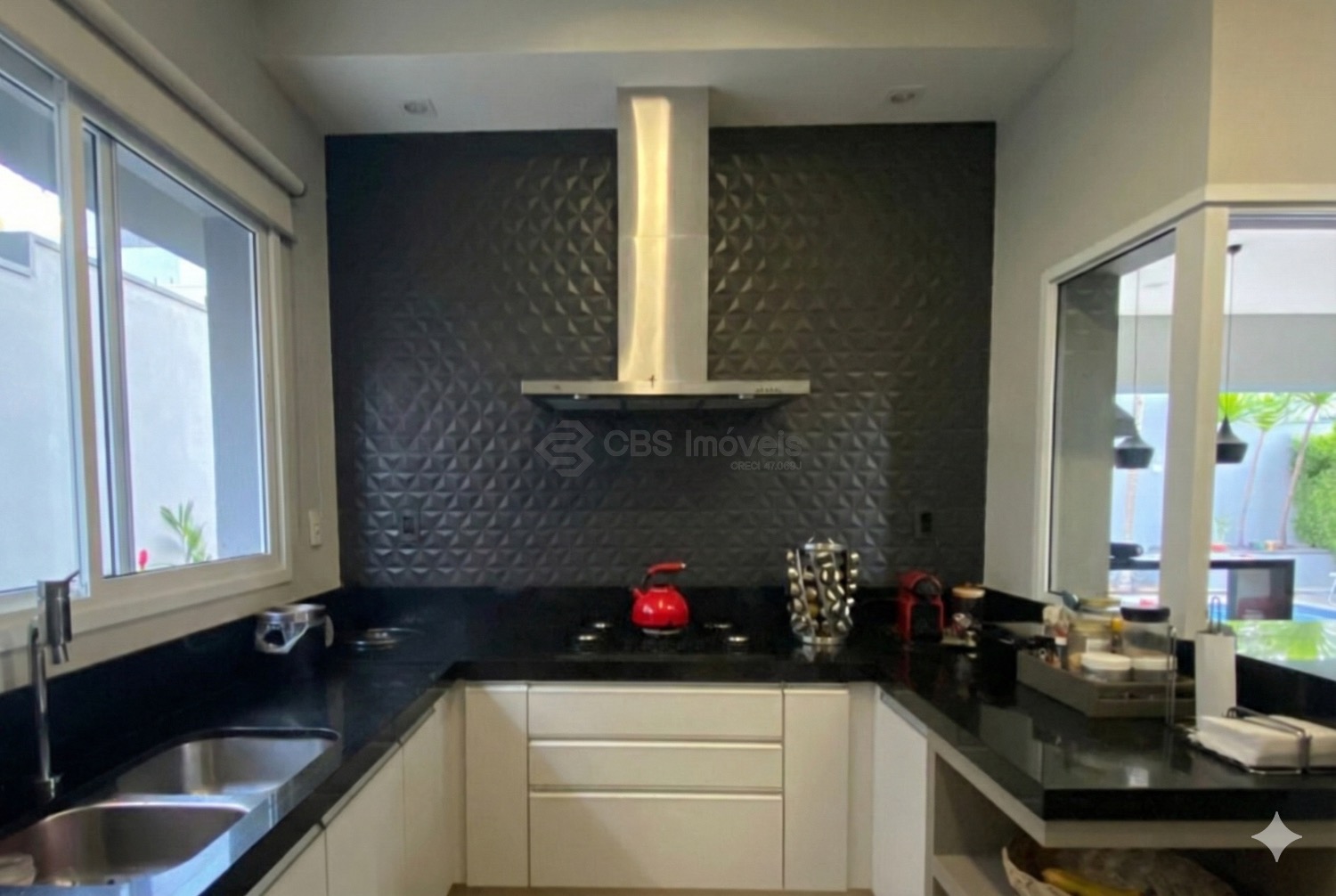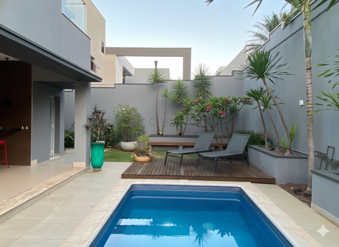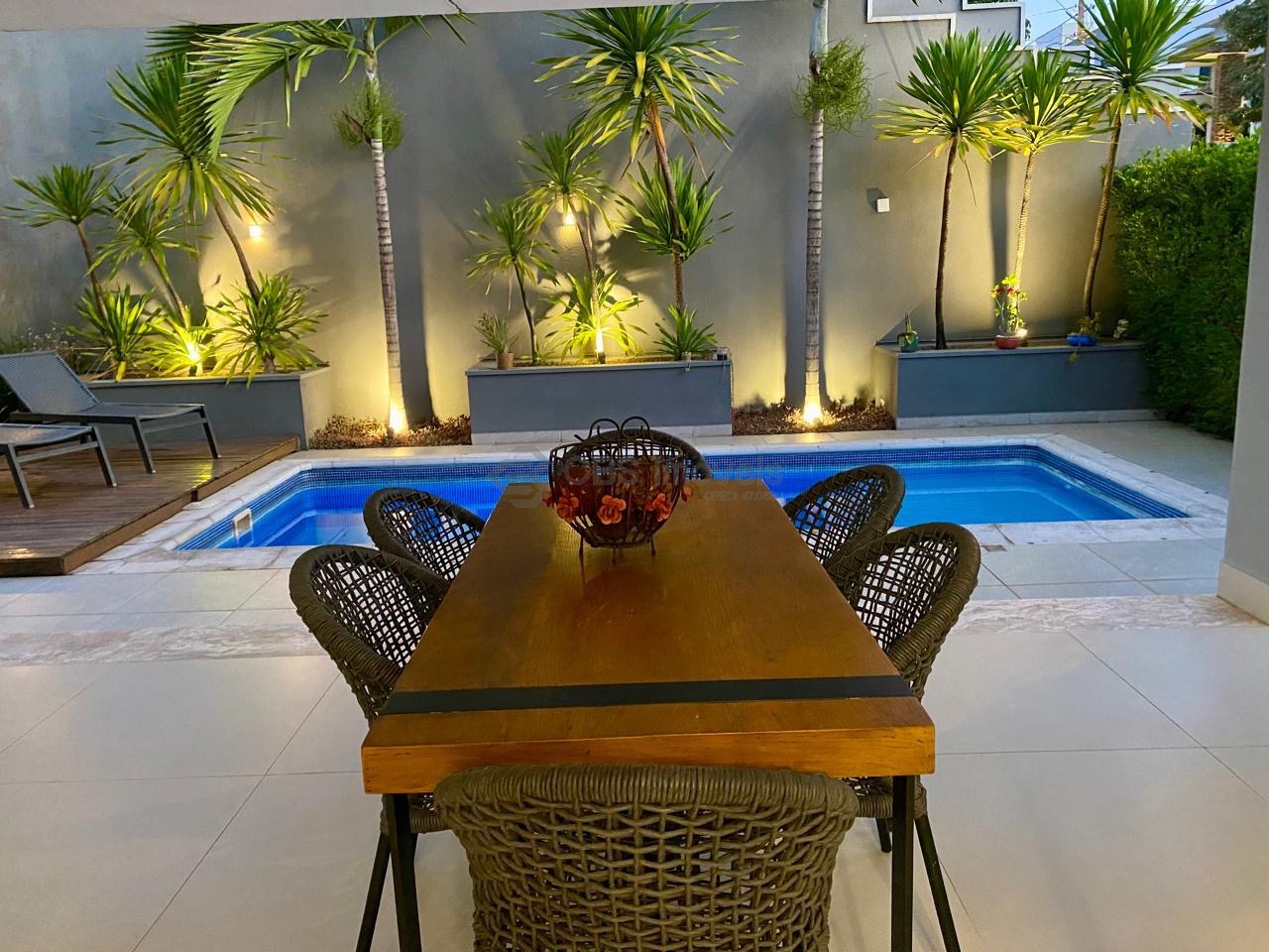 A cozinha planejada é funcional e iluminada, com marcenaria moderna, despensa espaçosa e lavanderia reservada com banheiro de apoio. A varanda gourmet é um dos grandes diferenciais do imóvel, equipada com pia, coifa, fogão de apoio, churrasqueira e armários, integrada ao quintal com paisagismo e piscina aquecida, além de banheiro externo para maior praticidade.