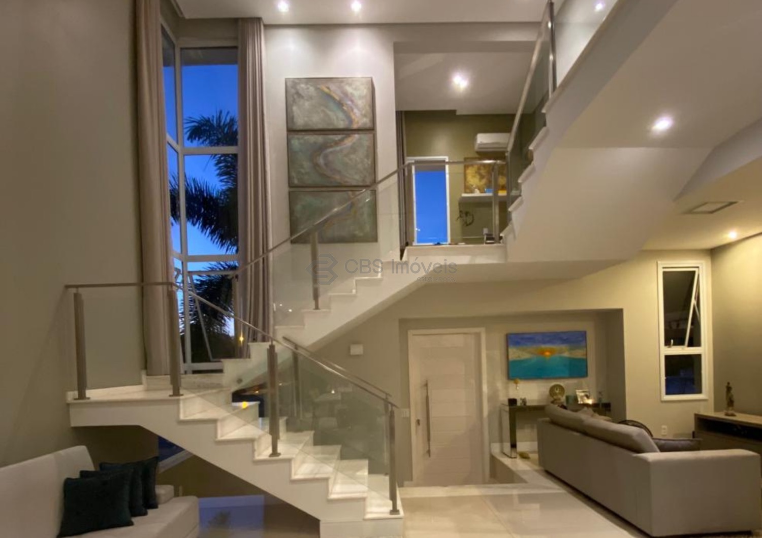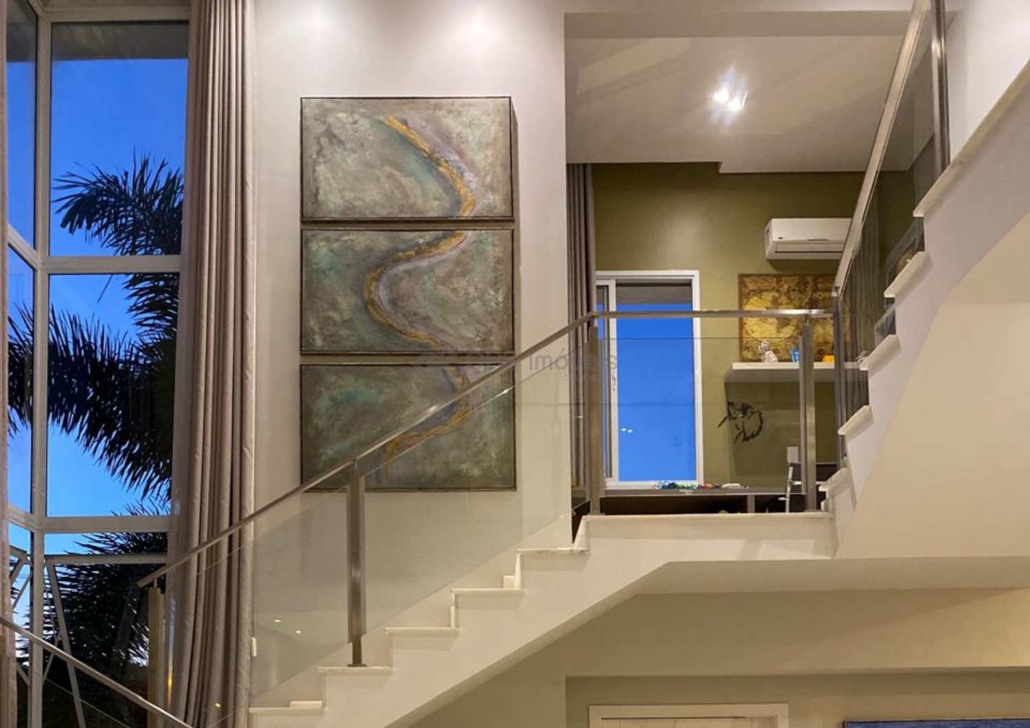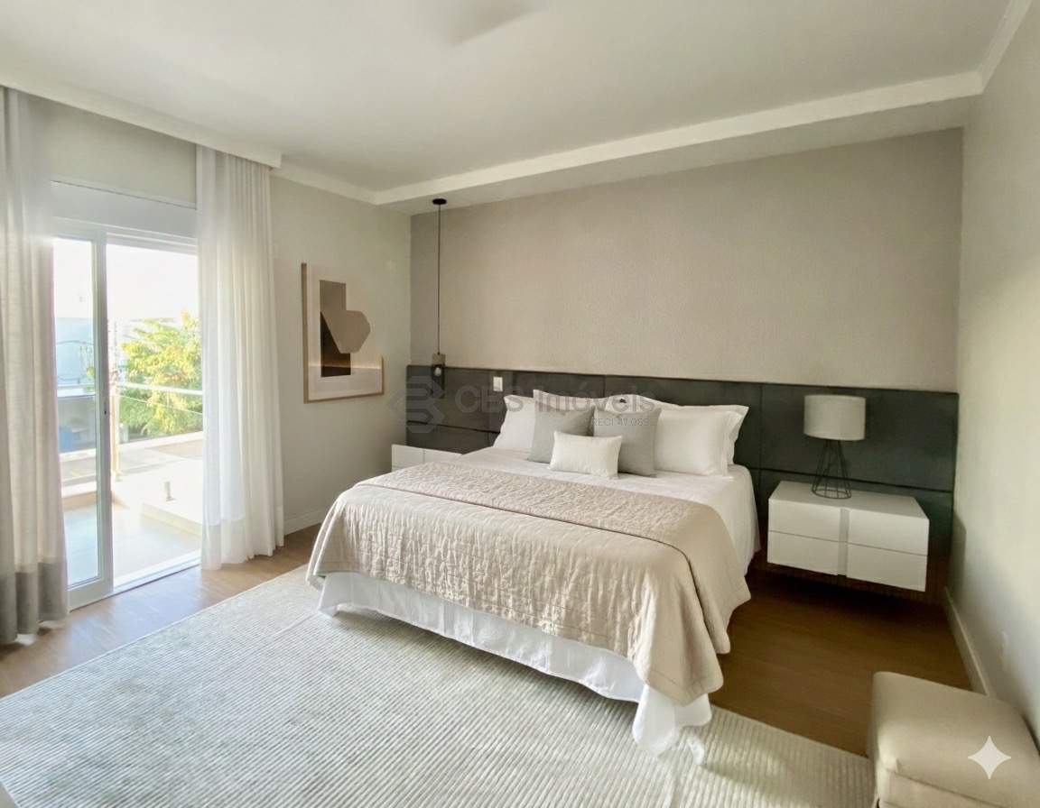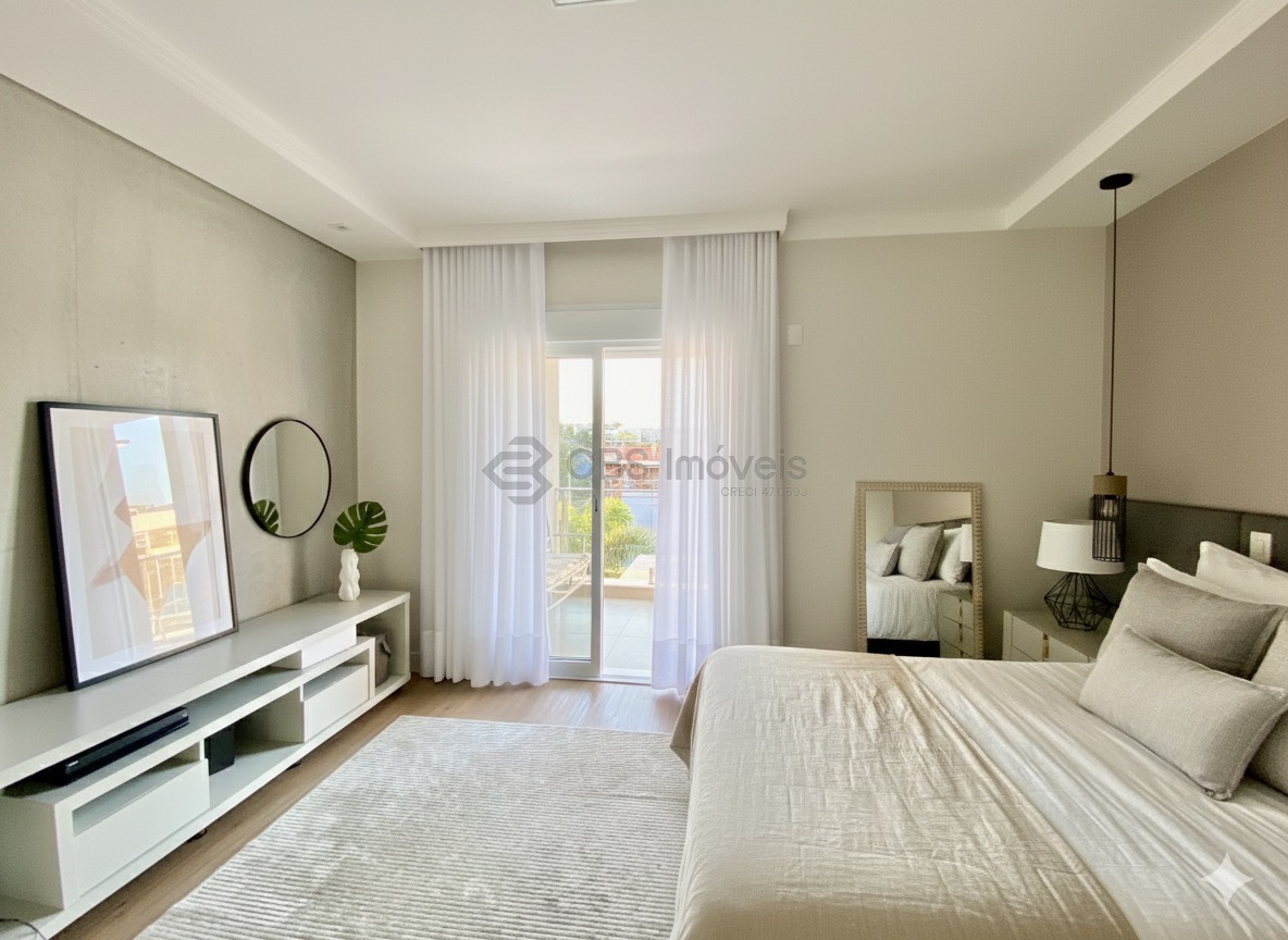 O imóvel conta ainda com escritório mobiliado, ar-condicionado e pé-direito duplo, ideal para home office. No piso superior, um roupeiro no corredor organiza a circulação e dá acesso aos três quartos, todos suítes, com ar-condicionado, varanda, persianas automatizadas e excelentes armários. A suíte master oferece closet espaçoso e banheiro com banheira dupla de hidromassagem, duas cubas e duas duchas. O piso vinílico nos quartos proporciona aconchego e um toque contemporâneo.