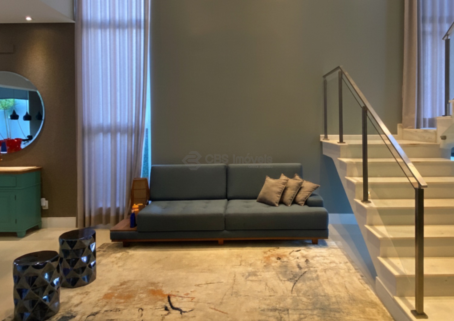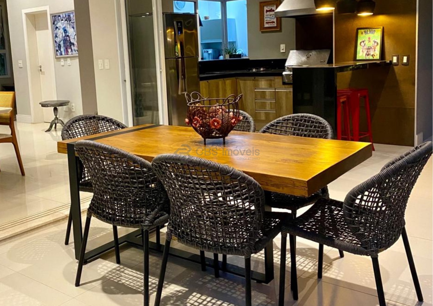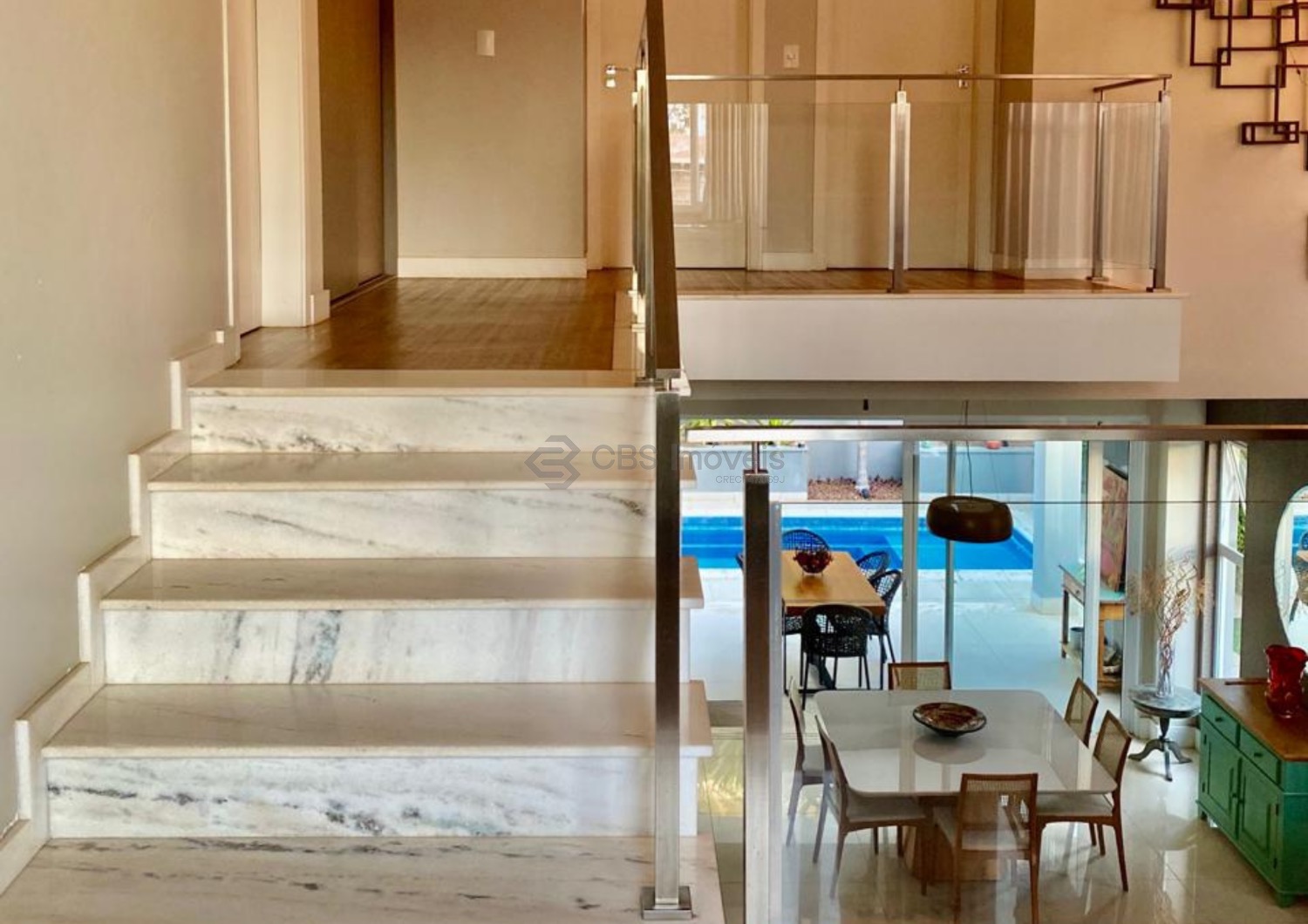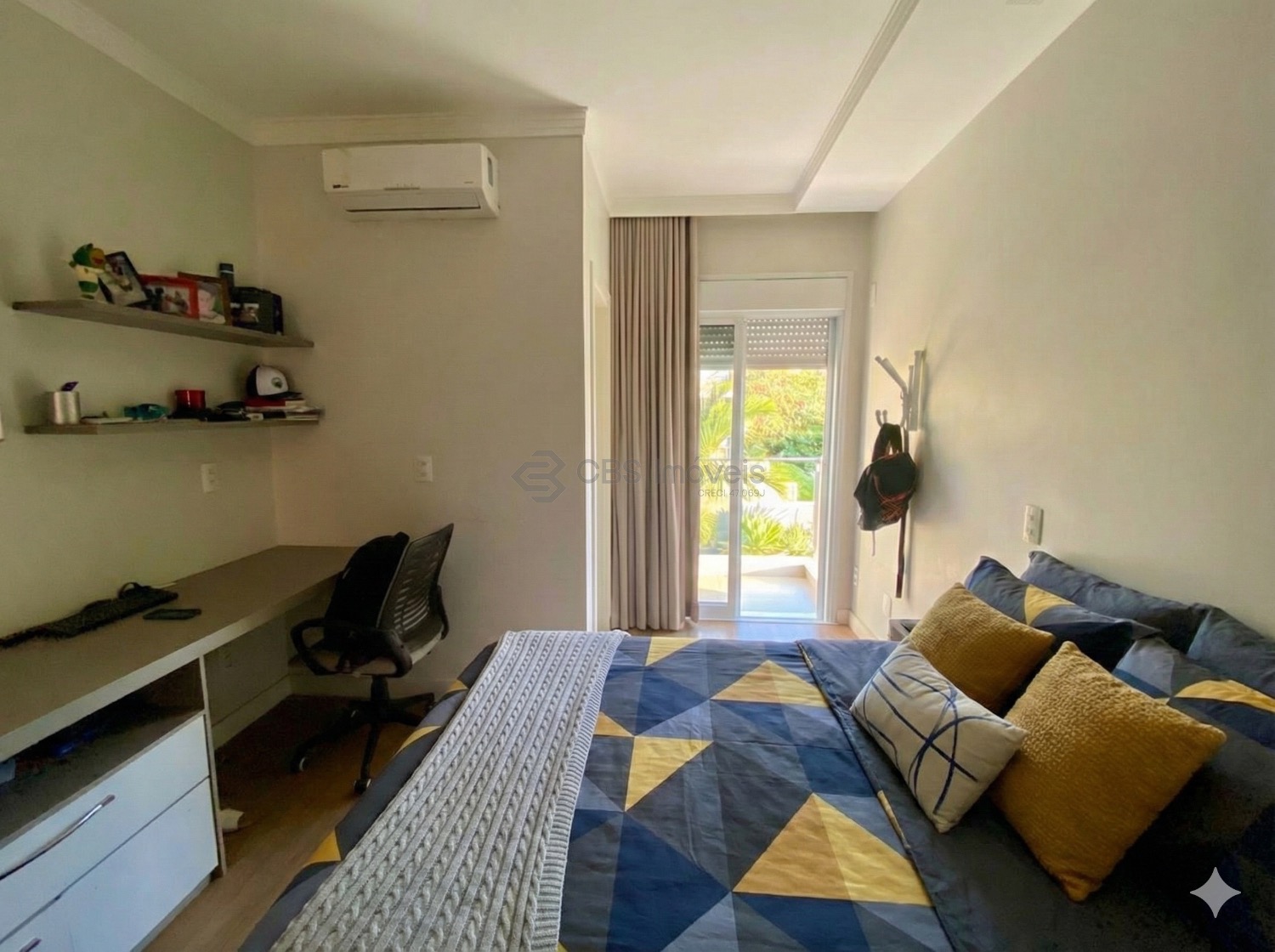O imóvel conta ainda com escritório mobiliado, ar-condicionado e pé-direito duplo, ideal para home office. No piso superior, um roupeiro no corredor organiza a circulação e dá acesso aos três quartos, todos suítes, com ar-condicionado, varanda, persianas automatizadas e excelentes armários. A suíte master oferece closet espaçoso e banheiro com banheira dupla de hidromassagem, duas cubas e duas duchas. O piso vinílico nos quartos proporciona aconchego e um toque contemporâneo.