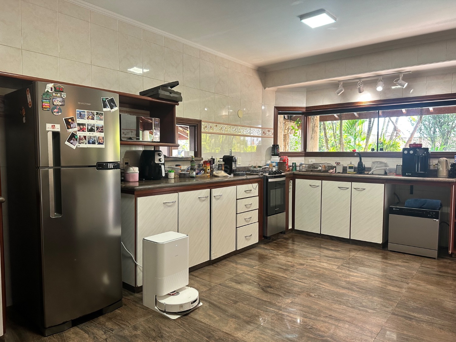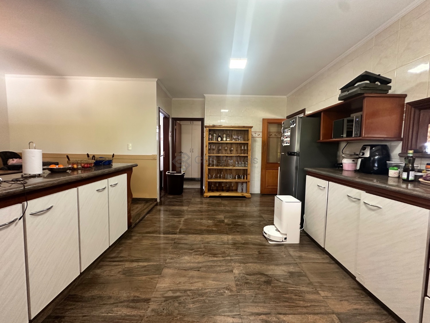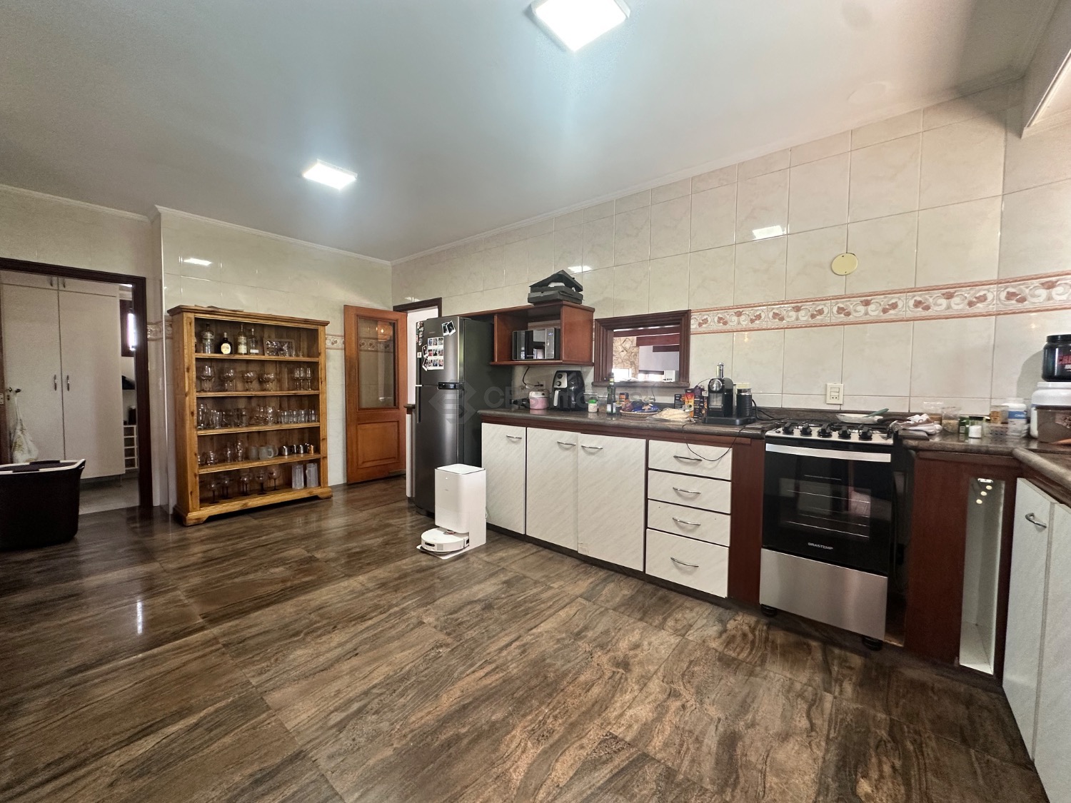 A cozinha é convidativa e espaçosa, pensada para quem gosta de viver a casa no dia a dia, e se conecta à sala de almoço, criando um ambiente perfeito para momentos em família. O imóvel ainda conta com lavabo, escritório, depósito, vestiários e dormitório de apoio para auxiliar, trazendo praticidade para a rotina.