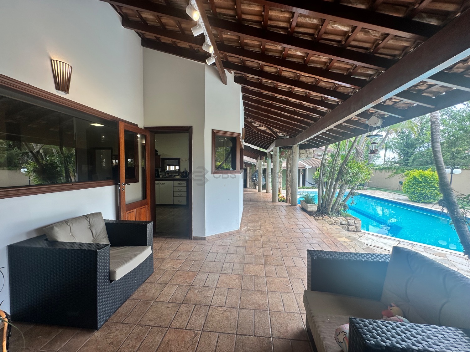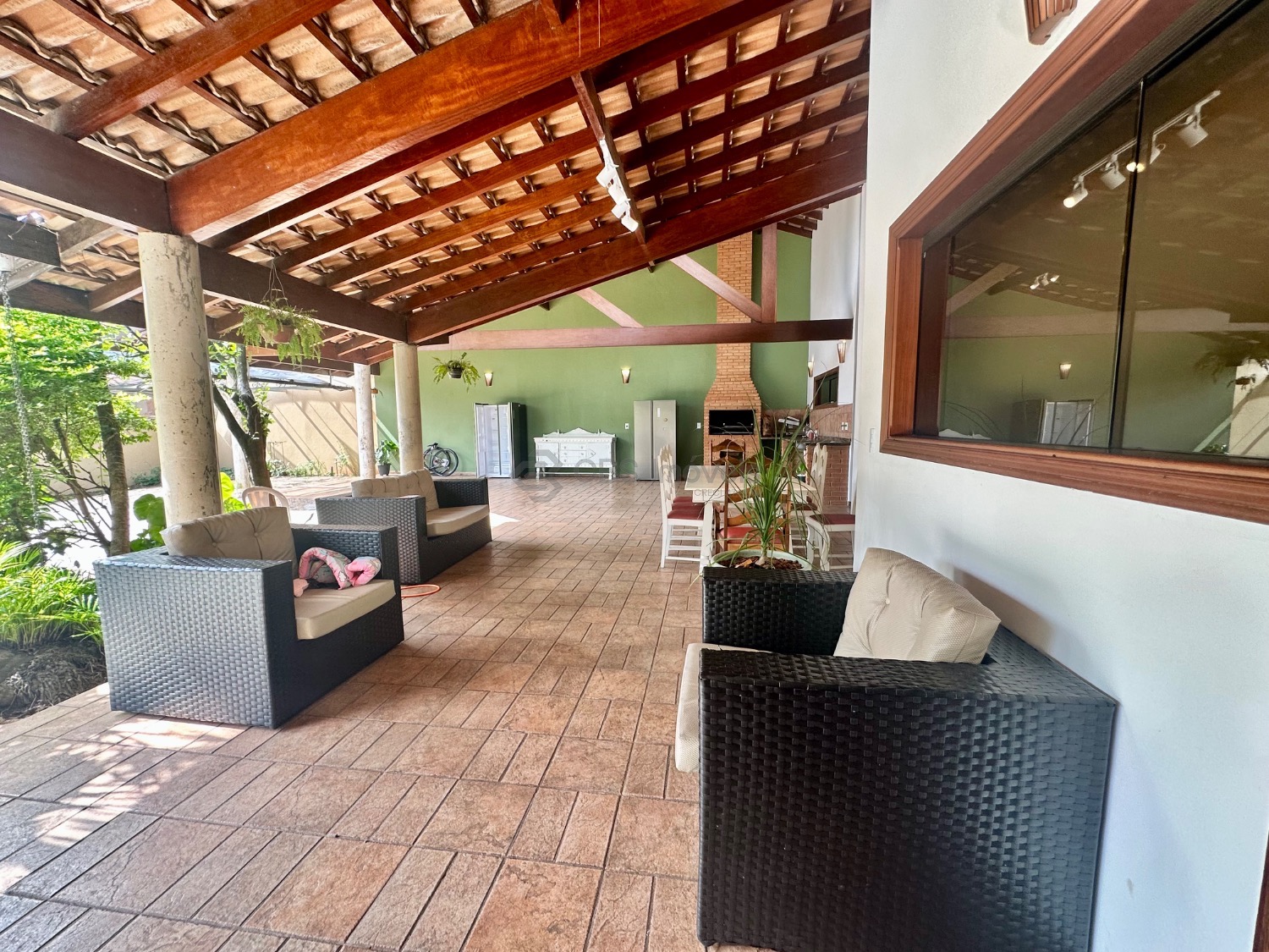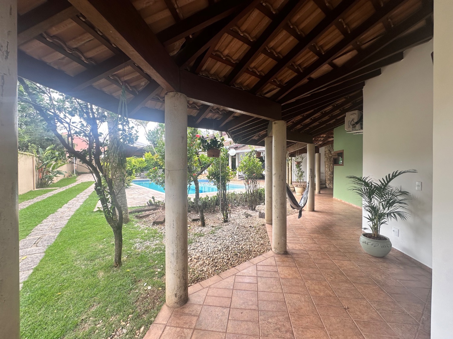 Um dos grandes charmes da casa é a varanda aconchegante posicionada na parte frontal, um espaço com churrasqueira, vestiário e muito espaço, ideal para desacelerar, apreciar a vista e aproveitar com tranquilidade.