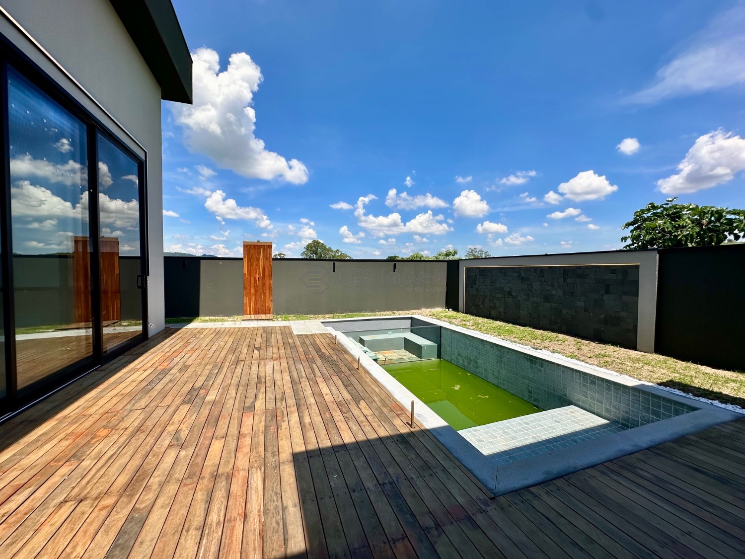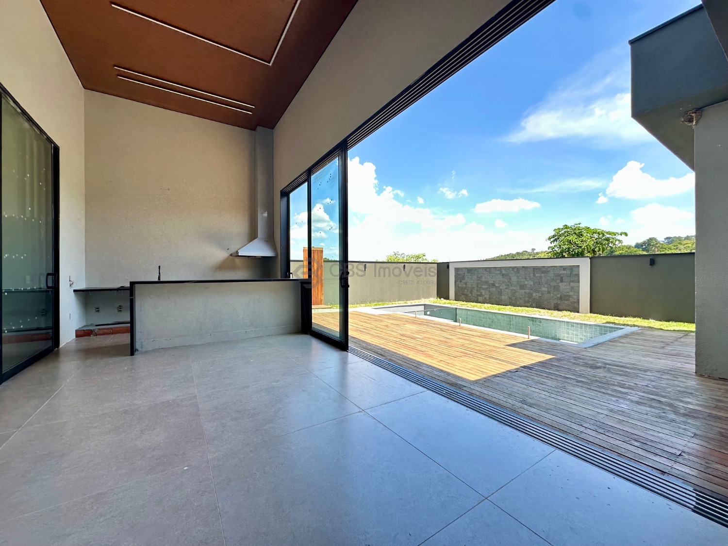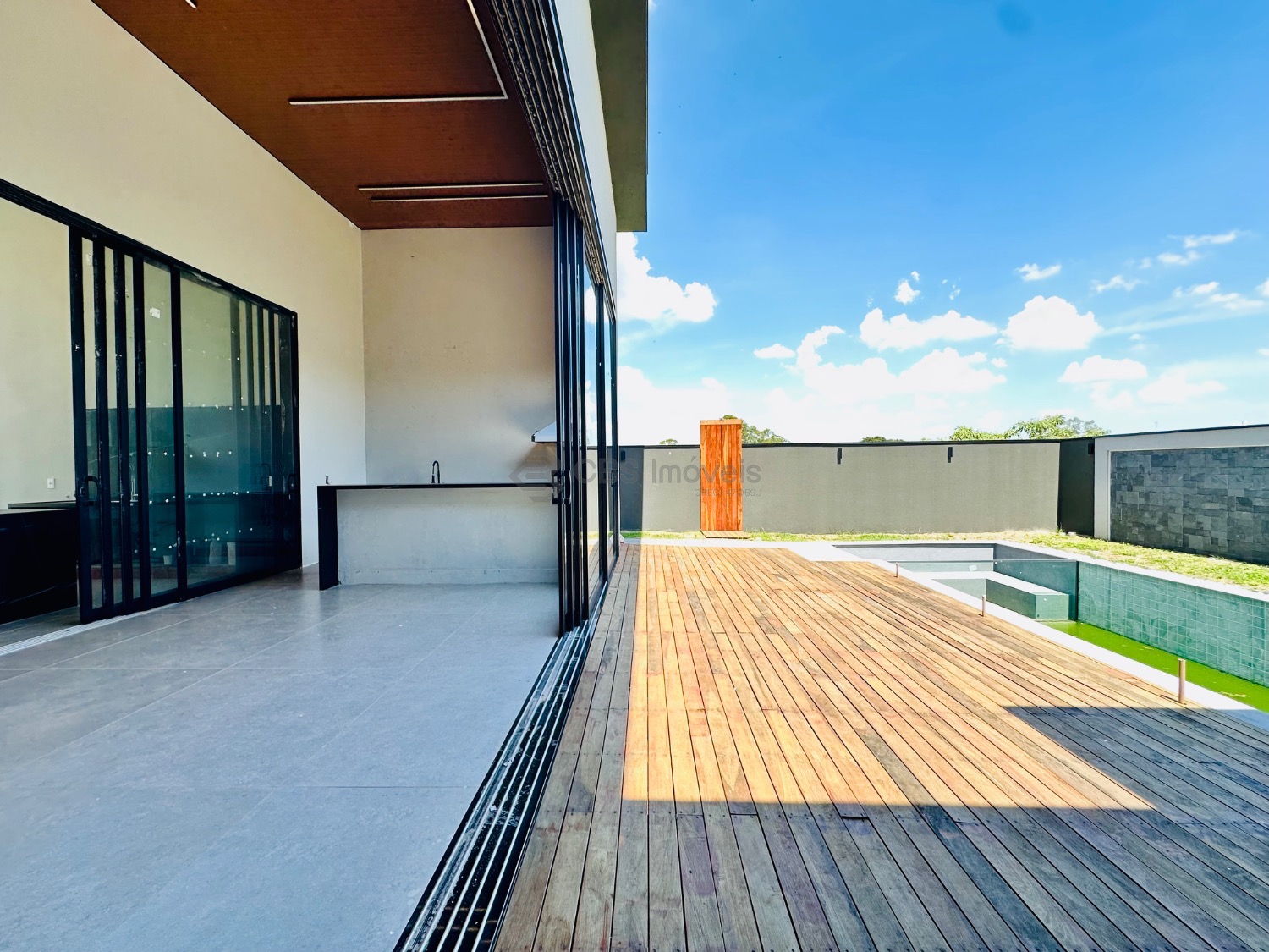 A área externa é um dos grandes diferenciais do imóvel, com um espaço pensado para viver momentos únicos. A piscina com prainha ganha destaque pelo detalhe em vidro, que traz um toque contemporâneo e sofisticado ao projeto, além de um fire place ao lado, ideal para criar um ambiente acolhedor e exclusivo, tanto de dia quanto à noite.