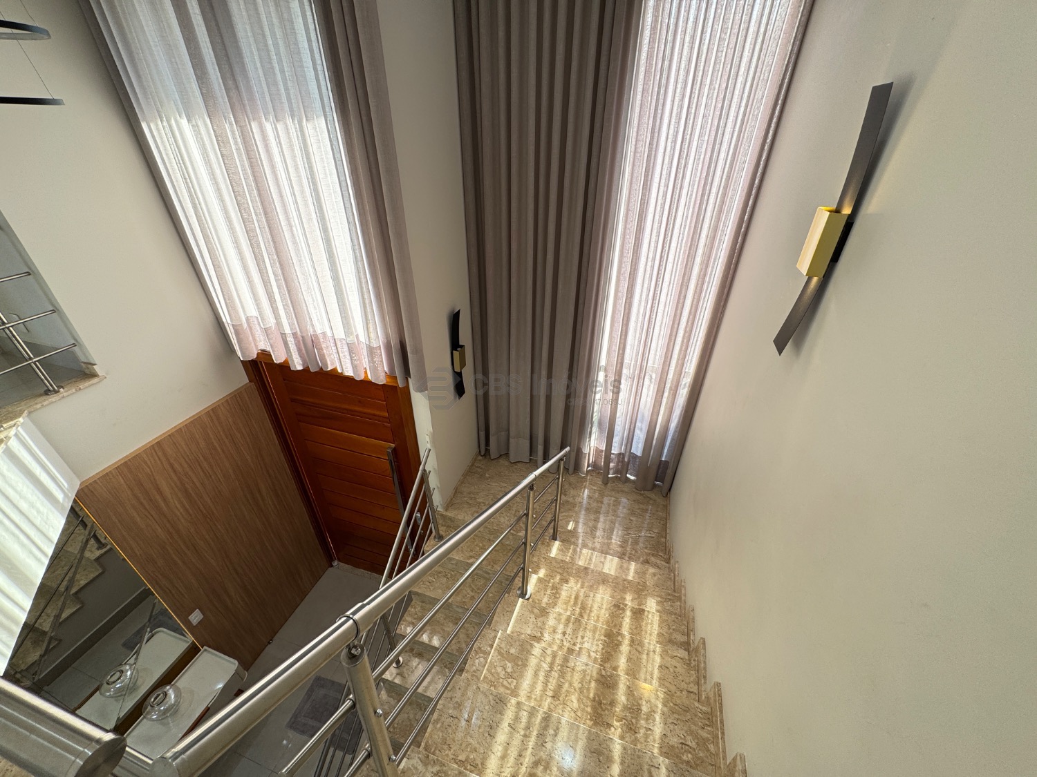 No pavimento superior, a casa dispõe de 3 suítes, todas com infraestrutura para ar-condicionado. A suíte master conta com closet, e o corredor oferece acesso a uma varanda com uma vista encantadora.