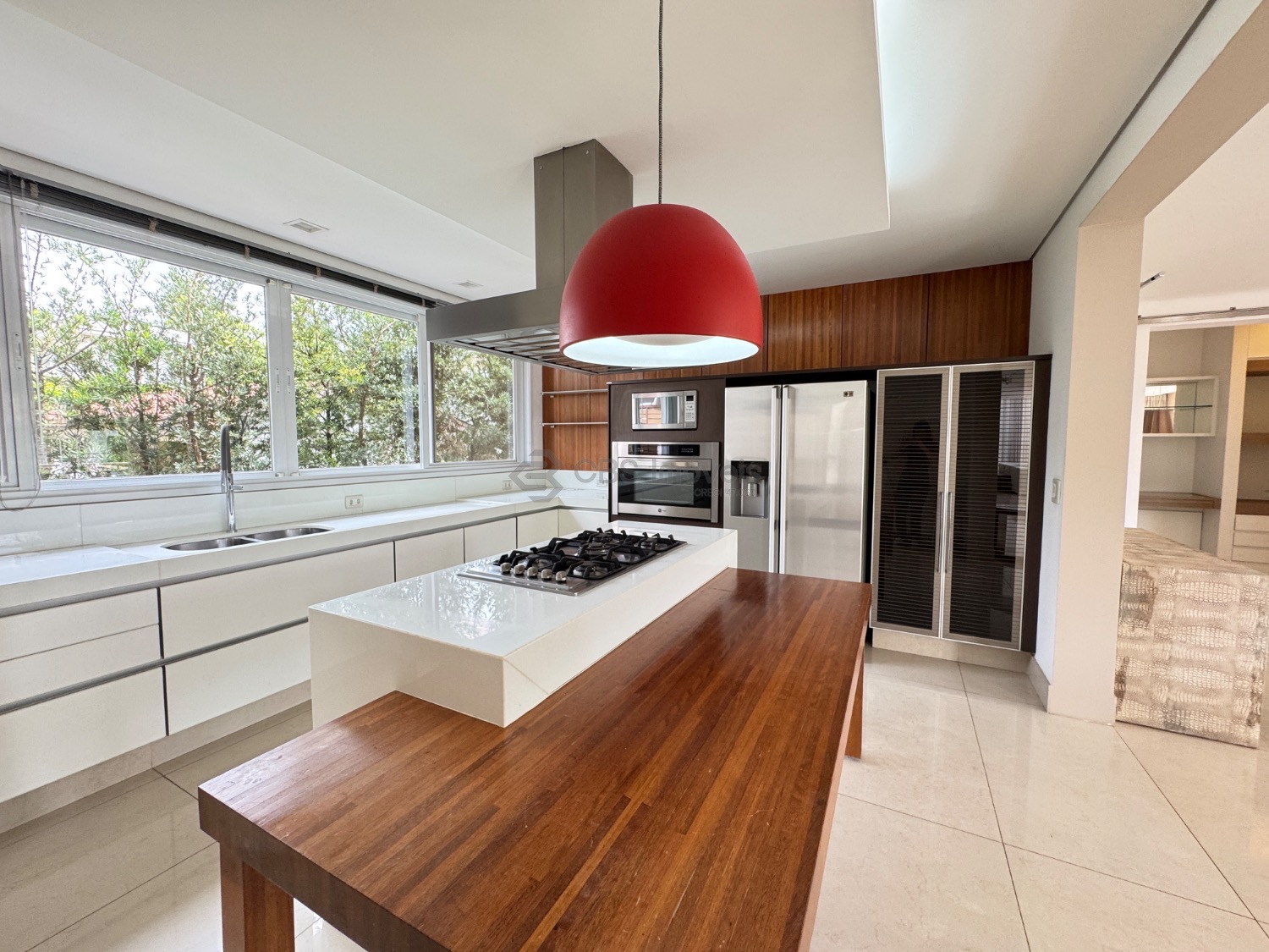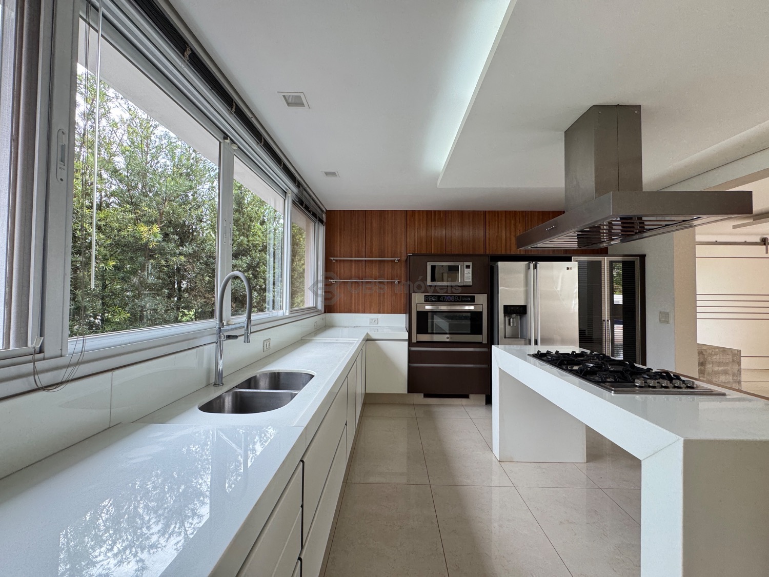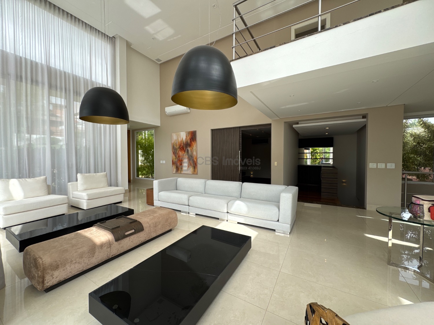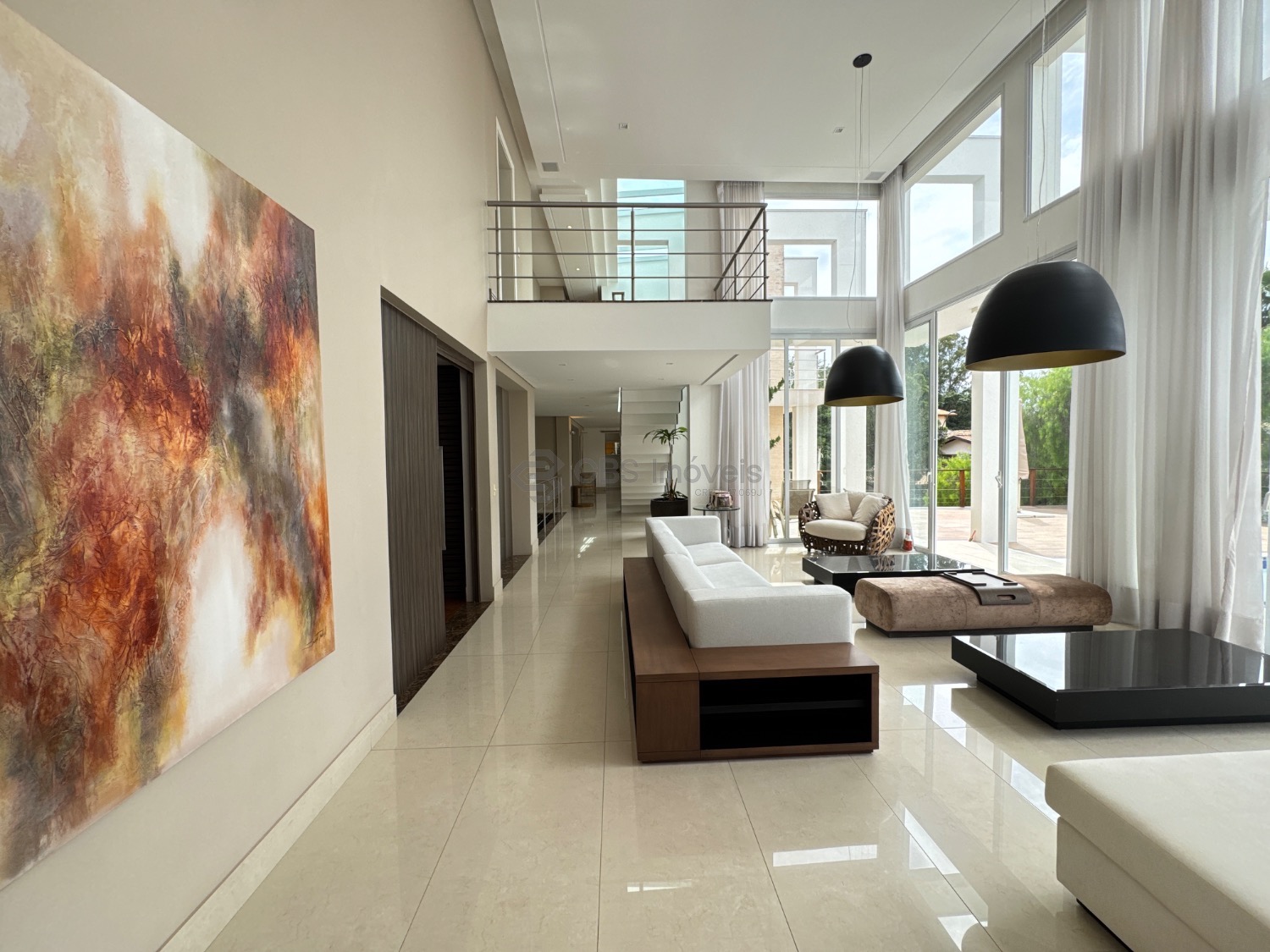 O hall de entrada imponente dá acesso a uma elegante sala de estar com pé-direito duplo, integrada à sala de jantar, que proporciona uma vista deslumbrante. Conta ainda com um sofisticado home theater automatizado, bar, escritório (reversível para suíte) e uma cozinha planejada completa, além de lavanderia, despensa e dependência de serviço.