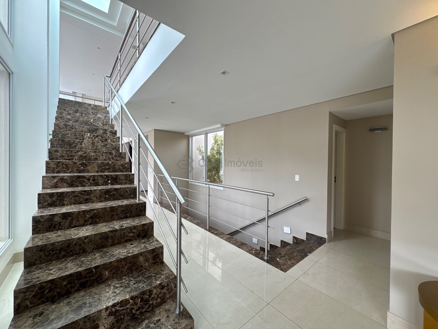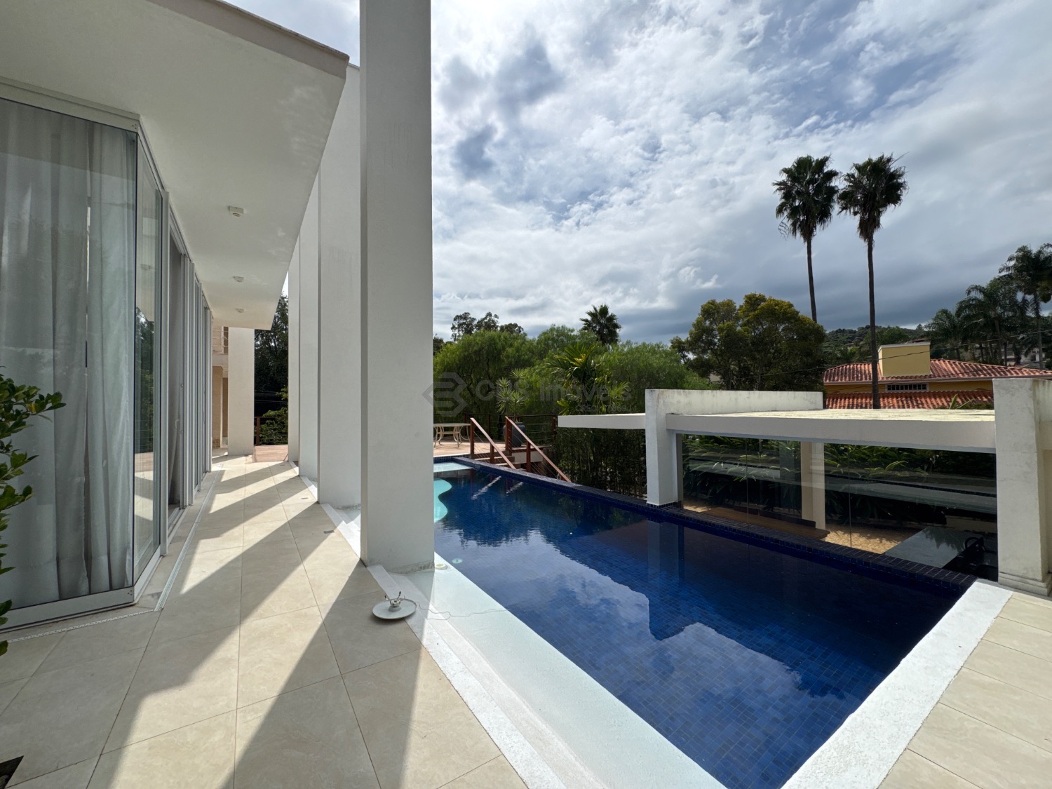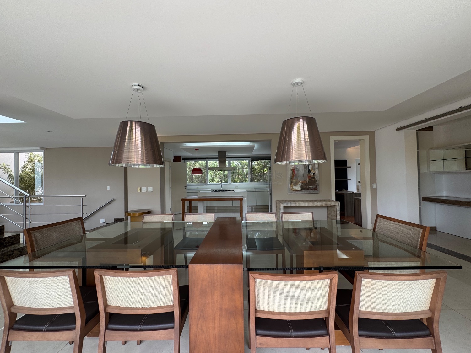 O hall de entrada imponente dá acesso a uma elegante sala de estar com pé-direito duplo, integrada à sala de jantar, que proporciona uma vista deslumbrante. Conta ainda com um sofisticado home theater automatizado, bar, escritório (reversível para suíte) e uma cozinha planejada completa, além de lavanderia, despensa e dependência de serviço.