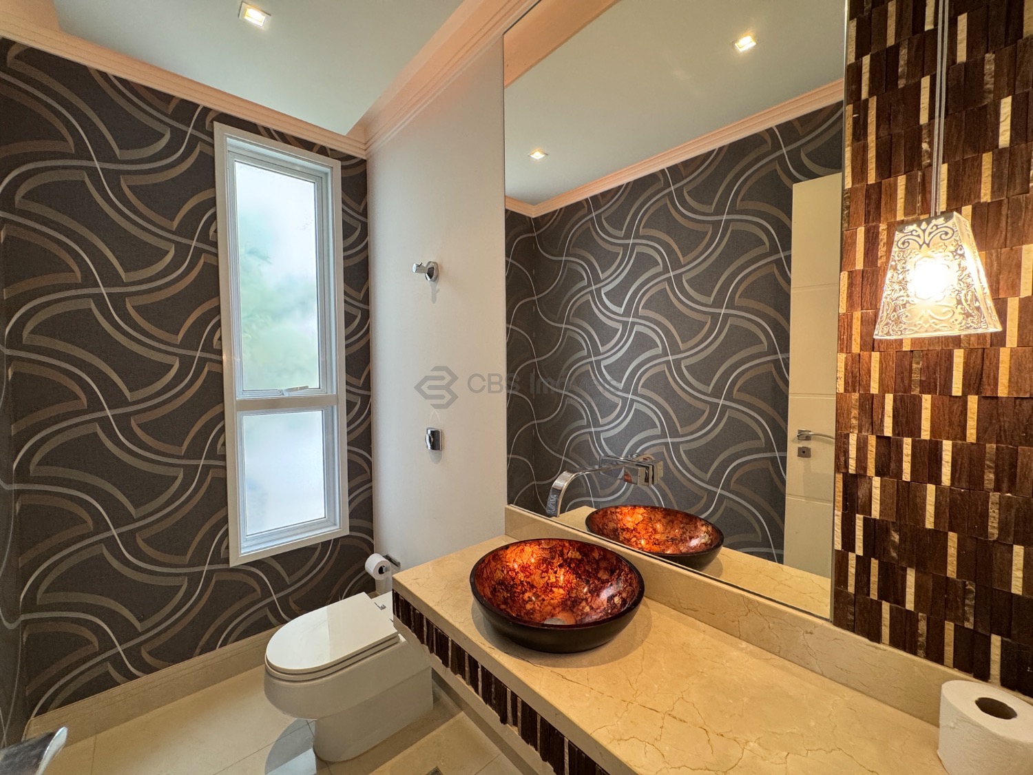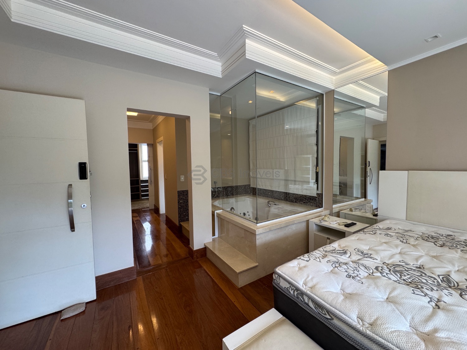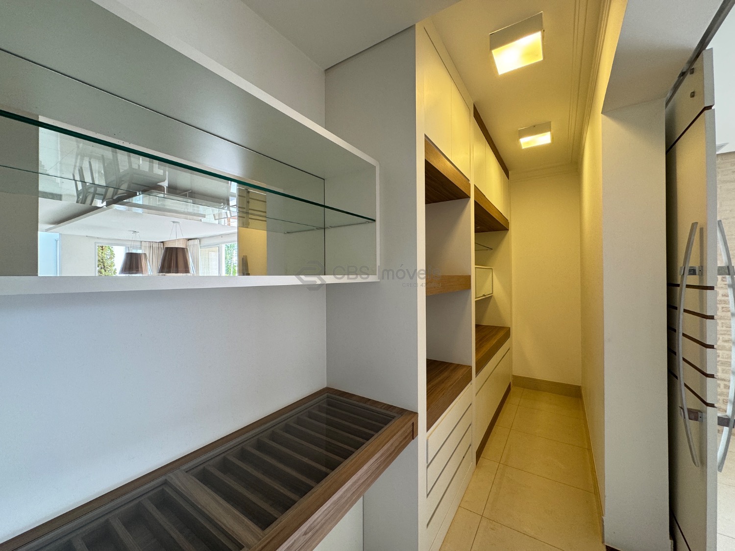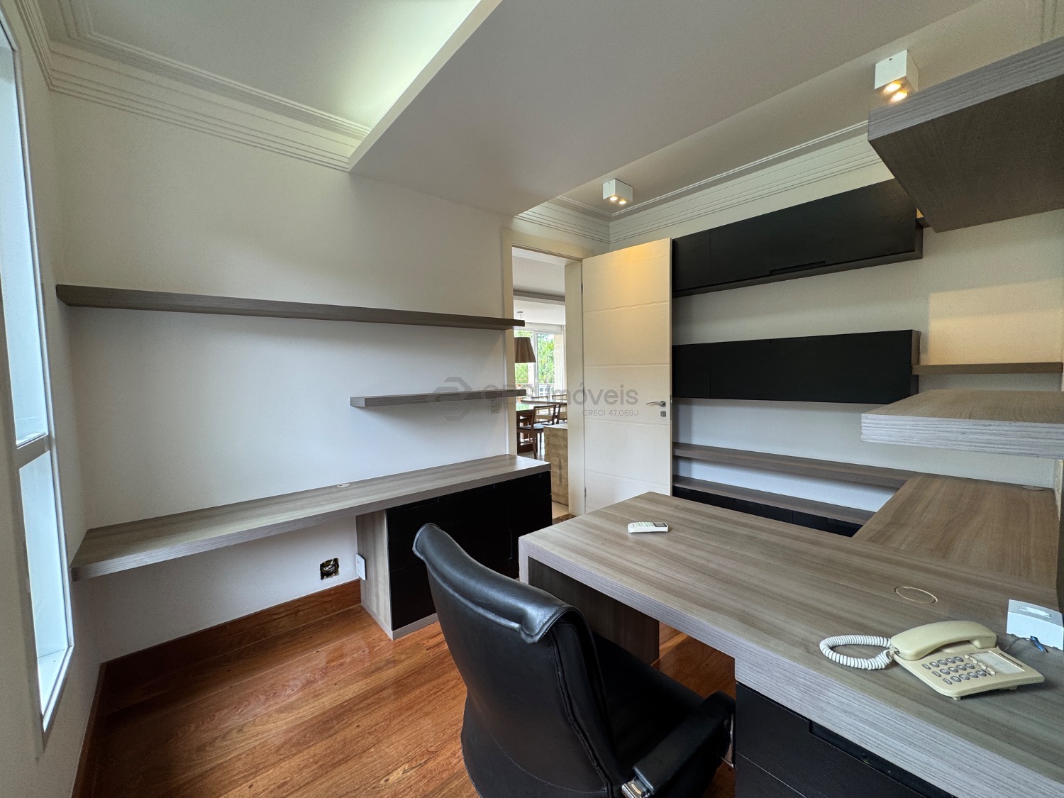 O hall de entrada imponente dá acesso a uma elegante sala de estar com pé-direito duplo, integrada à sala de jantar, que proporciona uma vista deslumbrante. Conta ainda com um sofisticado home theater automatizado, bar, escritório (reversível para suíte) e uma cozinha planejada completa, além de lavanderia, despensa e dependência de serviço.