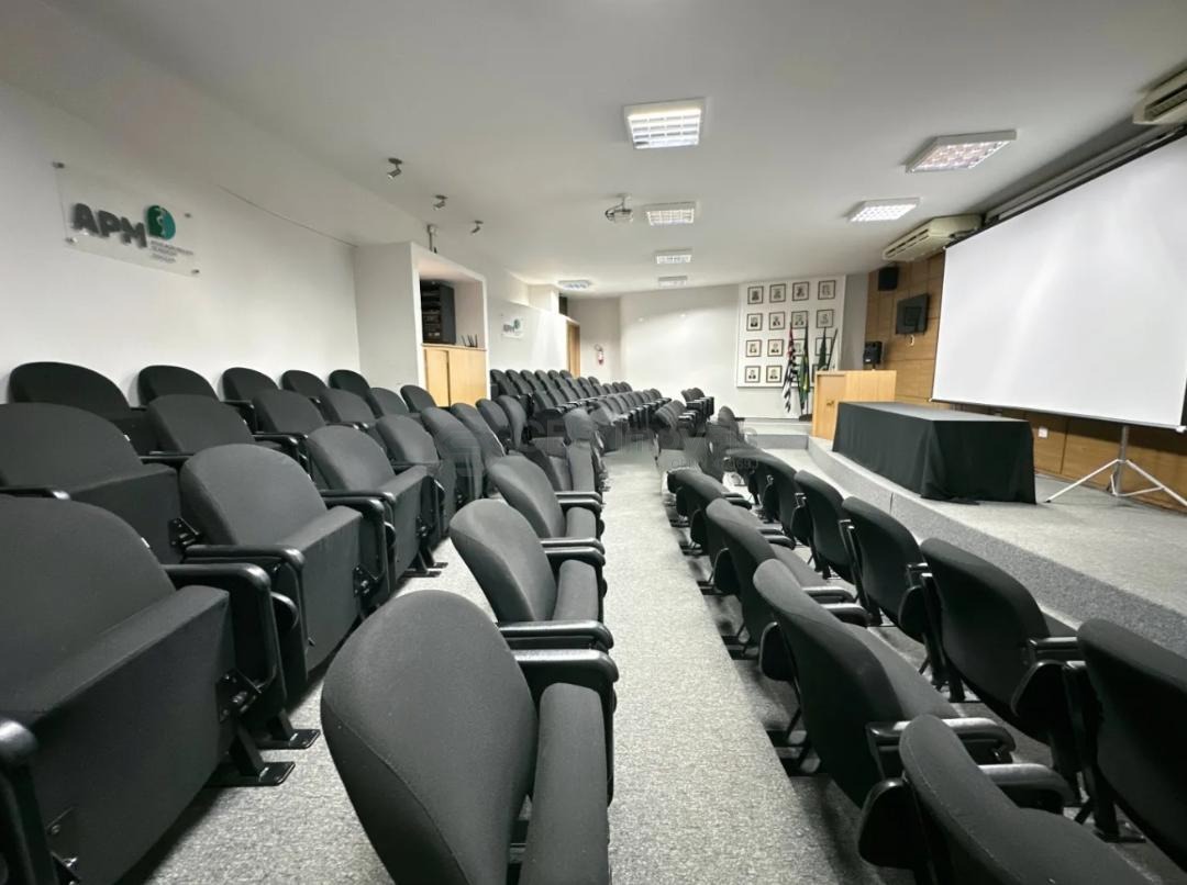 Anfiteatro com 90 lugares, climatizado, revestido em carpete e com acessibilidade para PNE