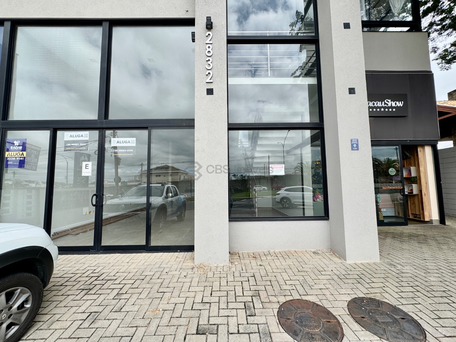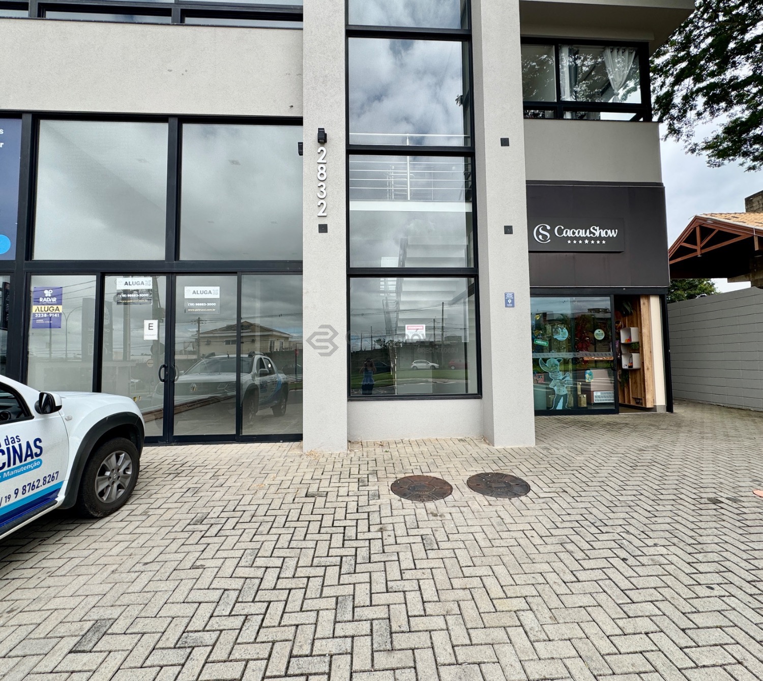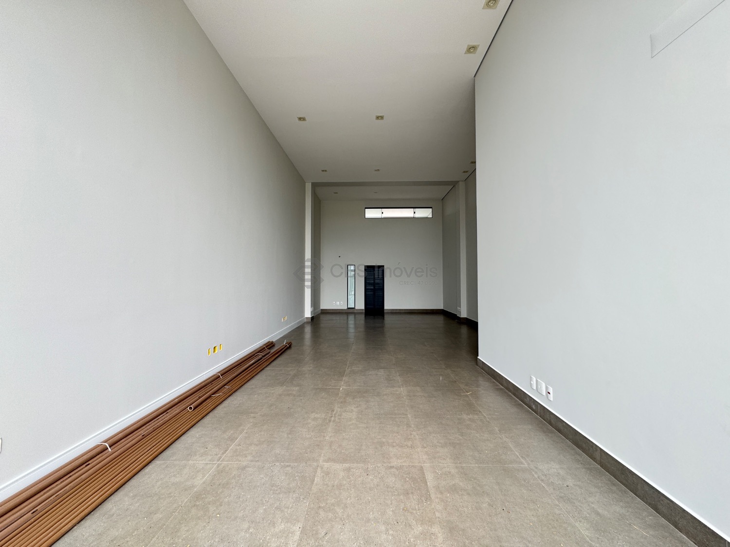 No pavimento térreo, a sala possui 82m² distribuído com uma copa e dois banheiros. A sala possui duas vagas de garagem.